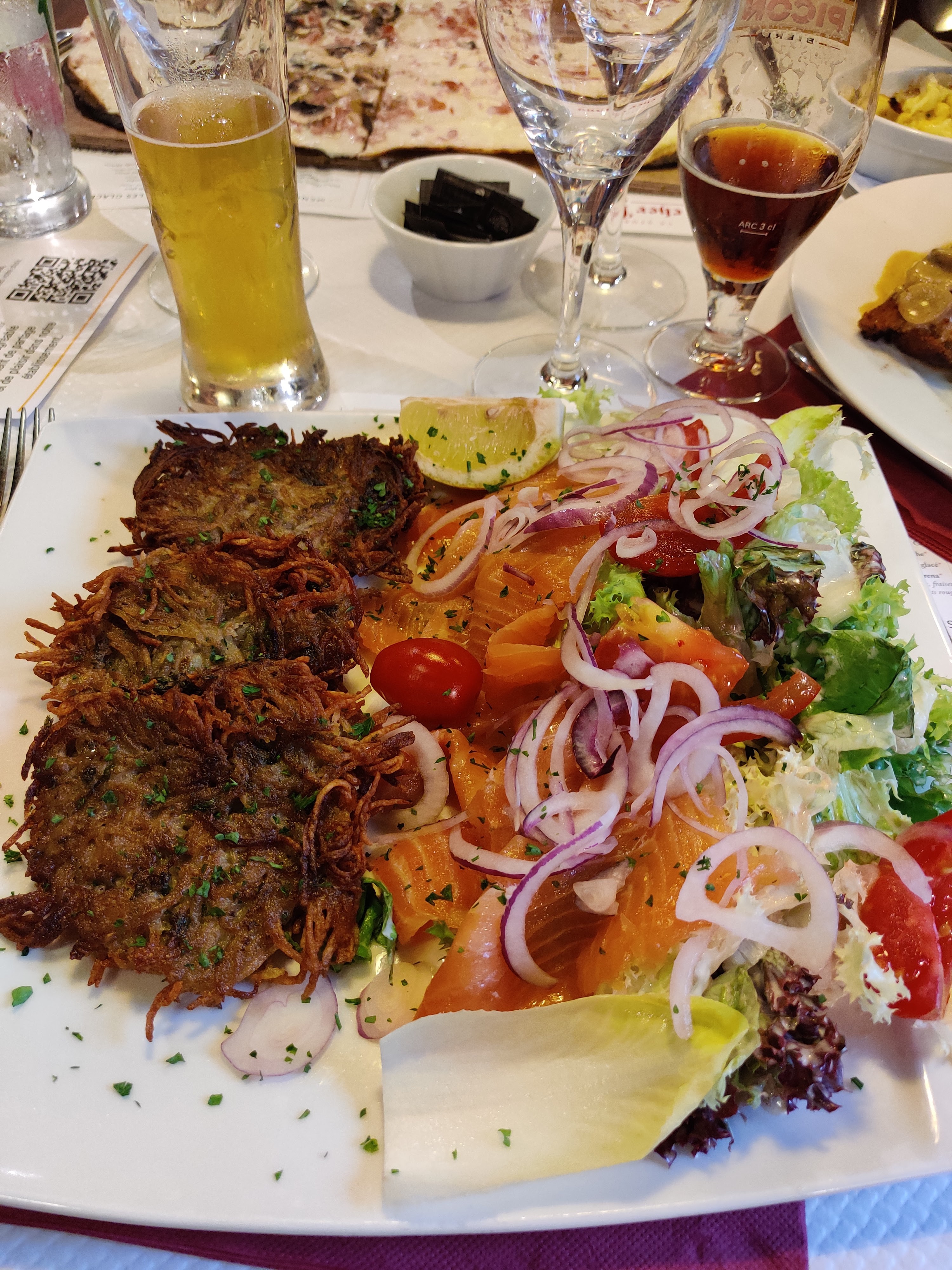 Qualité de la nourriture décevante. Les galettes de pomme de terre sentaient le rance et la tarte flambée était à peine cuite. Nous étions au deuxième service et devions attendre dans le froid à l'extérieur du restaurant un bon quart d'heure avant l'attribution d'une table.
