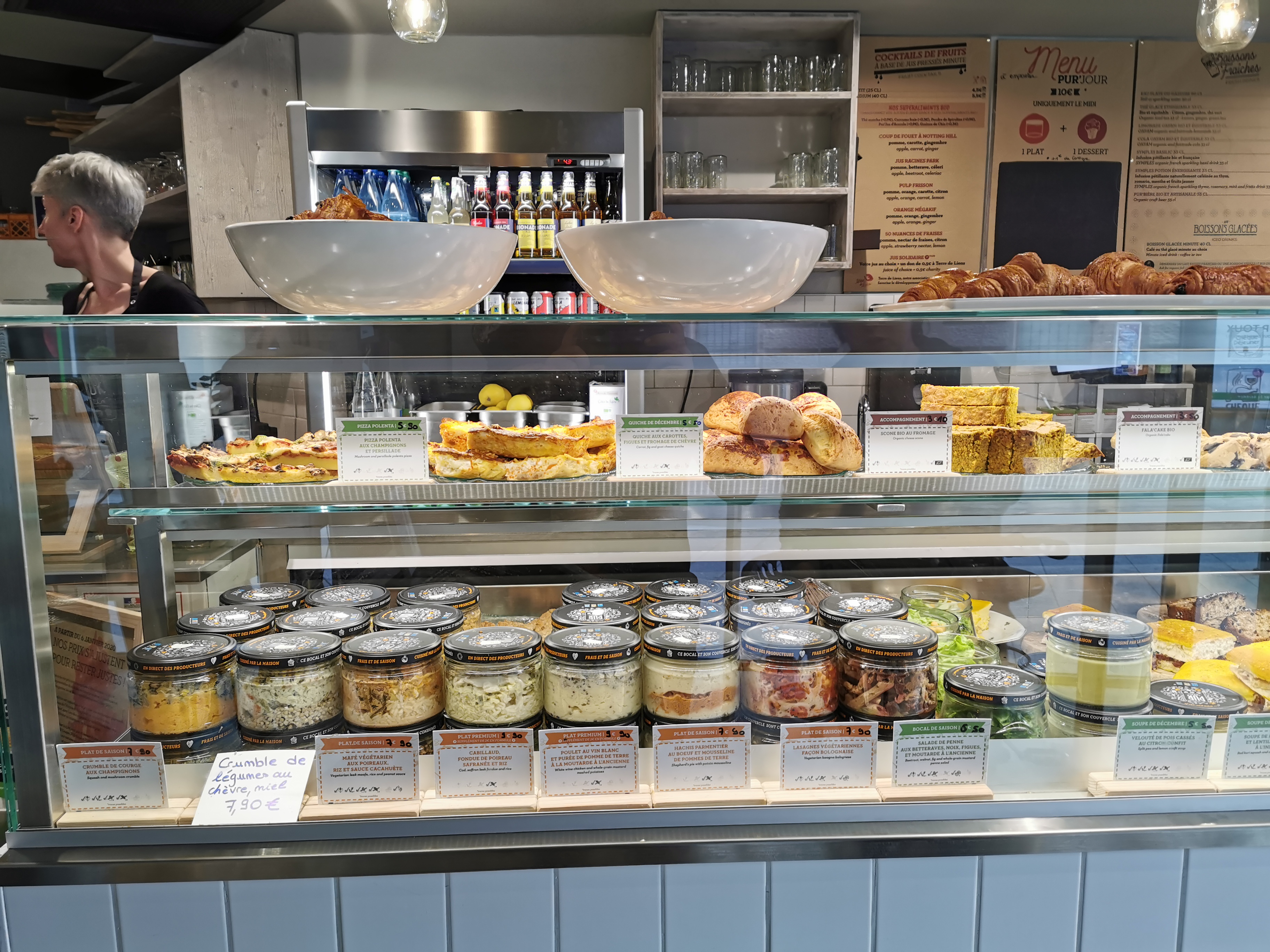 Compte-rendu de mes deux passages : le premier, commande d'un plat a emporter. Arrivée chez moi, surprise ! cest pas le bon plat. Pas grave, j'y retourne quelques temps après pour apporter la consigne du bocal et essayer de voir si un geste commercial peut être fait (il y a deux euros de difference entre ce que javais commandé et ce que j'ai recu). On me dit que si j'ai mangé le plat, rien ne peut être fait. Ok, pas grave. Je suis avec une amie, on s'installe pour manger. Pendant la (longue) attente apres commande faite, on voit les clients aller et venir au comptoir demander a ce qu'on rechauffe leurs plats. Pas tres normal quand les plats en questions sont deja prêts en bocaux et qu'il faut juste les passer au micro onde. Finalement notre commande arrive : les plats sont froids, mon dessert est agrémenté d'un peu de salade (...) et il y a une erreur sur la commande. Et cerise sur le gâteau, il manque la moitie des couverts. Eh oui! Ici service a la cool, il y a un pot rempli de couverts sur chaque table, ya qu'a piocher ! Tres bien, sauf que les pots ne sont pas re-remplis apres chaque service, et que c'est a chaque client de faire le tour des autres tables pour faire du troc de couvert avec les autres clients. Et pour finir, sur le theme de la boisson : apres avoir réclamé 2 fois une carafe d'eau, elle arrive enfin... avec un seul verre pour deux clients. En bref : l'avenir de cette chaine se deroulera sans moi
