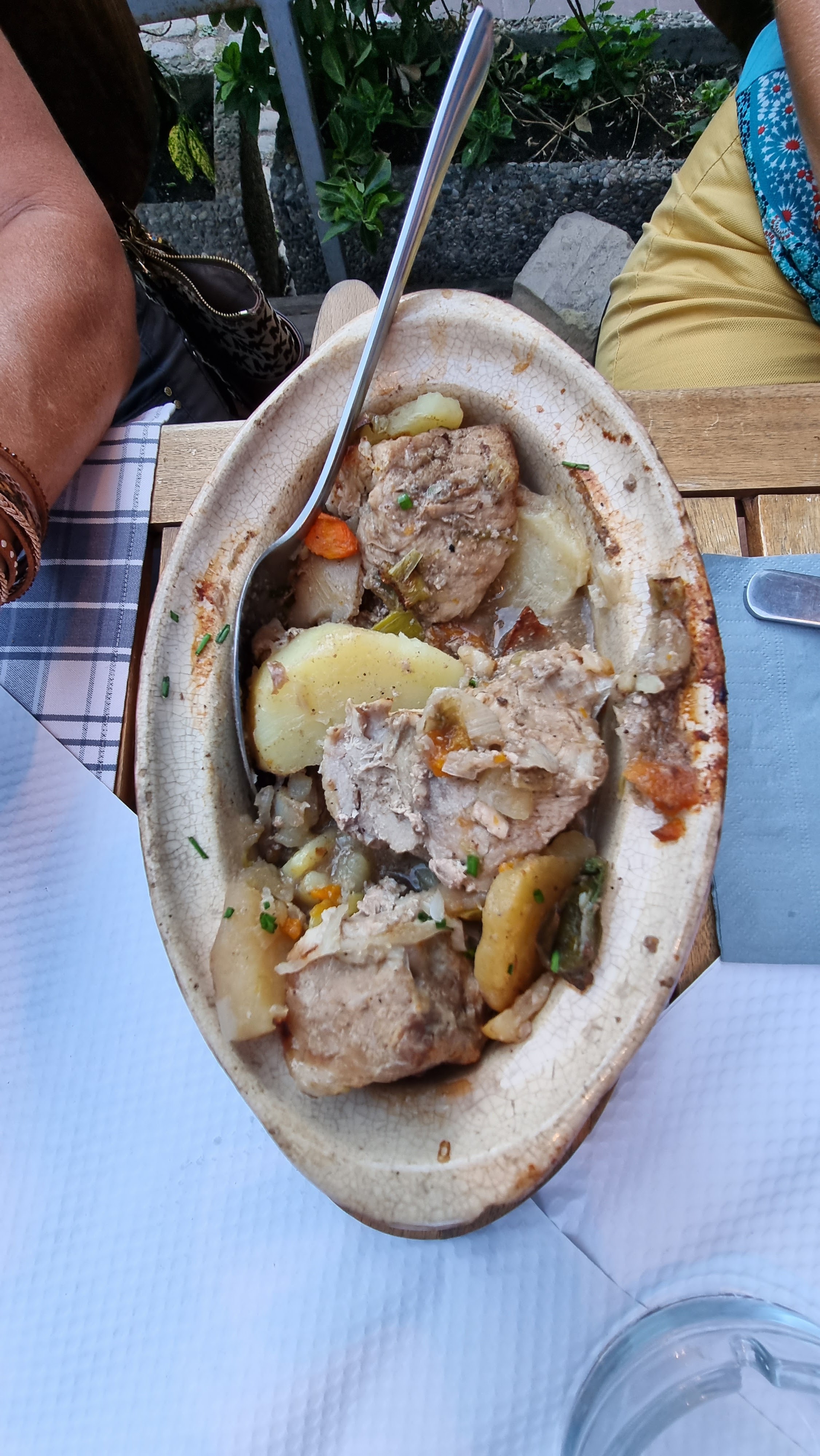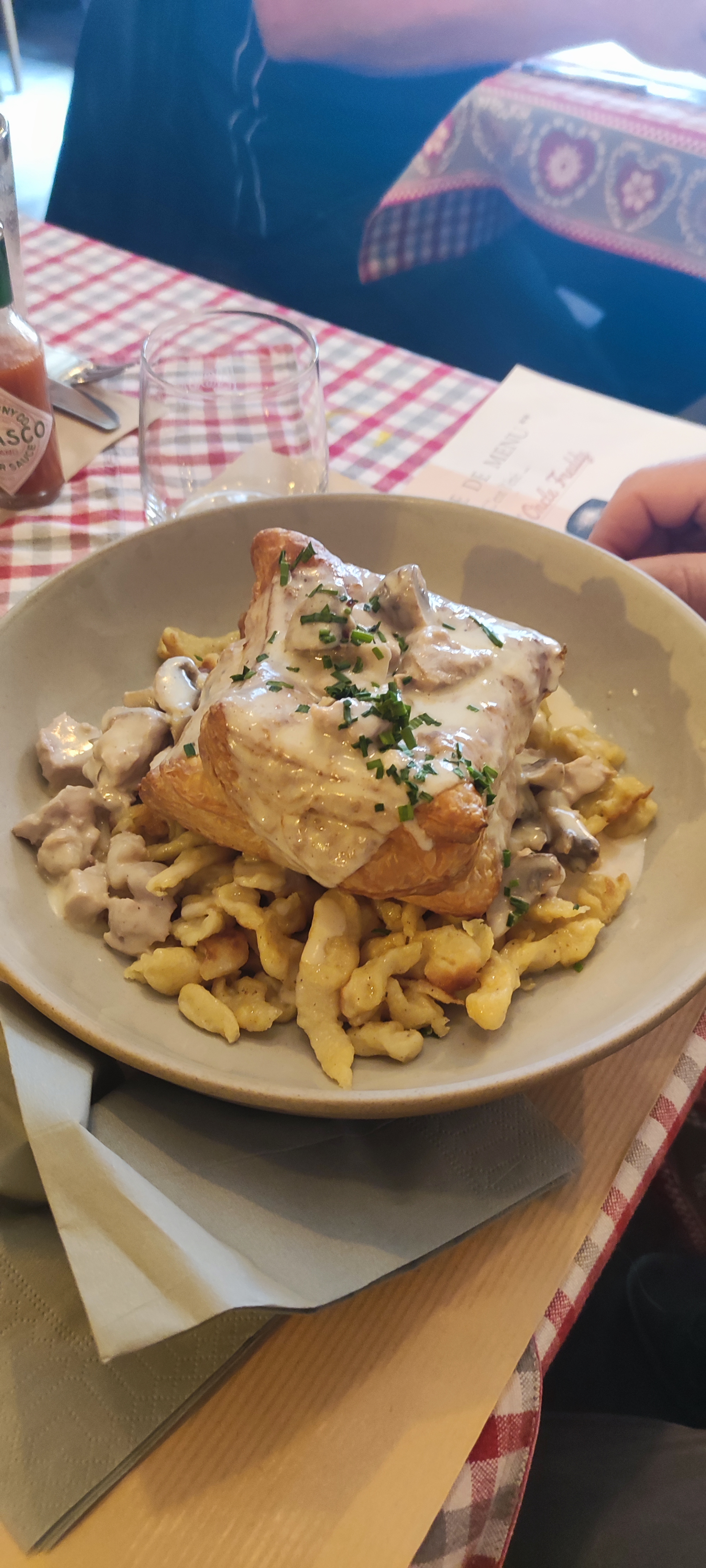 Que dire si tout était parfait ! Toutes les conditions étaient réunies pour passer un très agréable moment : une immense gentillesse de la part de la serveuse et du serveur, un cadre exceptionnel et typique alsacien et enfin des plats très goûteux ! Et pour la petite histoire, le patron m’a même offert un dessert préparé 2 minutes avant pour un groupe de touriste mais resté malheureusement sur les bras : une tarte aux quetsche maison avec sa chantilly maison. Un pur régal ! Donc allez y les yeux fermés. J’aurai passé mon meilleur moment culinaire de tout le week end ! Sur la photo : un baeckeoffe qui était divin :-)