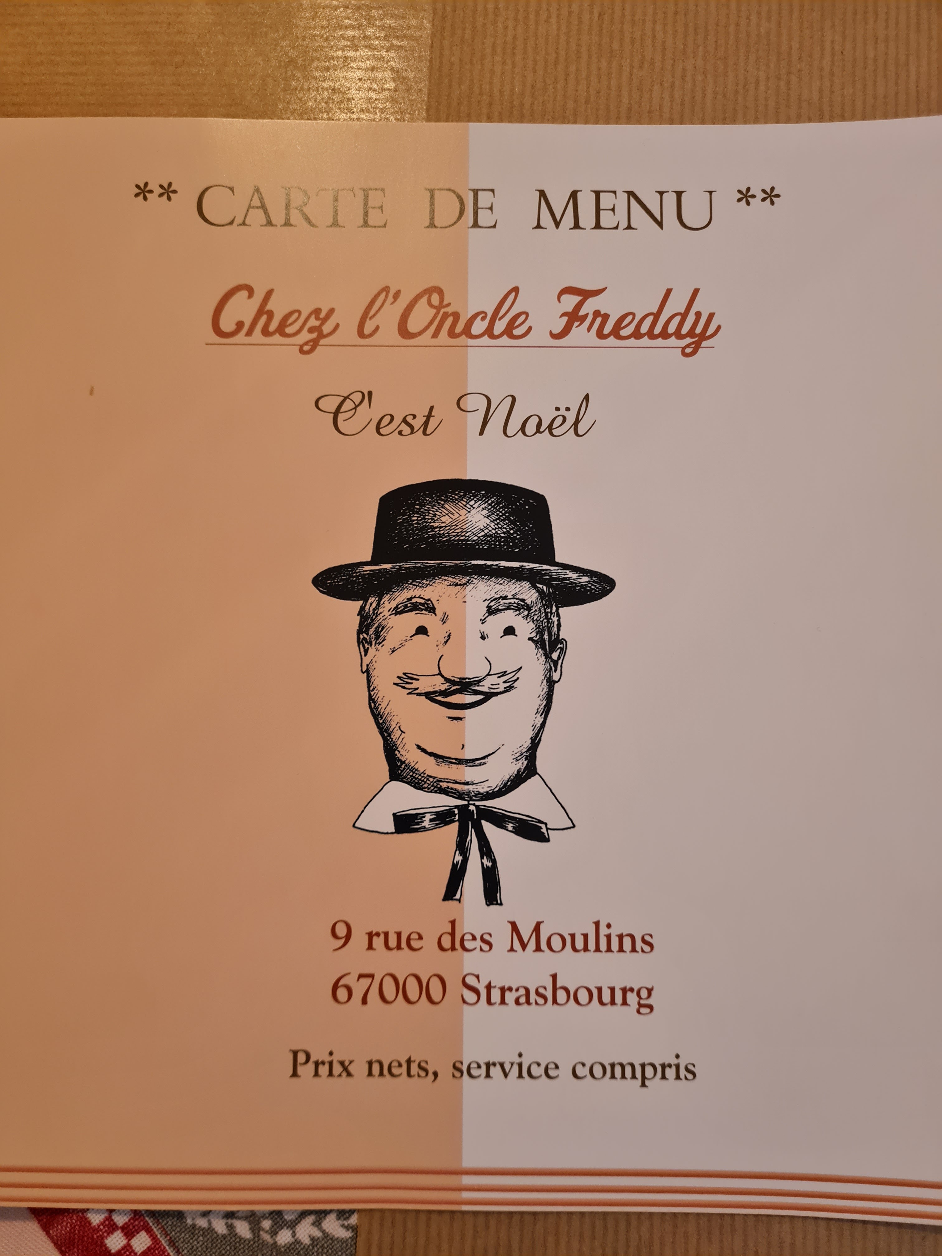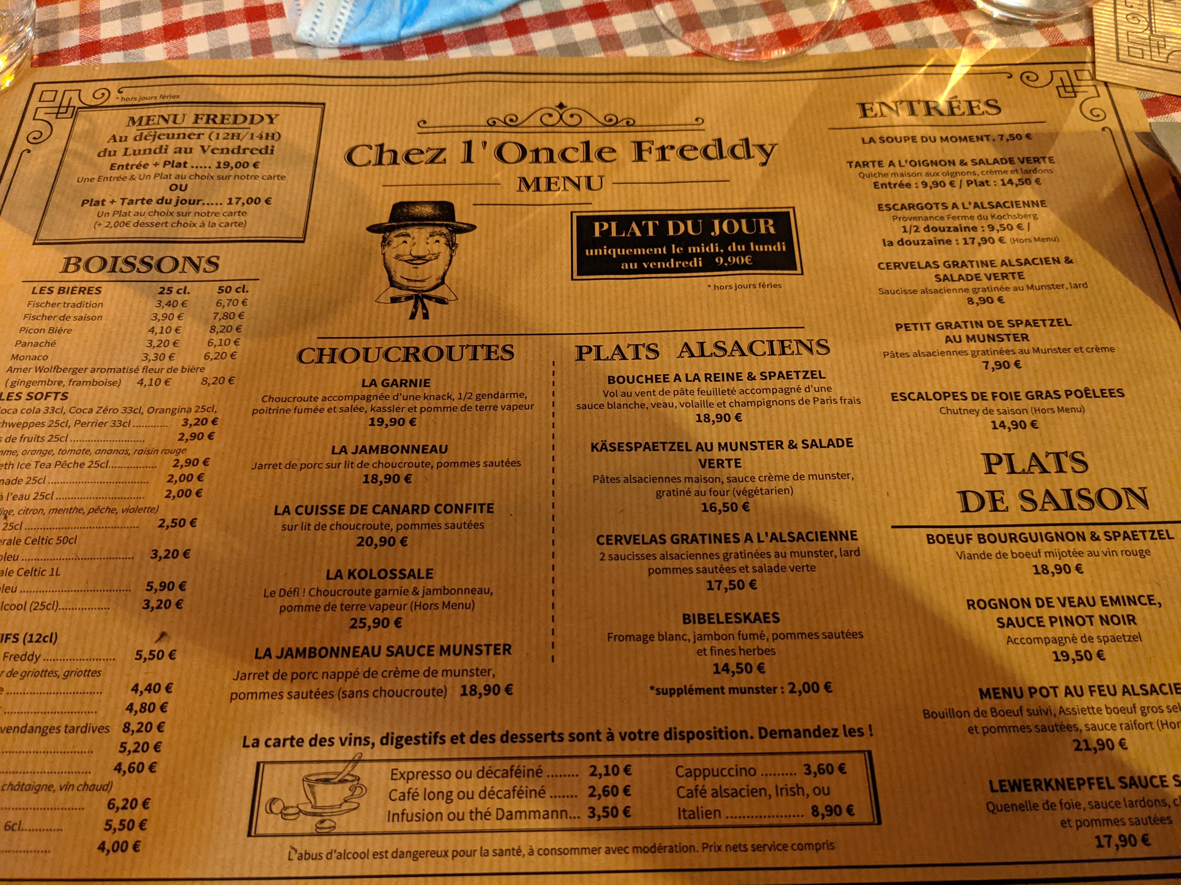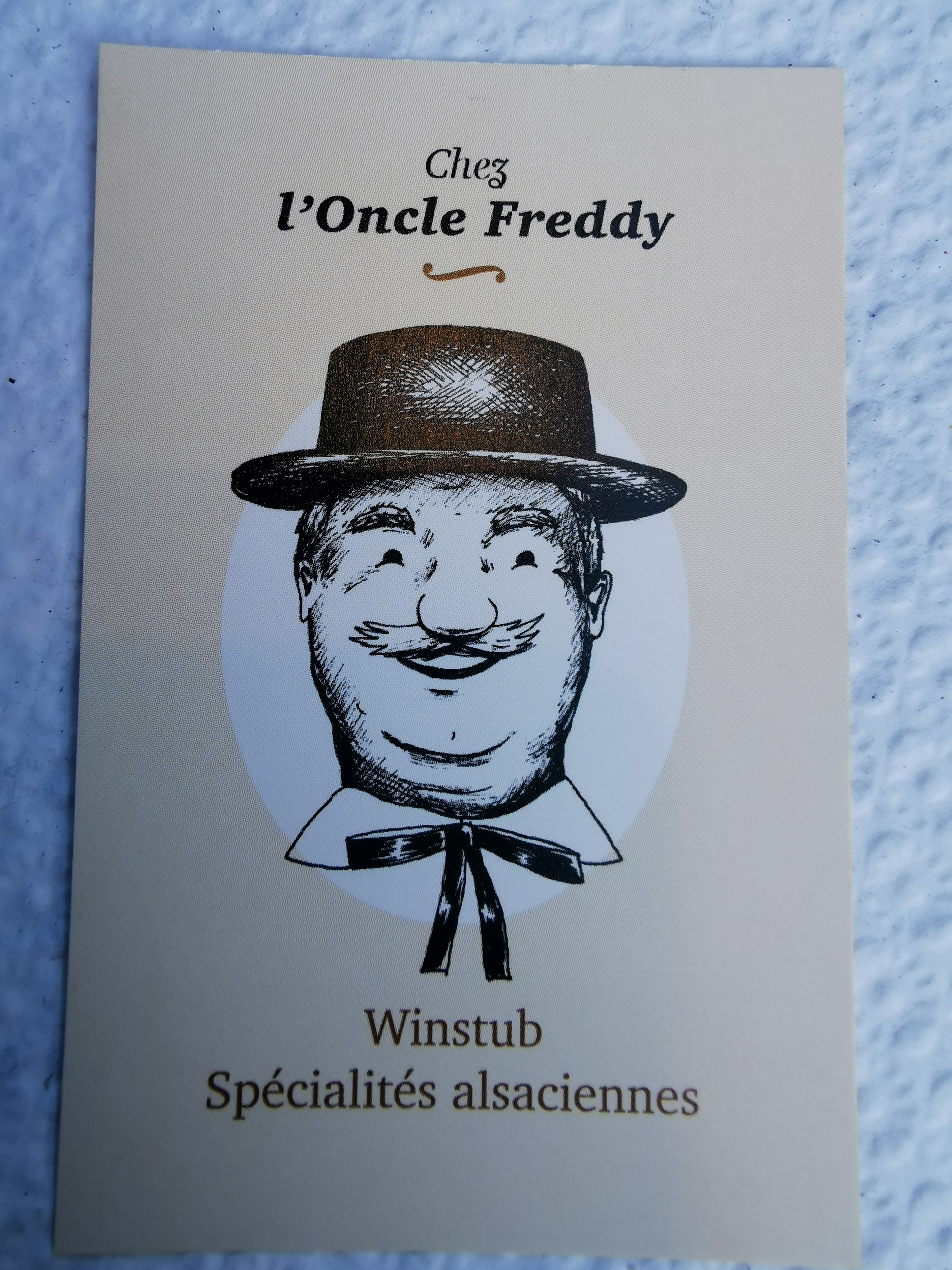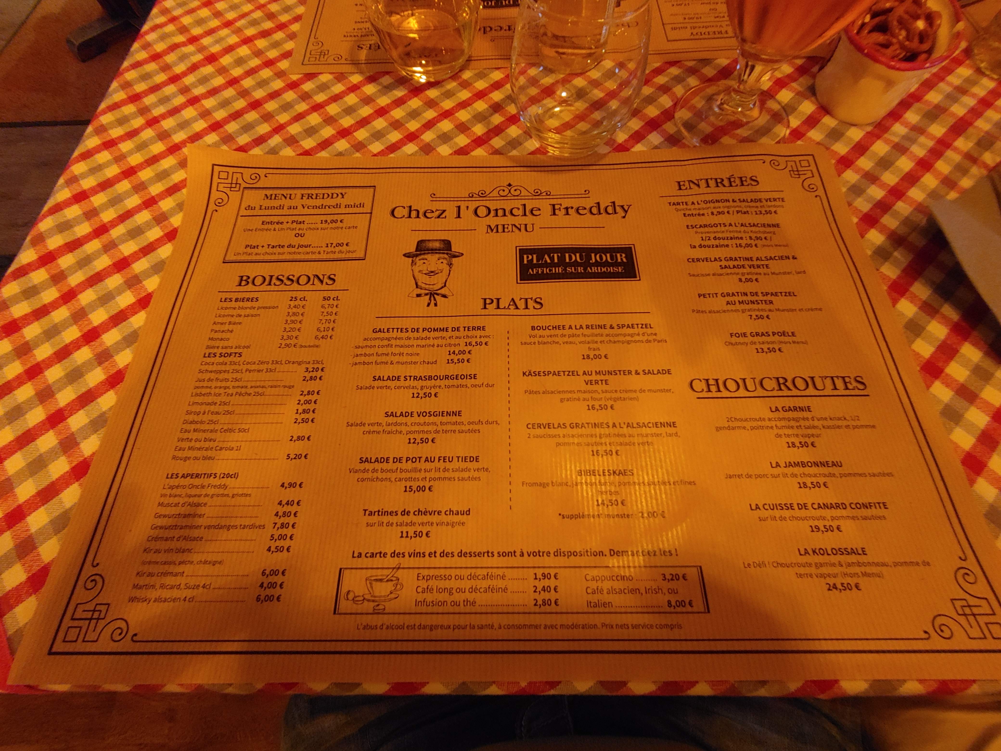 Nous sommes allés à Chez l'Oncle Freddy aussitôt que nous sommes arrivés à midi à Strasbourg. Apparement nous avons eu la chance parce que le restaurant était rempli. Nous n'avons pas réservé mais nous sommes bien accueillis très sympathiquement, le décor est cosy style alsacien. L'entrée : Tarte à oignon 9,90€ et Escargots à l'alsacienne 9,50€ sont excellents Le Plat : Suggestion du jour : Baeckeoffe 15,90€ était délicieux ! Le vin blanc (pinot gris) est bien conseillé :)