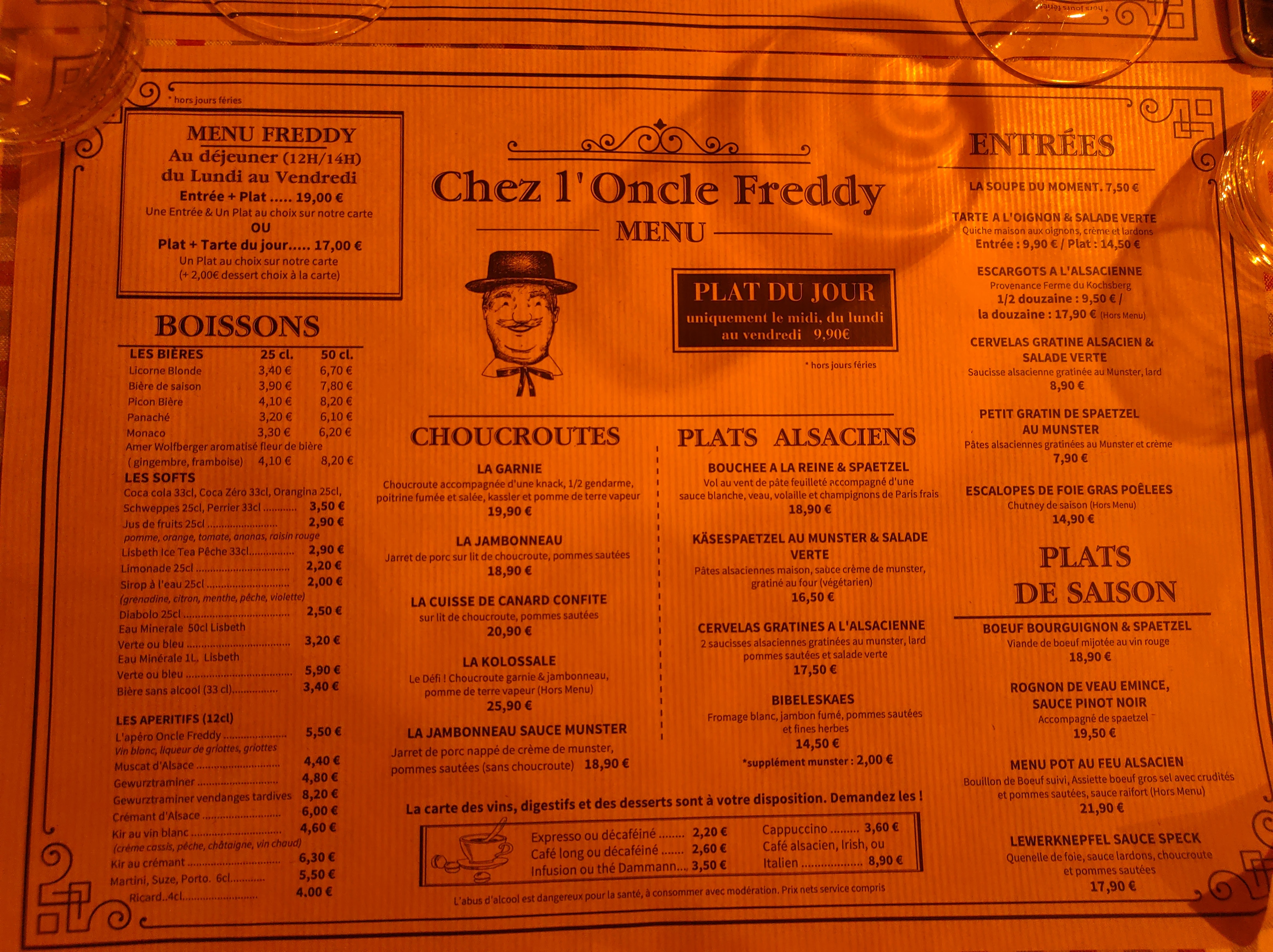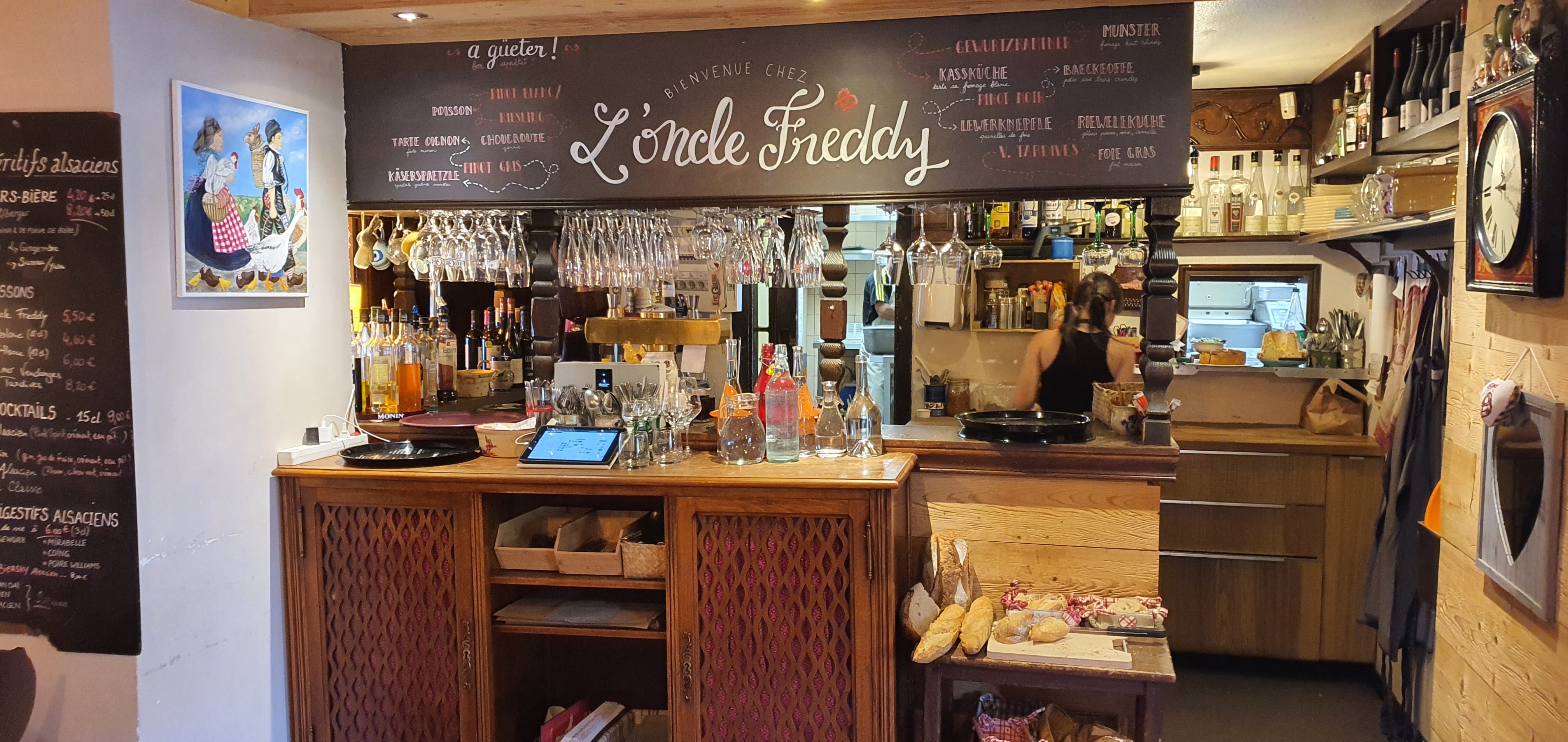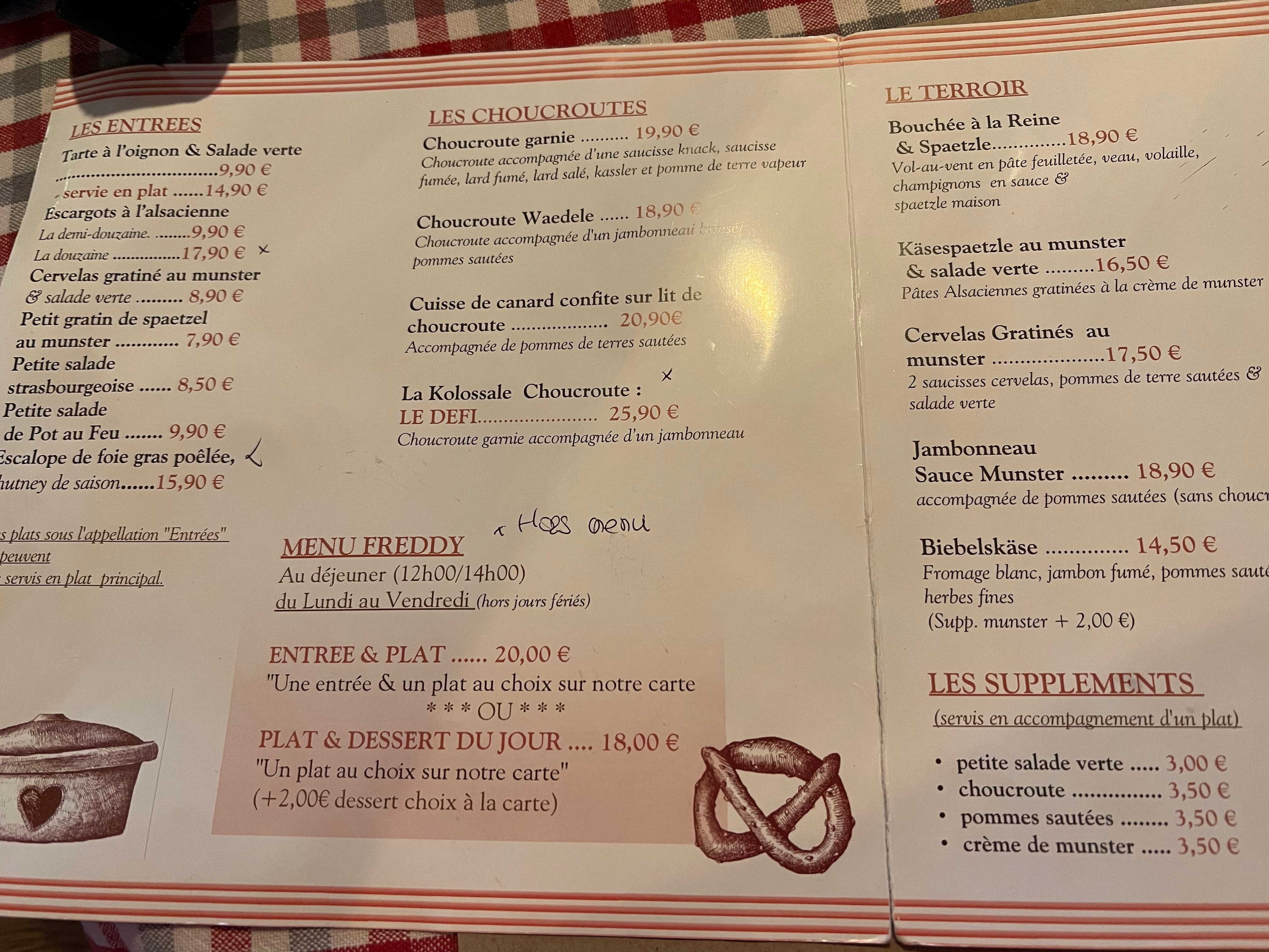 Nous sommes allés à Chez l'Oncle Freddy aussitôt que nous sommes arrivés à midi à Strasbourg. Apparement nous avons eu la chance parce que le restaurant était rempli. Nous n'avons pas réservé mais nous sommes bien accueillis très sympathiquement, le décor est cosy style alsacien. L'entrée : Tarte à oignon 9,90€ et Escargots à l'alsacienne 9,50€ sont excellents Le Plat : Suggestion du jour : Baeckeoffe 15,90€ était délicieux ! Le vin blanc (pinot gris) est bien conseillé :)