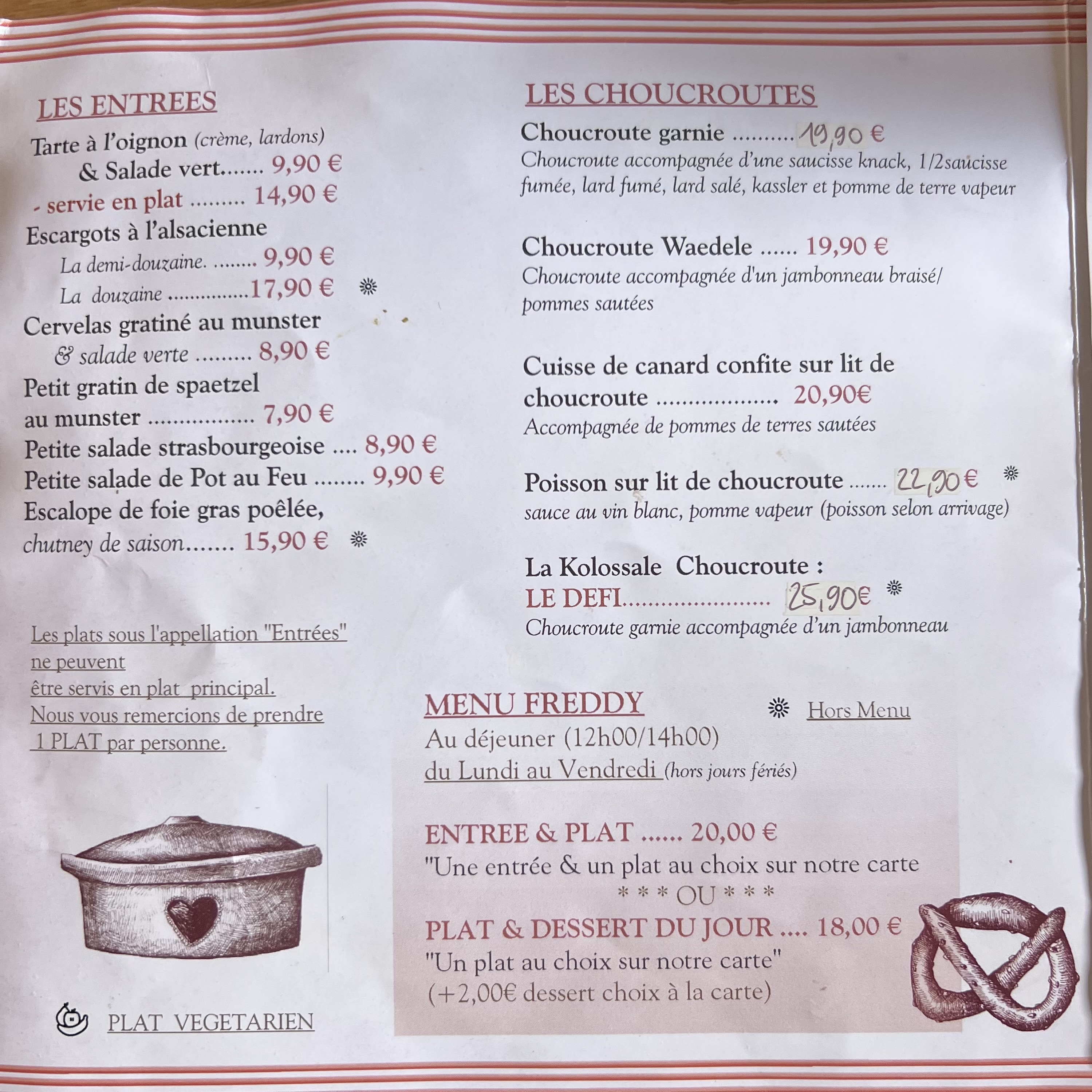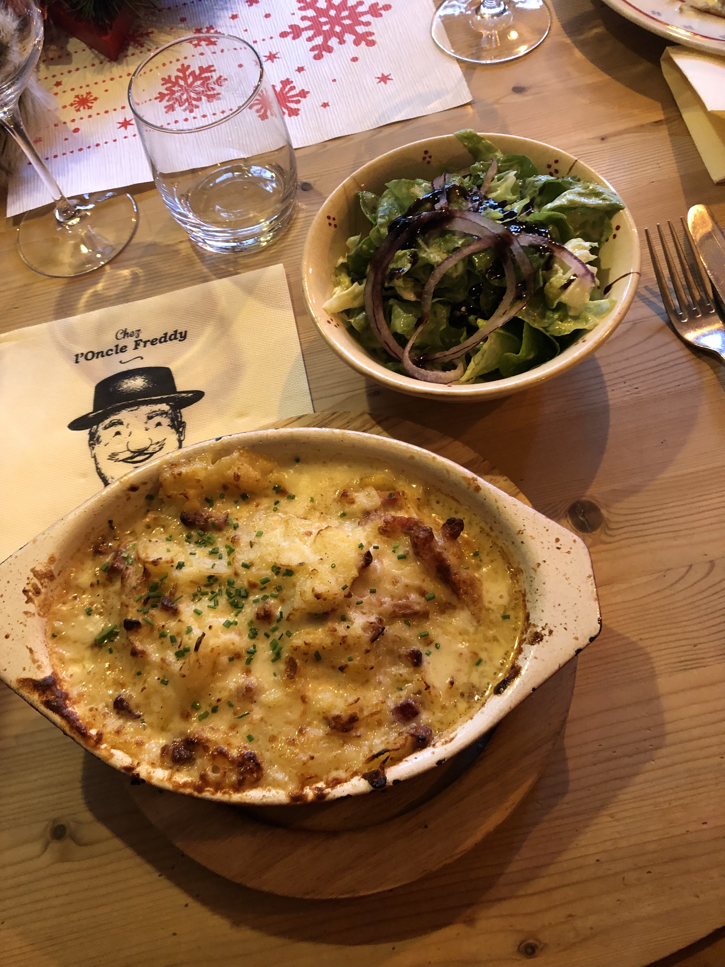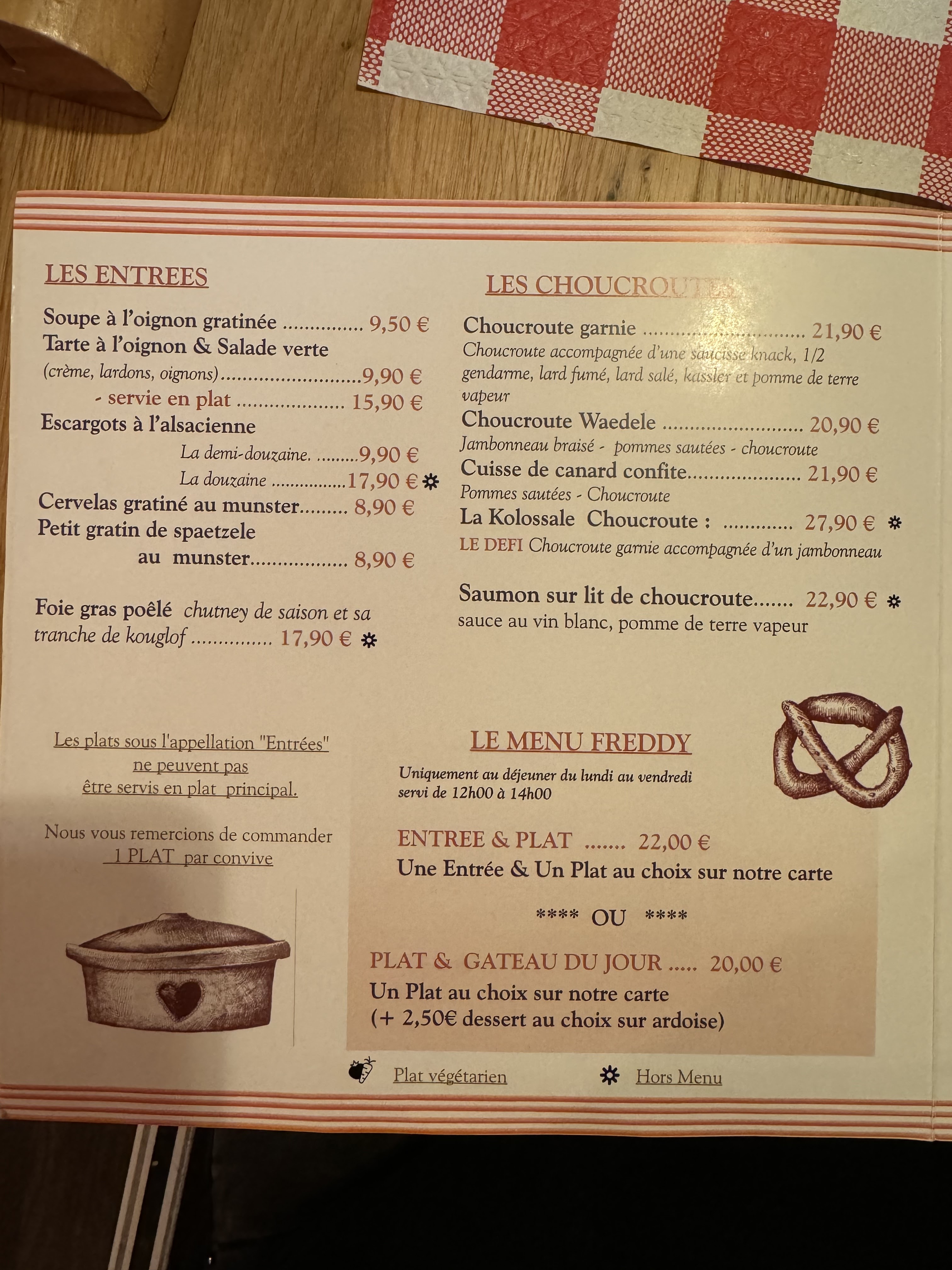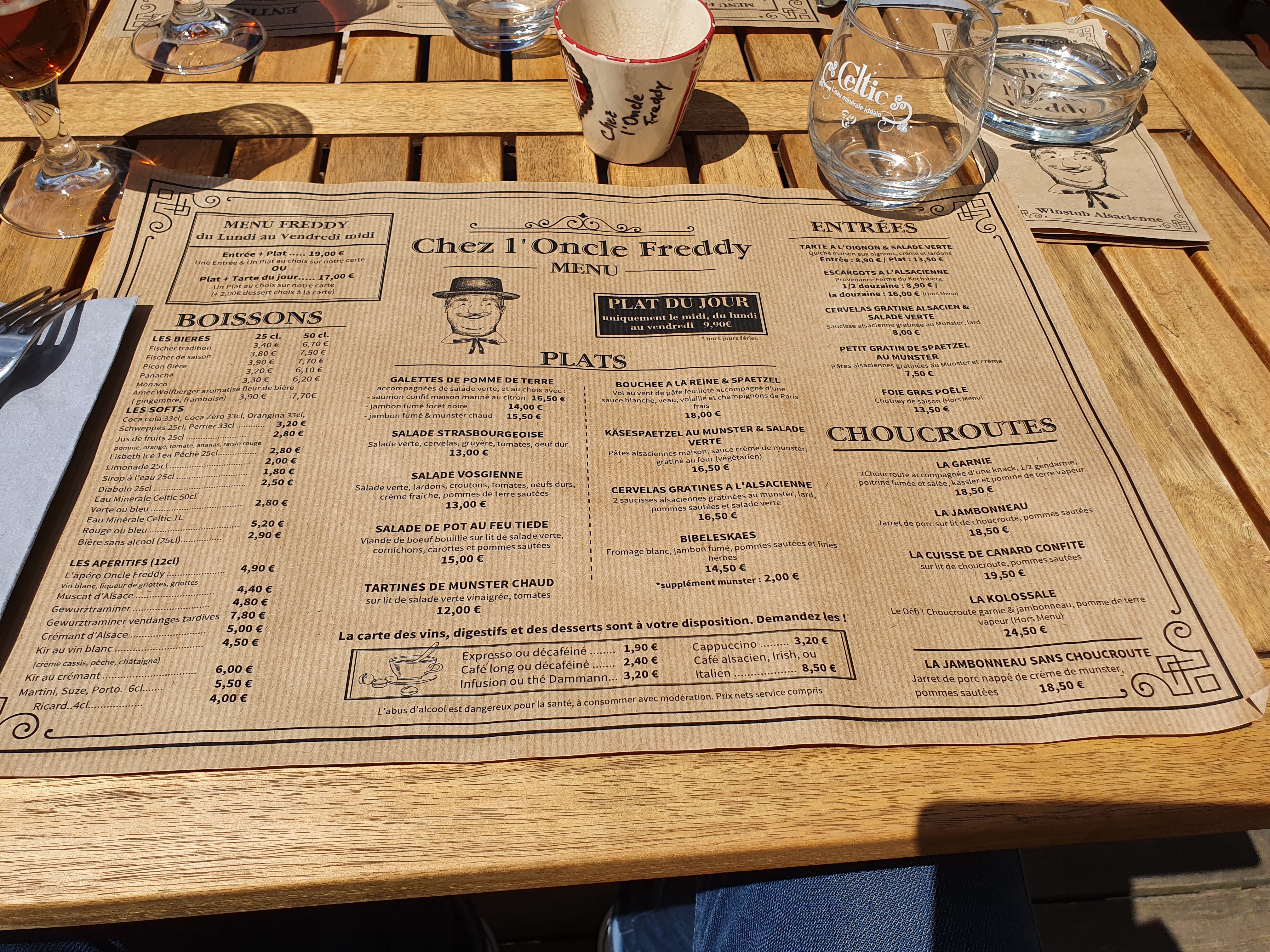 Nous sommes allés à Chez l'Oncle Freddy aussitôt que nous sommes arrivés à midi à Strasbourg. Apparement nous avons eu la chance parce que le restaurant était rempli. Nous n'avons pas réservé mais nous sommes bien accueillis très sympathiquement, le décor est cosy style alsacien. L'entrée : Tarte à oignon 9,90€ et Escargots à l'alsacienne 9,50€ sont excellents Le Plat : Suggestion du jour : Baeckeoffe 15,90€ était délicieux ! Le vin blanc (pinot gris) est bien conseillé :)