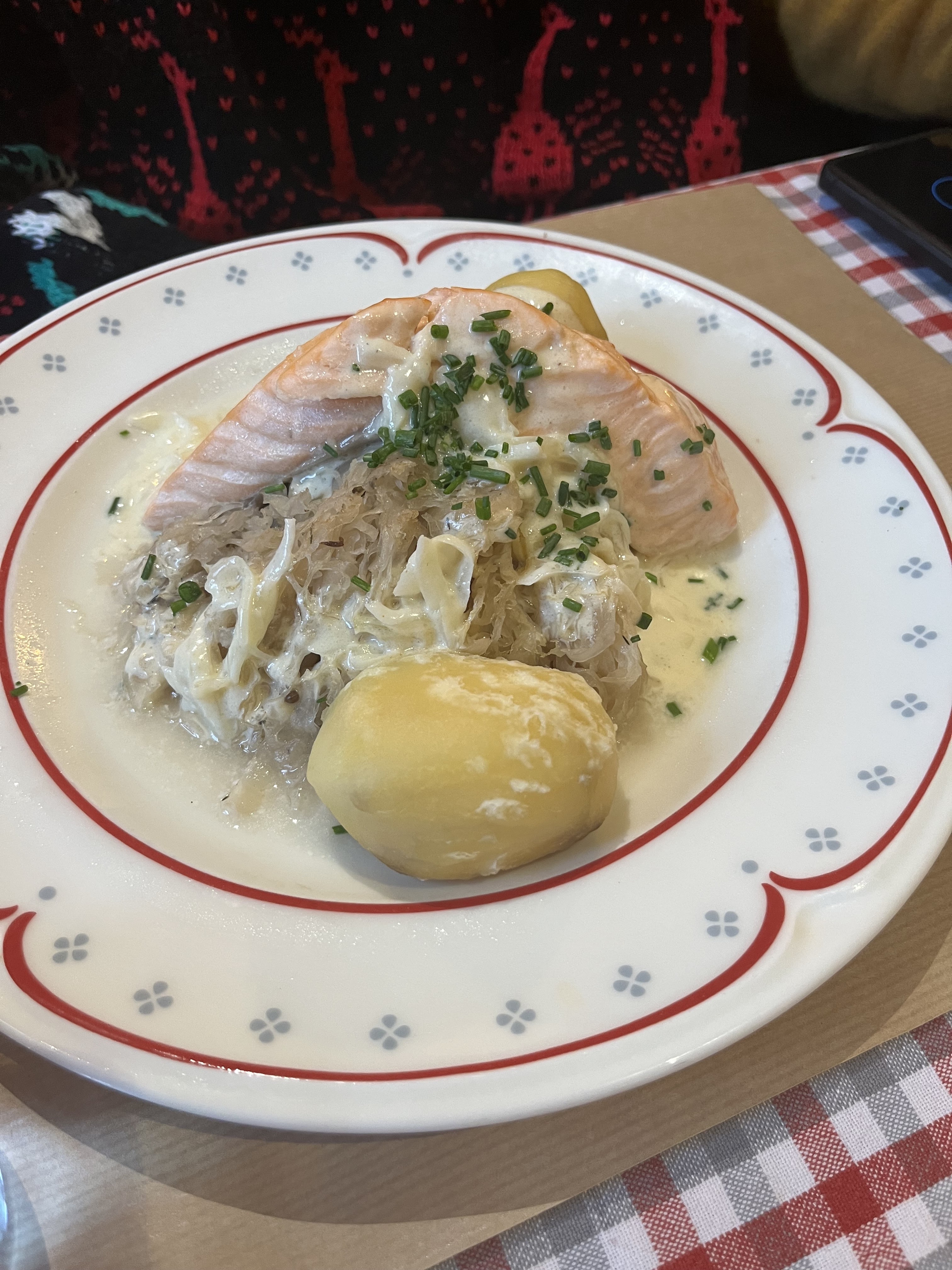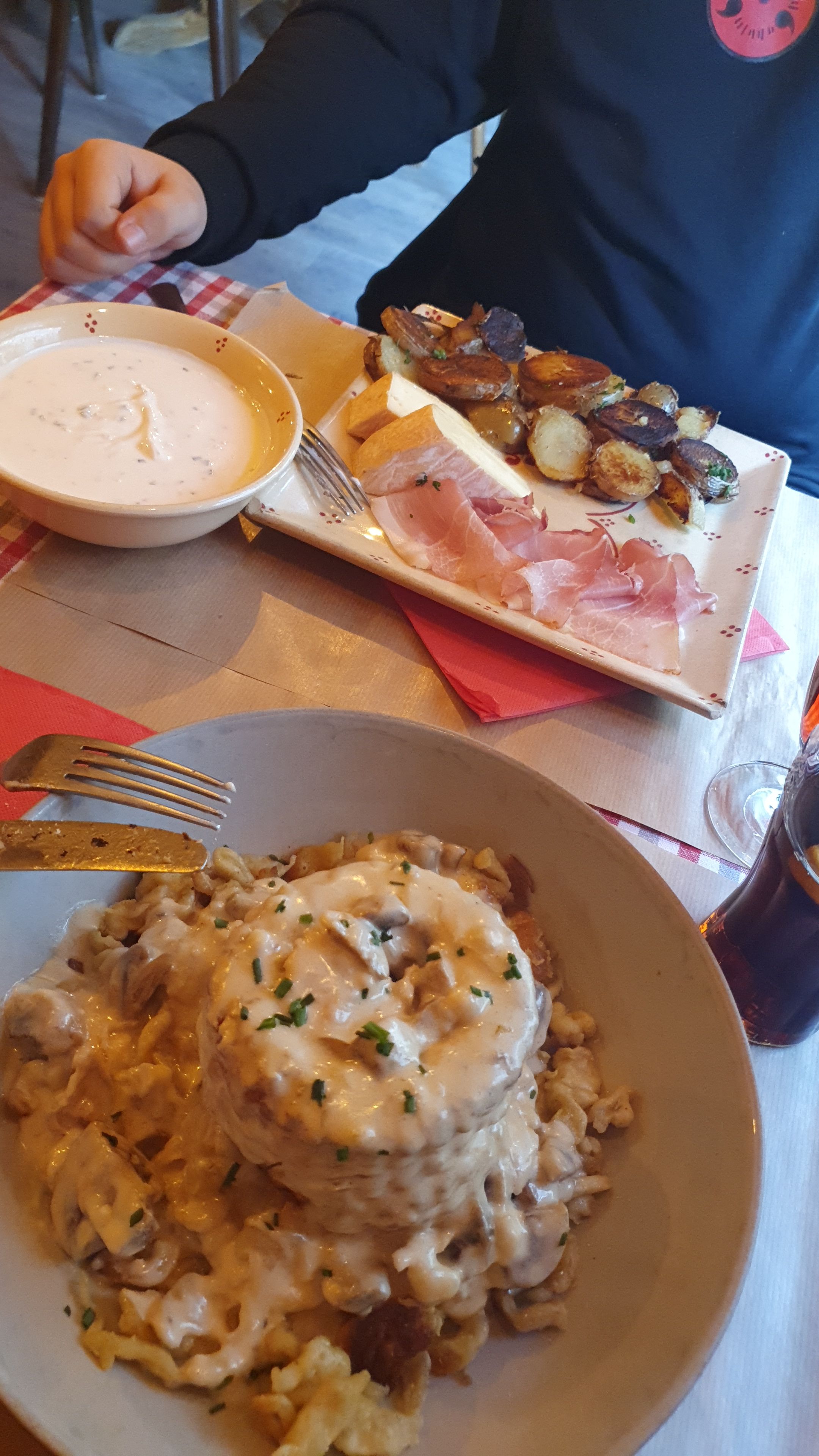 Choucroute top, un peu plus de pomme de terre serait pas mal. Les pates au munster pas exceptionnelles. Super endroit charmant, excellente cuisine. Tout le monde appréciait leur repas à coté de nous. Belle vue de la fenetre!