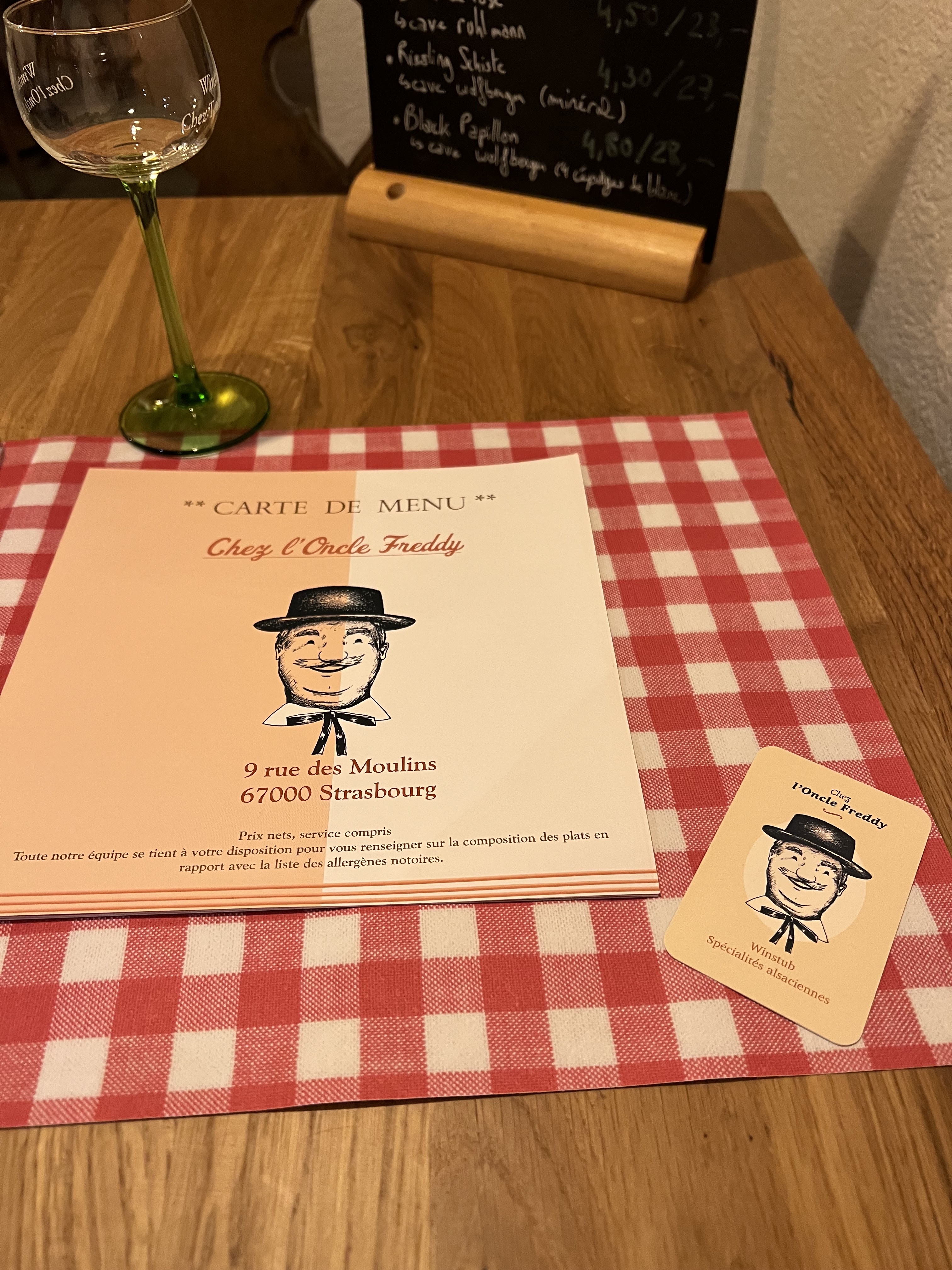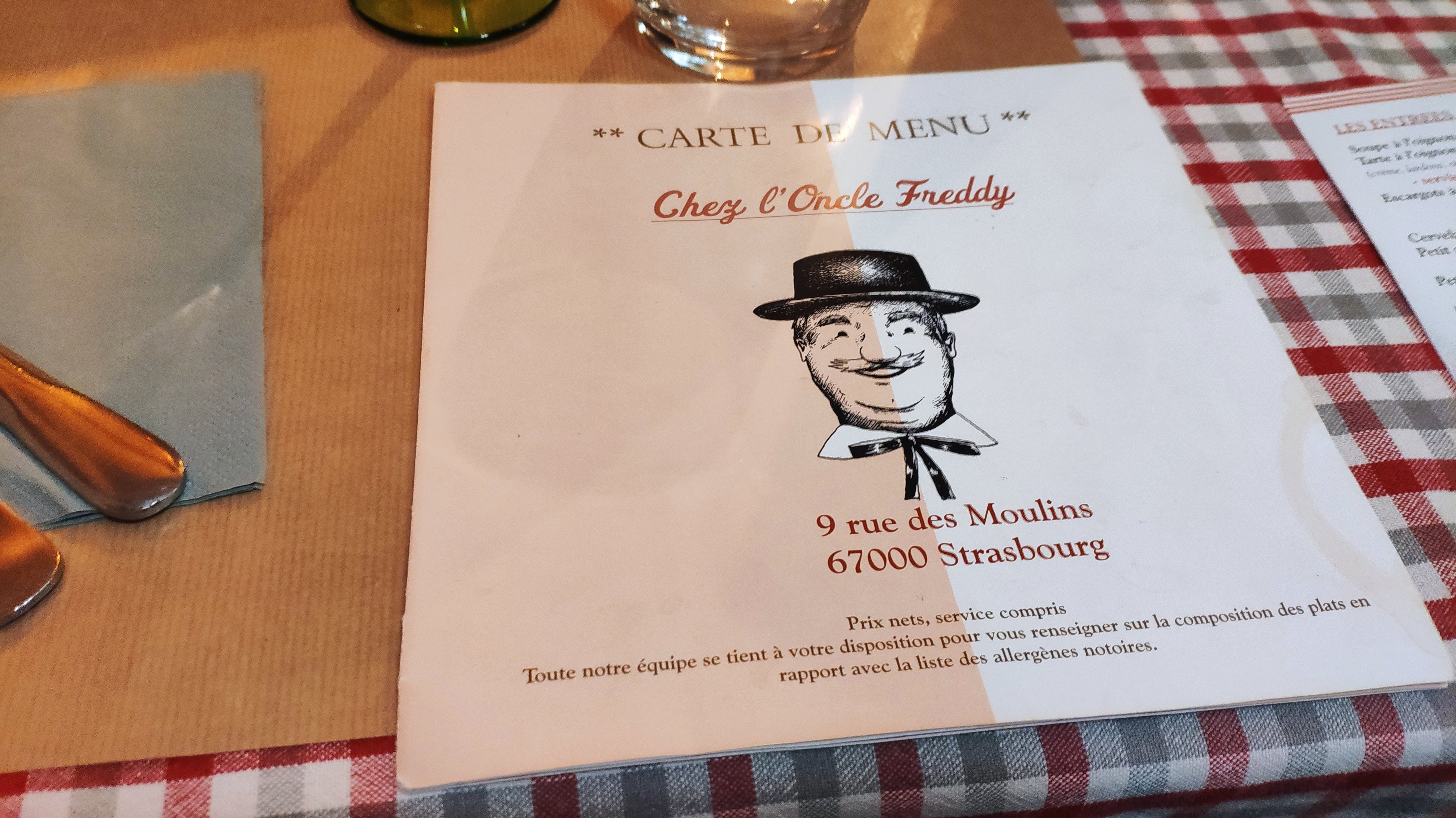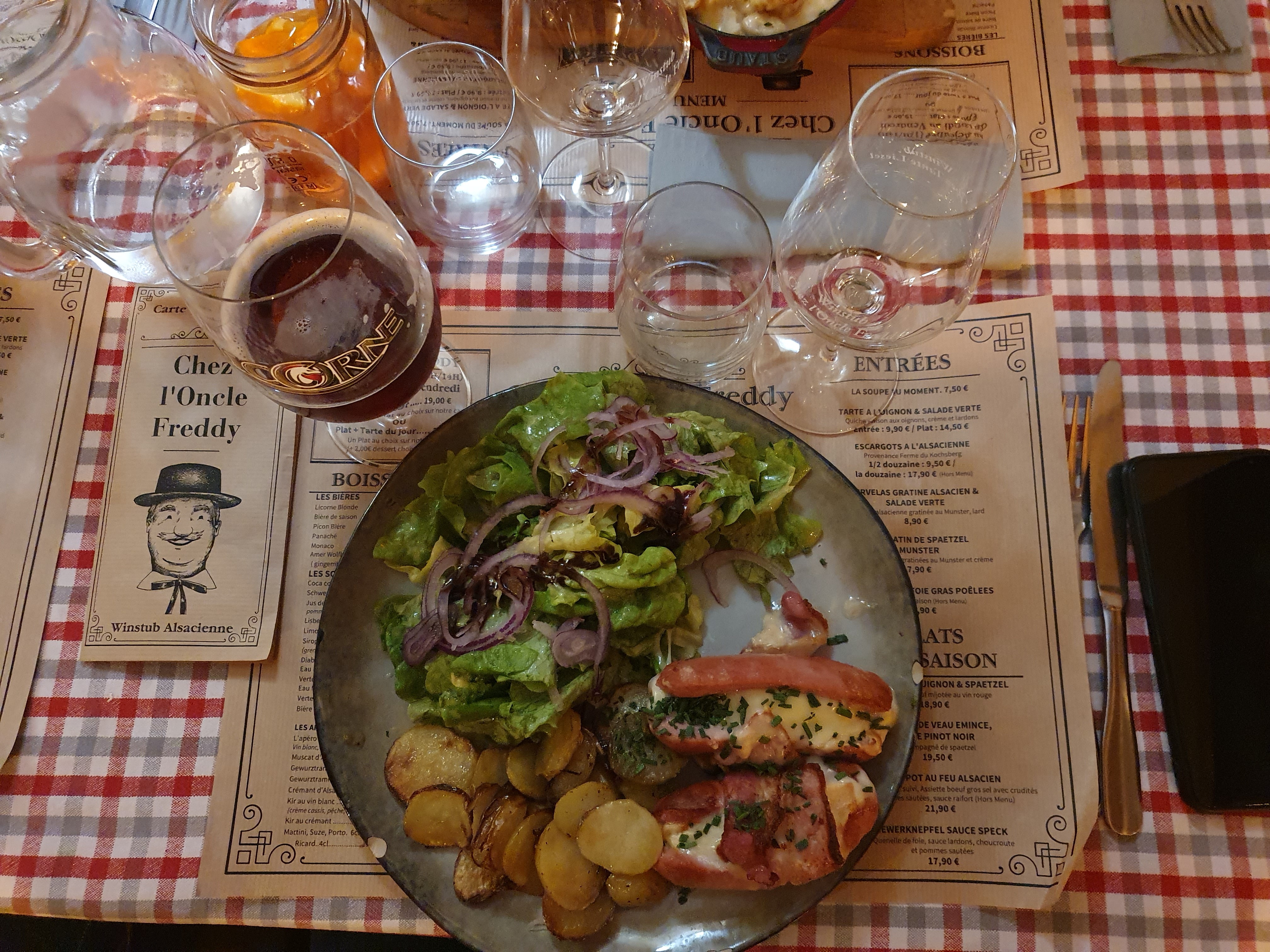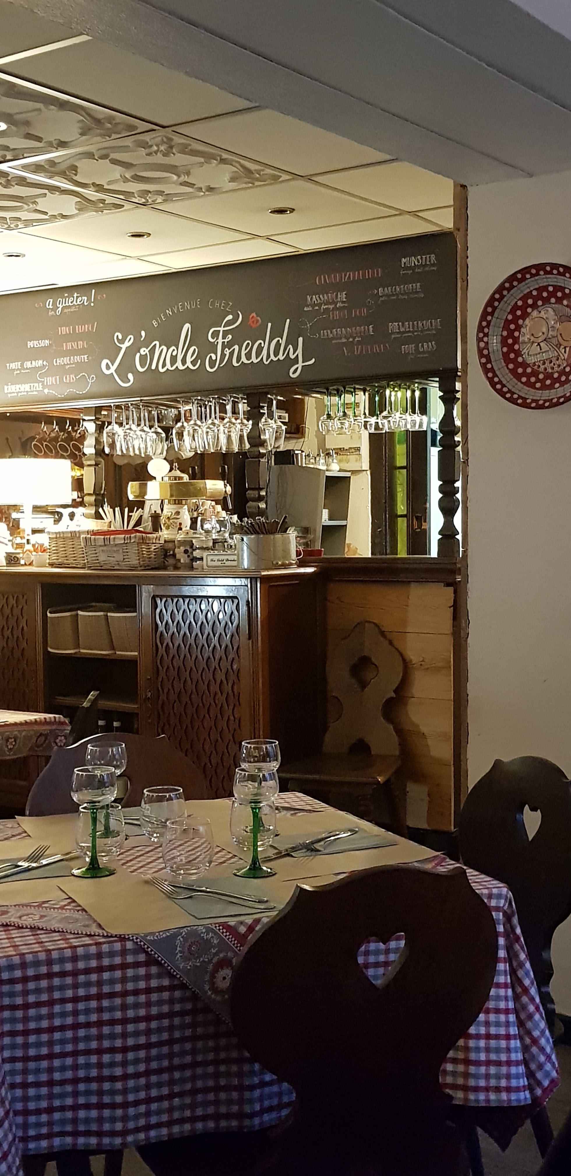 Chez l'oncle Freddy lors de notre passage hier soir, c'était un accueil chaleureux par des personnes professionnelles, des bons plats de la région dans une décoration alsacienne. Que demandez de mieux pour un restaurant d'Alsace en ville de Strasbourg ? Ah oui... de mieux : restaurant qui se situe dans la Petite France, magnifique endroit de la ville colorée. N'hésitez pas, c'était très bon. Bon conseil sur les choix de vins d'Alsace en fonction de ce qu'on a mangé. À très vite! Excusez mes photos qui sont pas très belles.