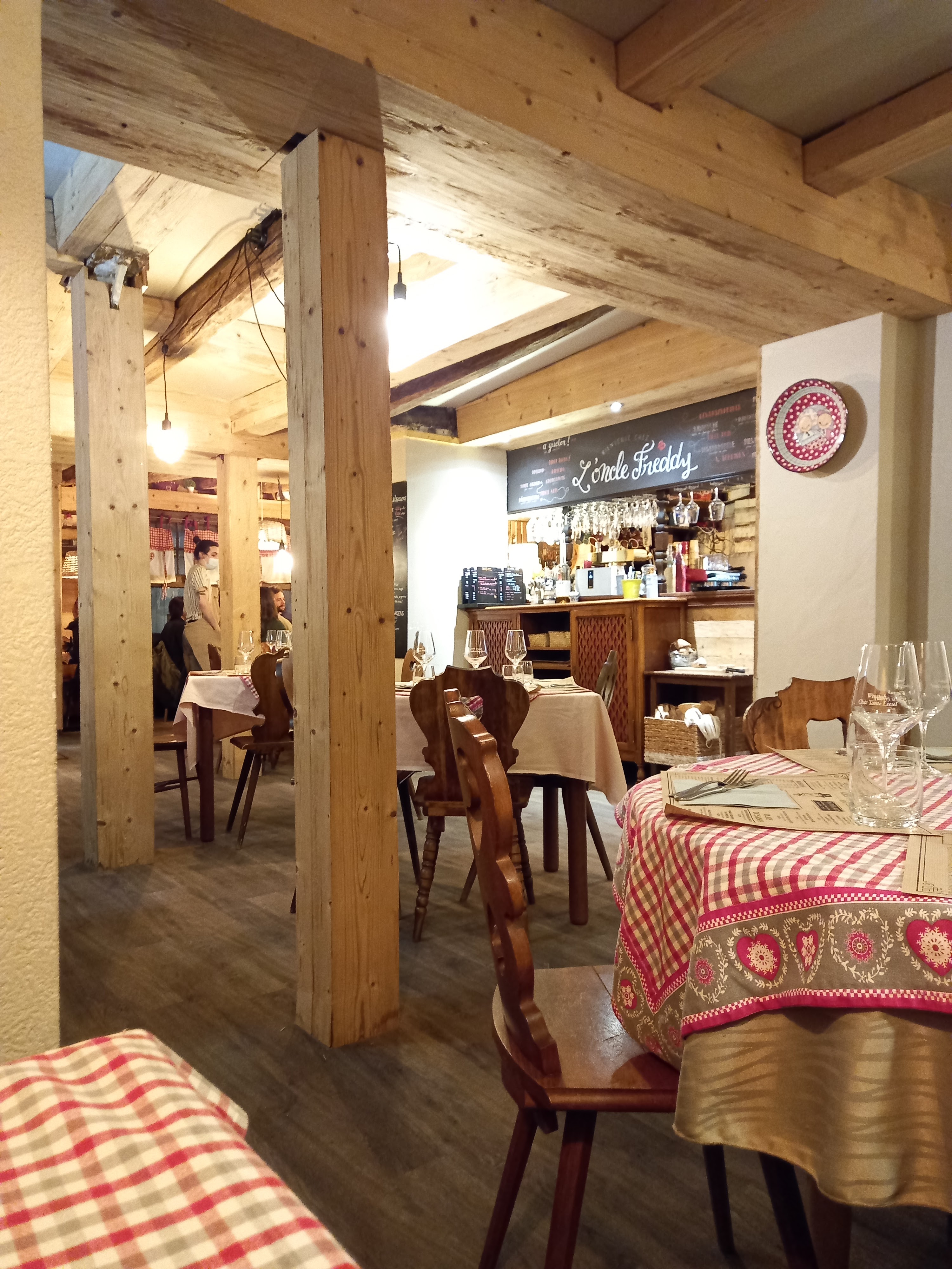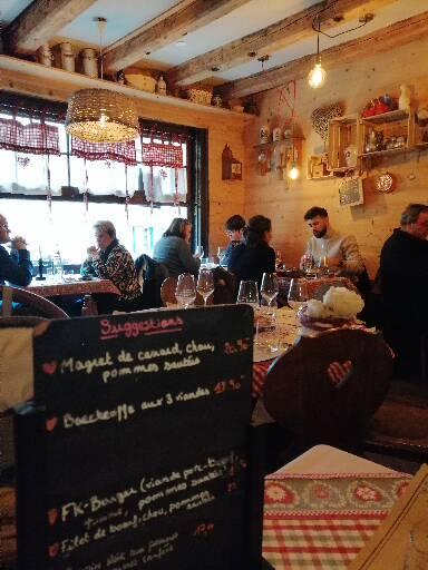 La nourriture est tres bonne L'équipe très sympa Le cadre génial tres cosy. En revanche j'enlève 2 etoiles pour la porte d'entrée, nous etions en bas du restaurant, la porte a été ouverte, je pense, 60 fois pendant notre diner, par des gens qui viennent demander si il y a de la place et qui repartent car c'est complet, les groupes de 6 personnes qui attendent en file indienne dans l'entrée la porte grande ouverte laissant le frois glacial s'engouffrer dans le restaurant ! Il fait -10 degrés ce soir, je suis frigorifié, les courants d'air étaient présents toute la soirée sous notre table. Solution : installez un rideau à l'entrée, ou installez un panneau '' complet'' à l' entrée pour eviter les allez et venus inutiles qui nuisent au confort de votre clientèle. A part ca tout etait super jusqu'au dessert merci à l'oncle Freddy.