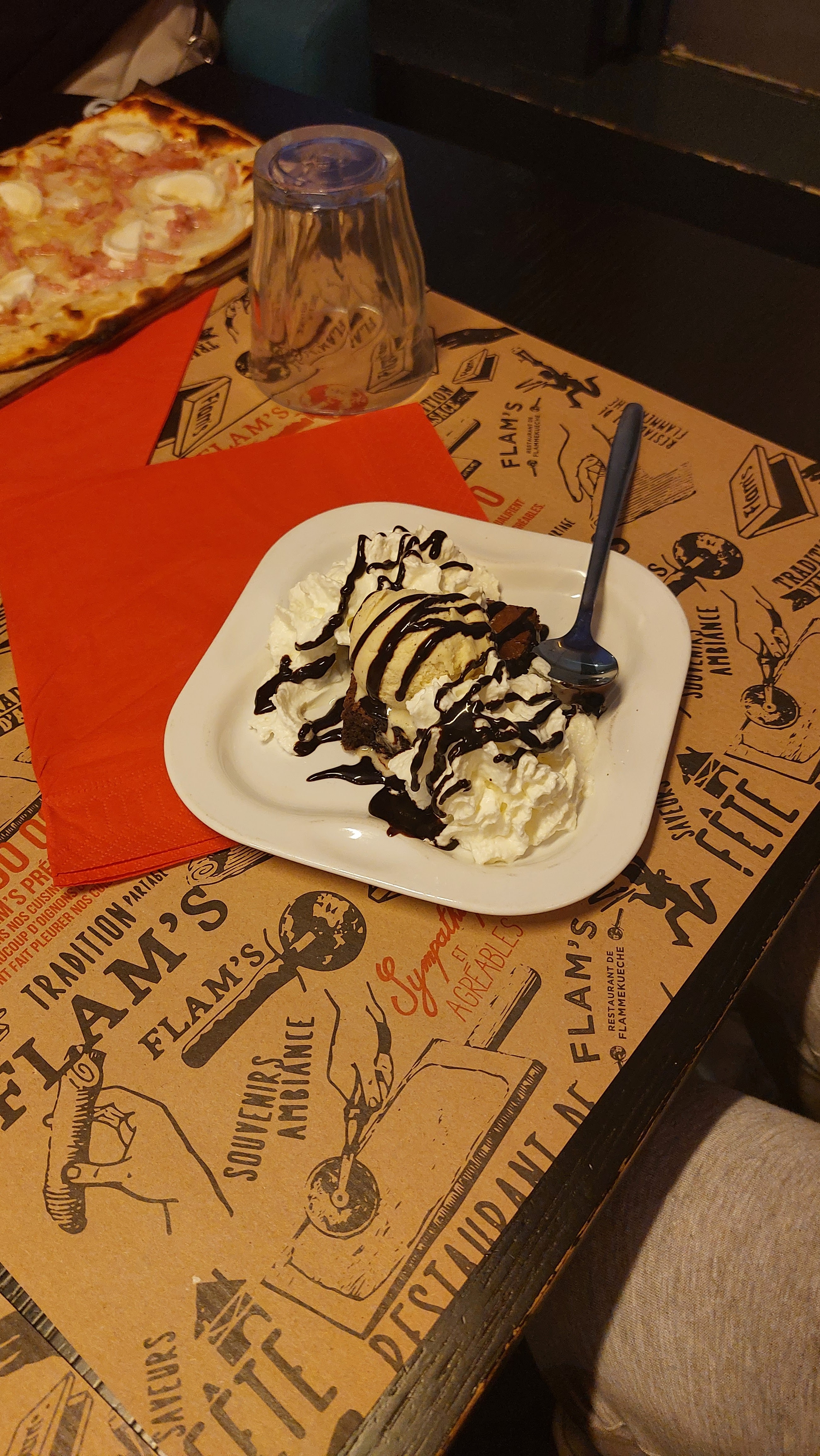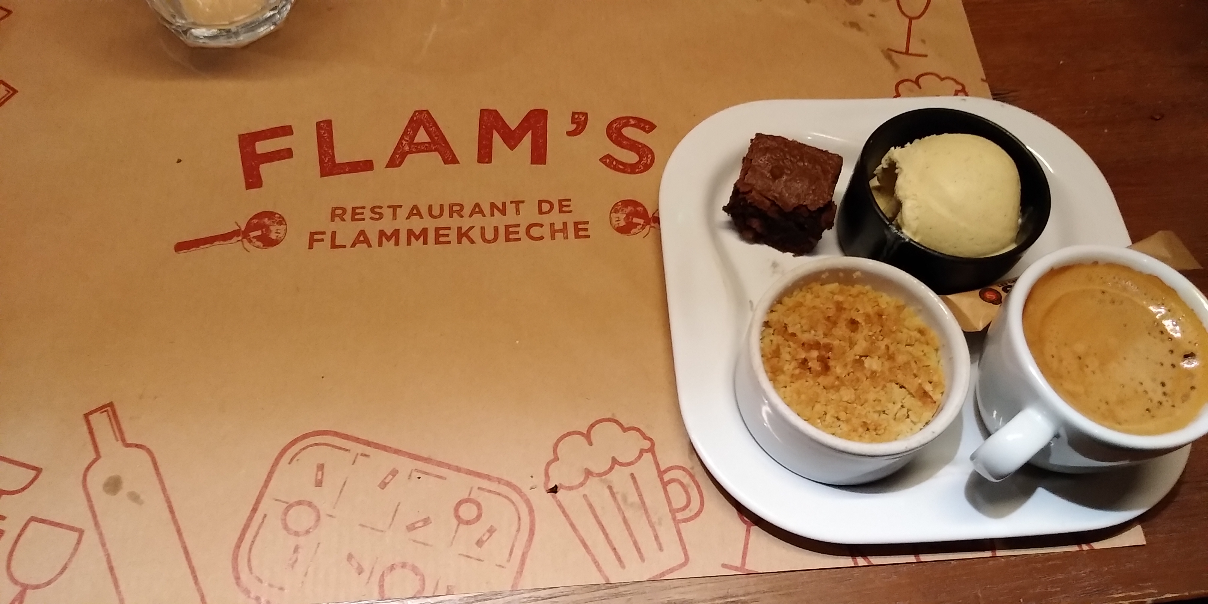 Concept très sympathique, menus intéressants pour le prix. En revanche, les flammekueches sont de petite taille et peu importe combien vous êtes, il n'y a qu'une tarte à la fois à table... Nous n'avions pas forcément envie des mêmes garnitures, c'est dommage. Nous étions donc contraints de manger sur la même planche... Gros point négatif, les glaces (5 saveurs différentes) étaient infectes et donc pas mangées. Pour finir, les tables sont très rapprochées. Créer une intimité est absolument impossible et vous profitez des discussions des 3/4 tables qui vous entourent.