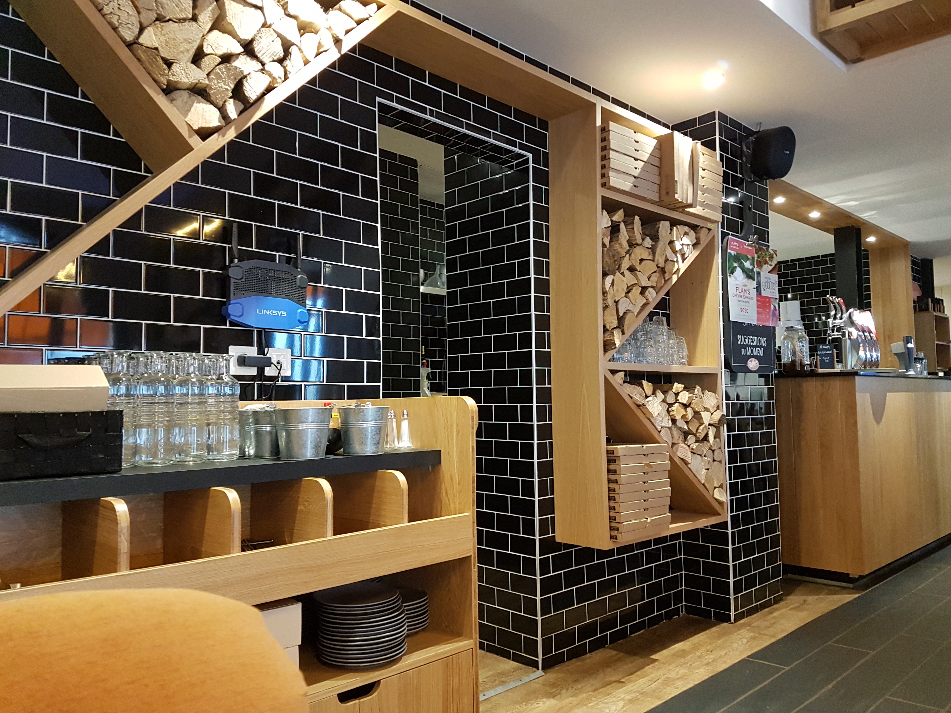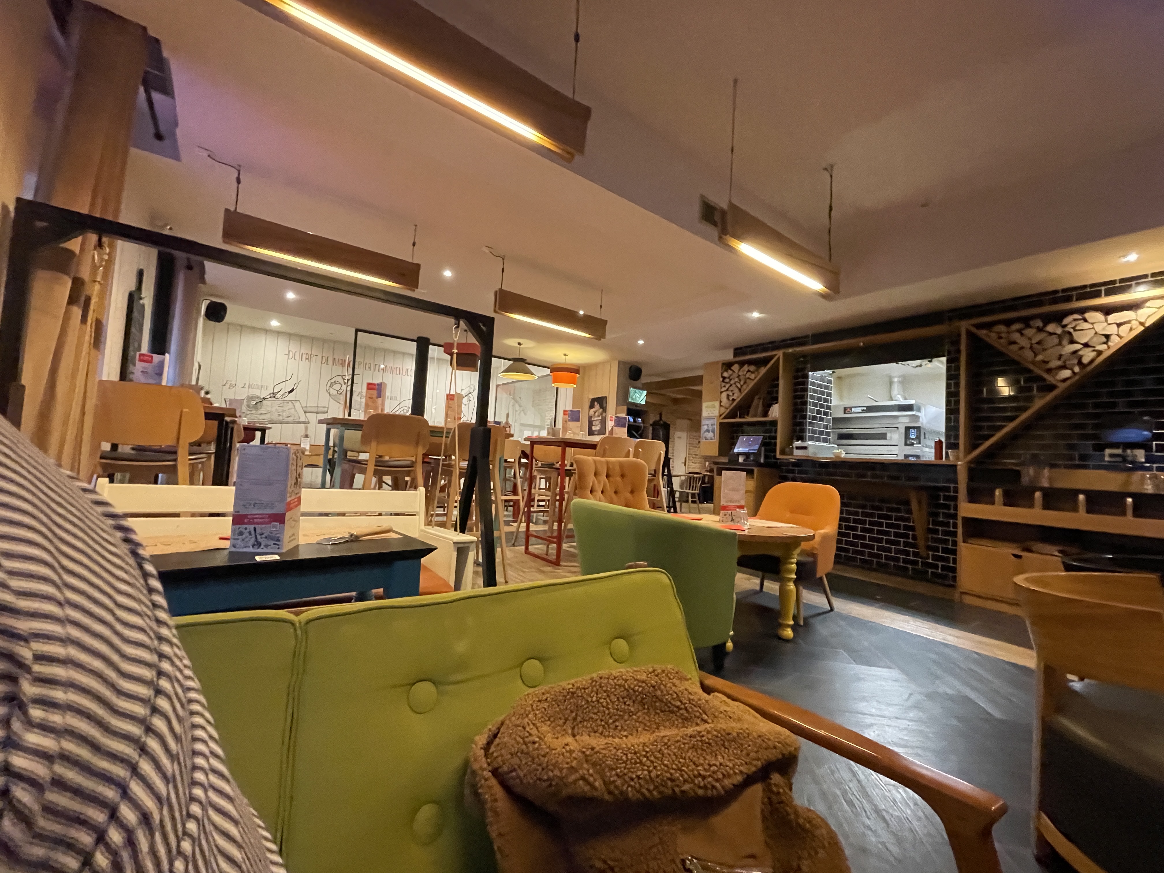 Le décor est très chaleureux, avec des assises différentes, possibilité d'utiliser les jeux de société sur place. Le principe des flammekueche à volonté est très sympa.