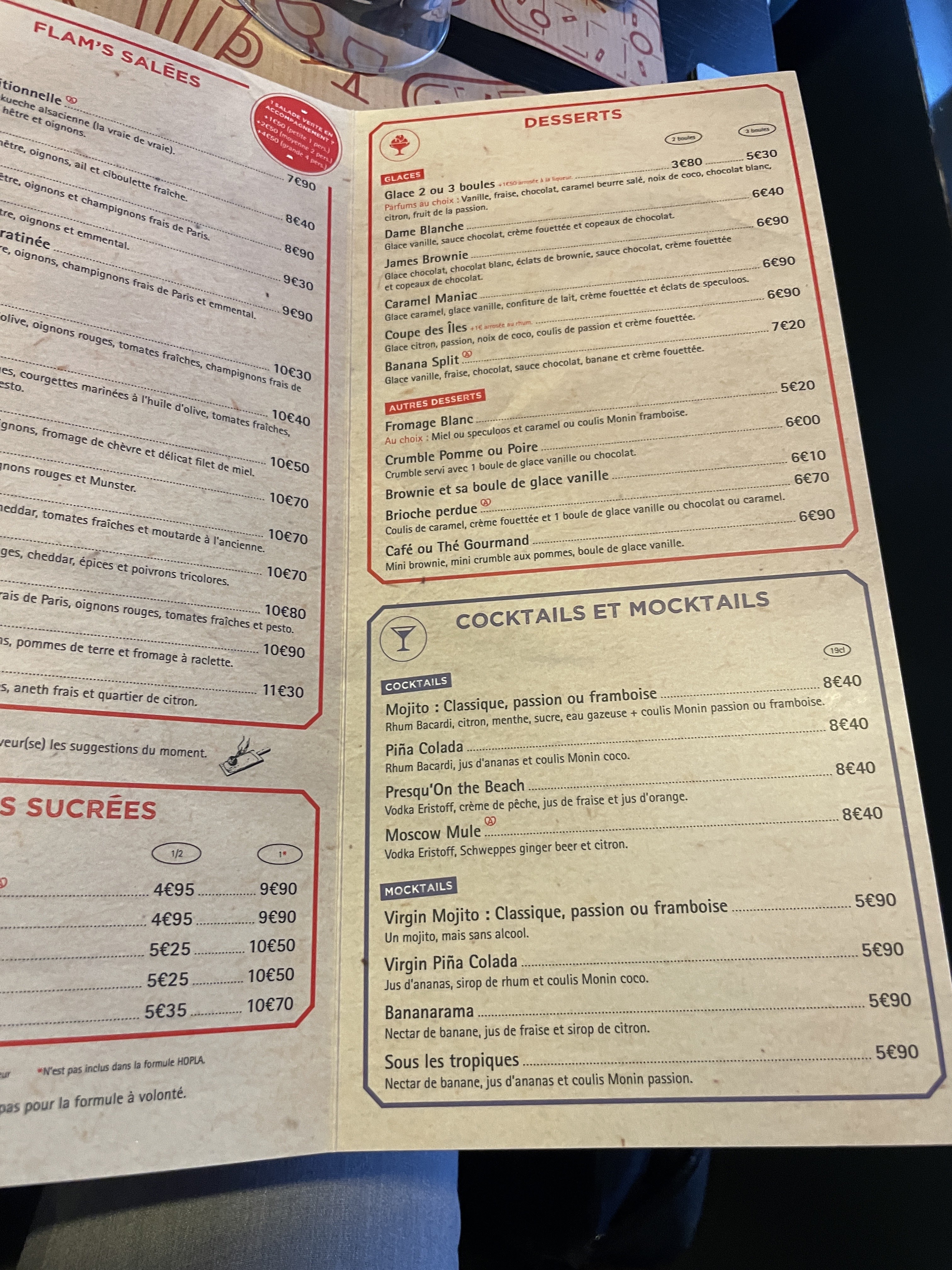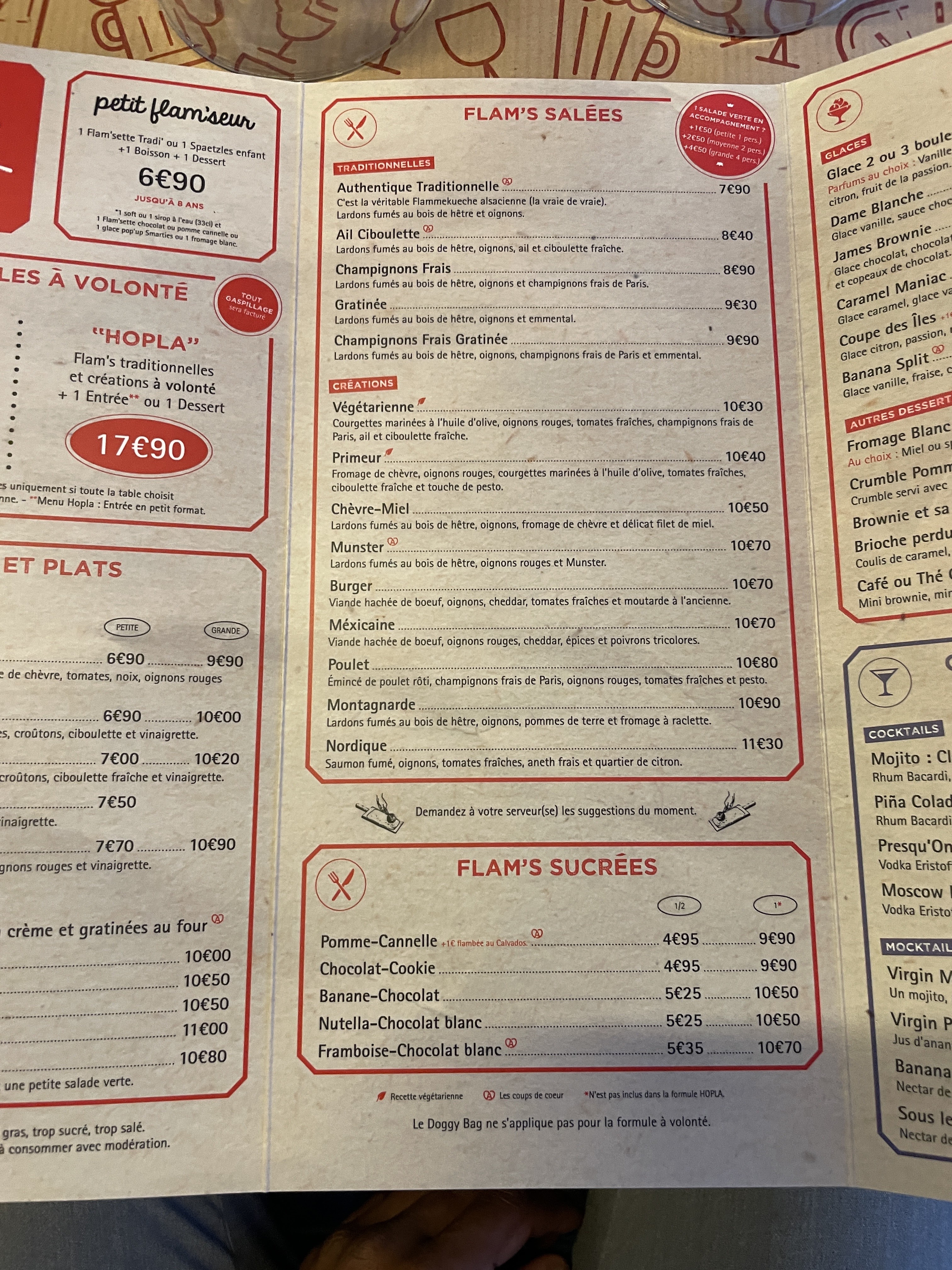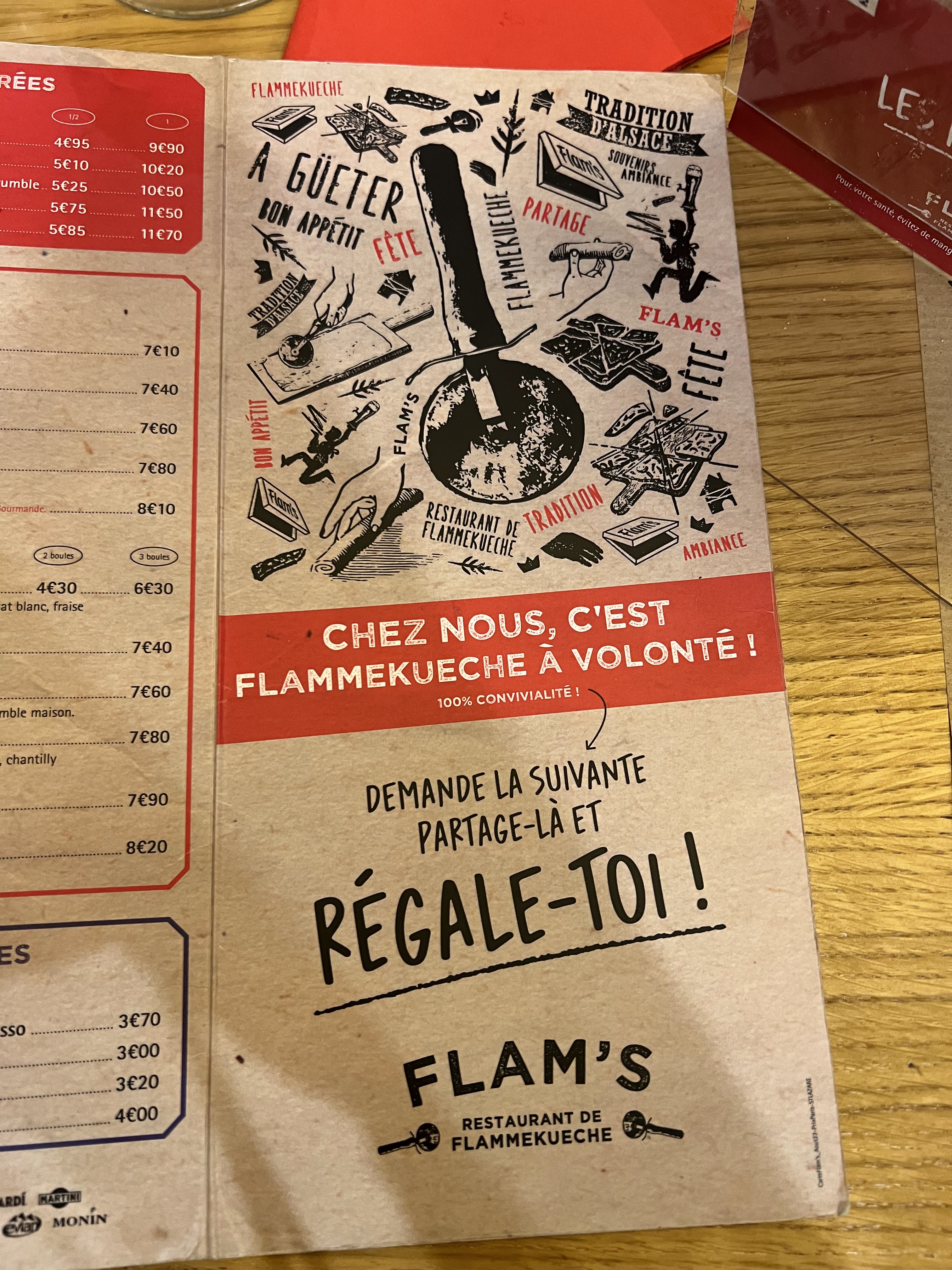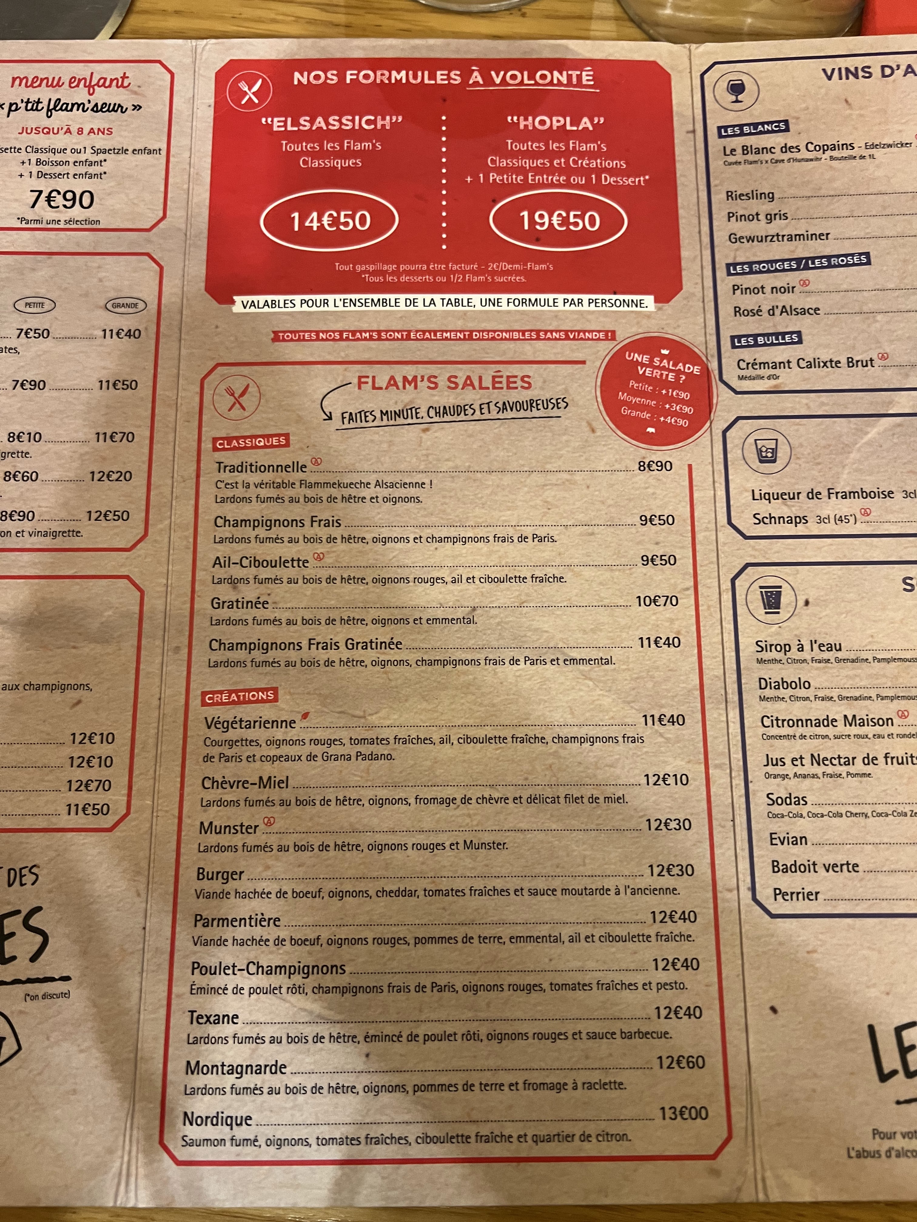 Une formule à volonté même disponible le samedi soir, des flams variées, mention spéciale à la Primeur. Les Flams arrivent en continue grâce à un service efficace. Biere tiger bock à un tarif raisonnable. Et Il y a même quelques jeux de sociétes pour finir le repas dans l'amusement.