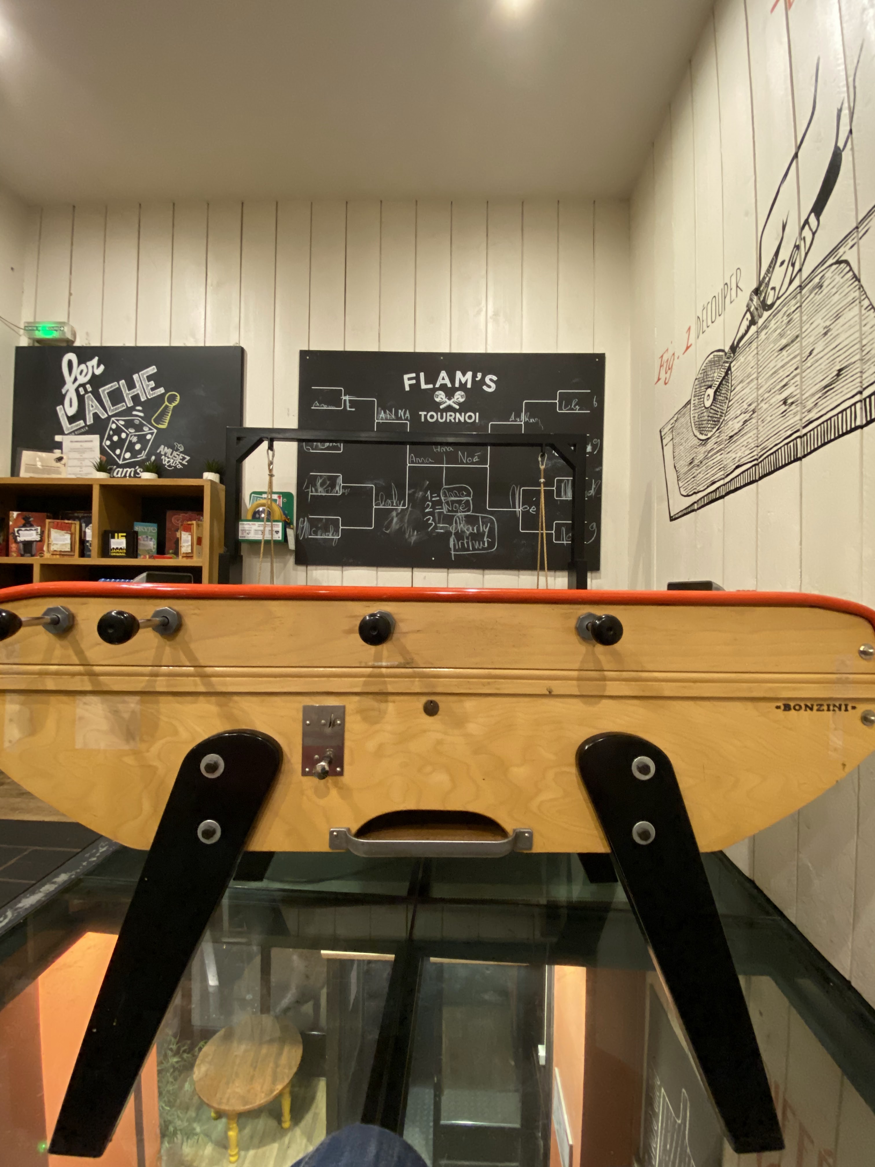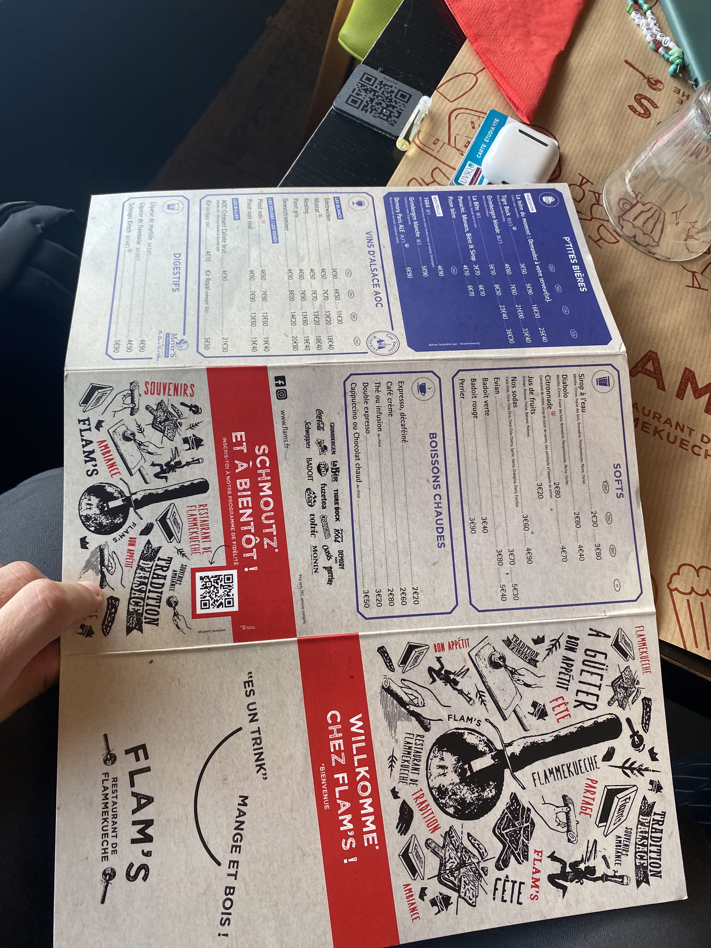 Bonne expérience chez Flam’s entre amies. Les flammekueches étaient délicieuses, chaudes et fondantes, avec un très bon rapport qualité-prix. En revanche, les boissons manquaient de fraîcheur, et le service était correct. Des jeux de babyfoot et de société sont mis à disposition dans le hall, ajoutant une touche conviviale à l’expérience.