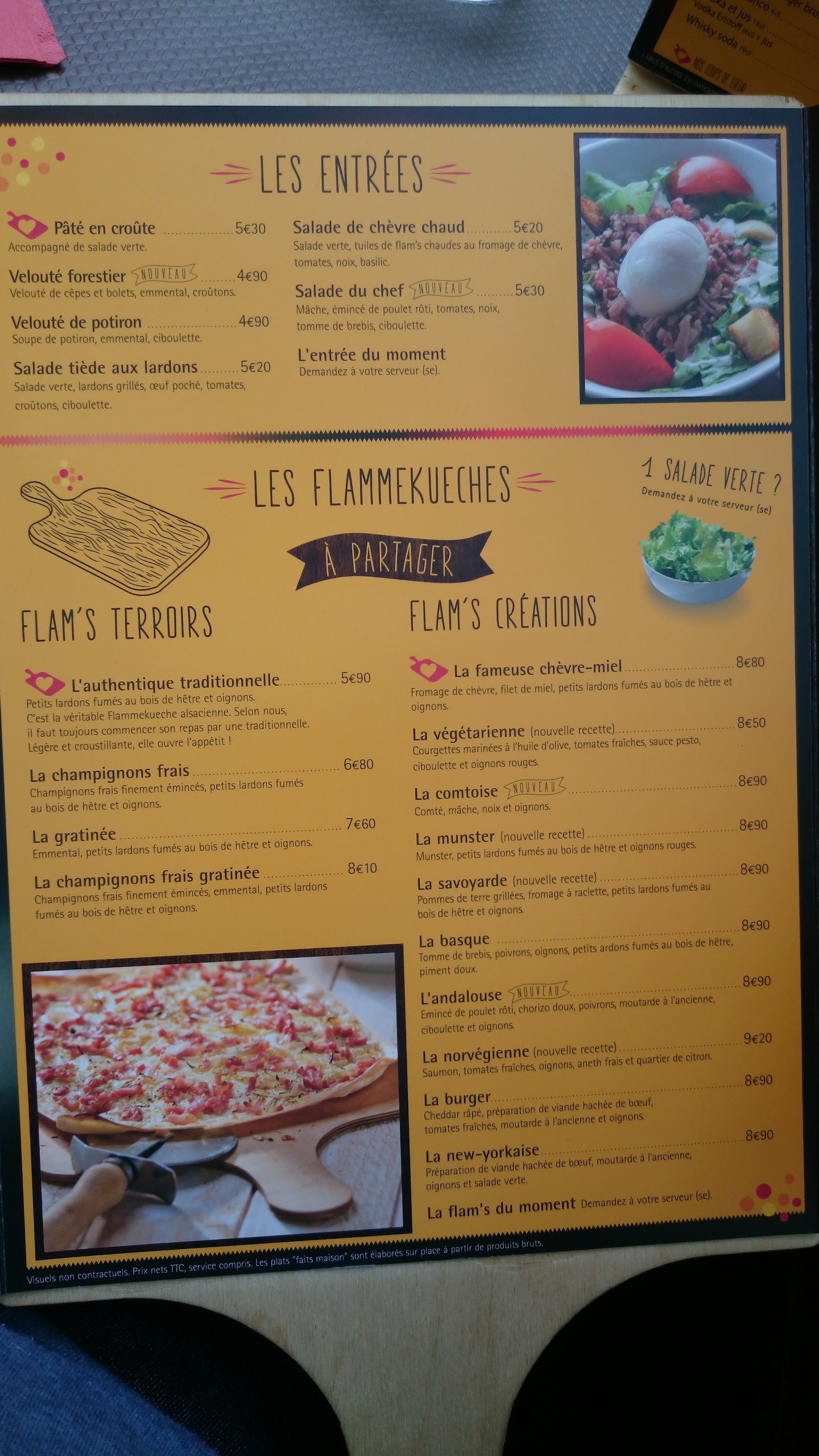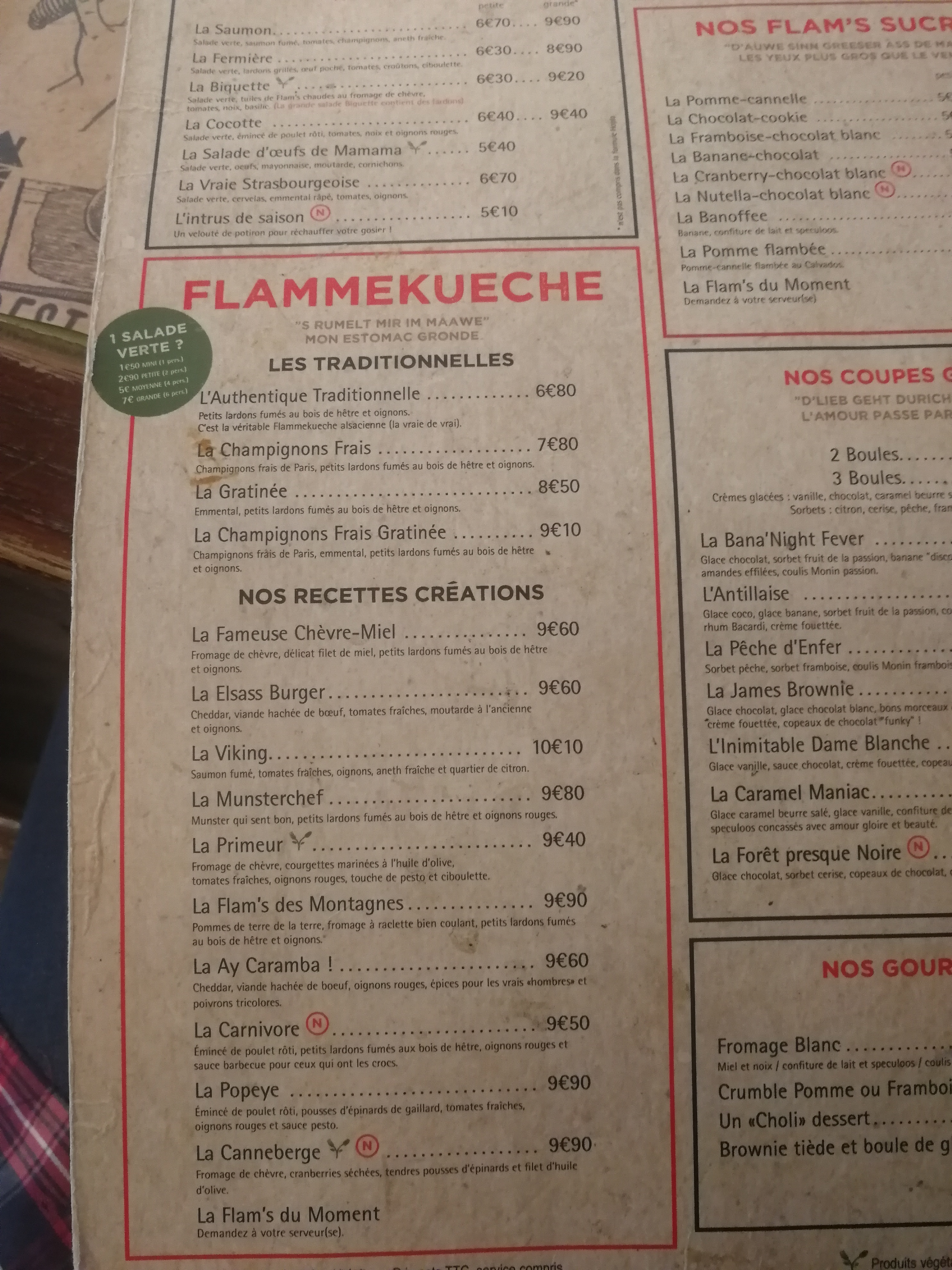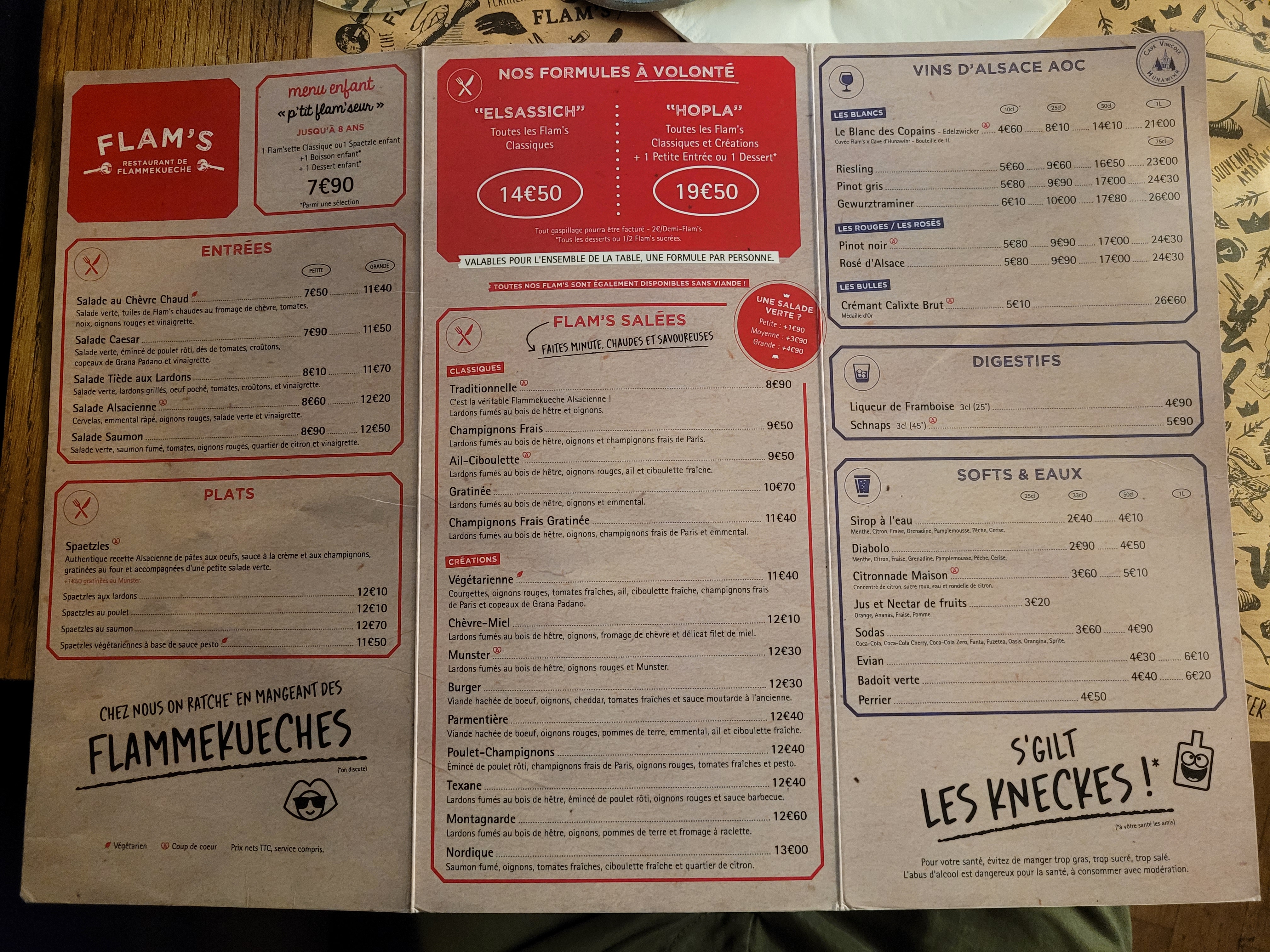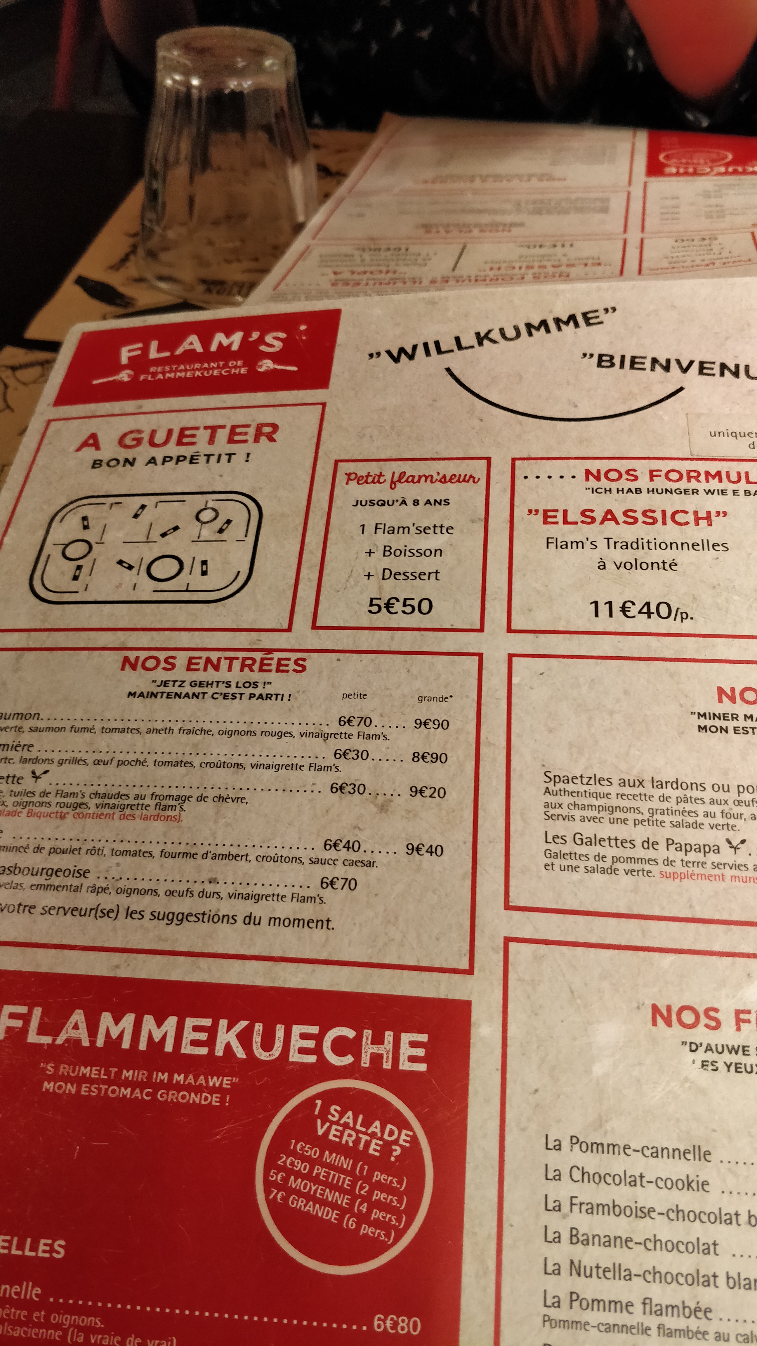 Nous avons pris la formule à volonté avec les flams speciales On peut commander autant de flams que l'on peut manger, comme nous étions 6 on pouvait en prendre 2 par 2 pour la tablée. Le service est ultra rapide et les flams sont délicieuses je recommande celle au munster et la classique. Avec la formule on peut choisir parmi tous les desserts. Je ne recommande pas pour les végétariens (si il y a un seul végétarien dans l'équipe c'est pas très fun pour lui)