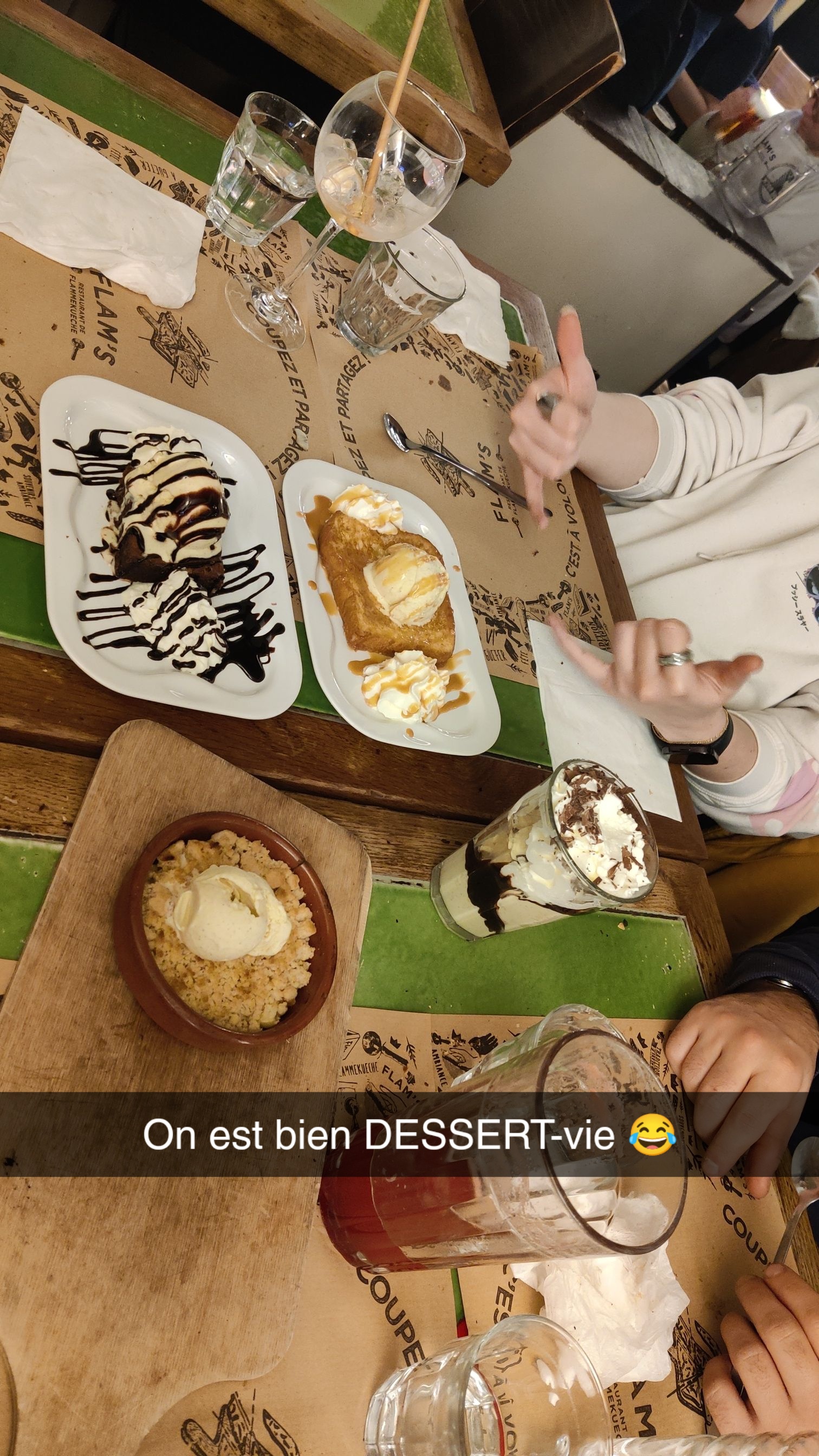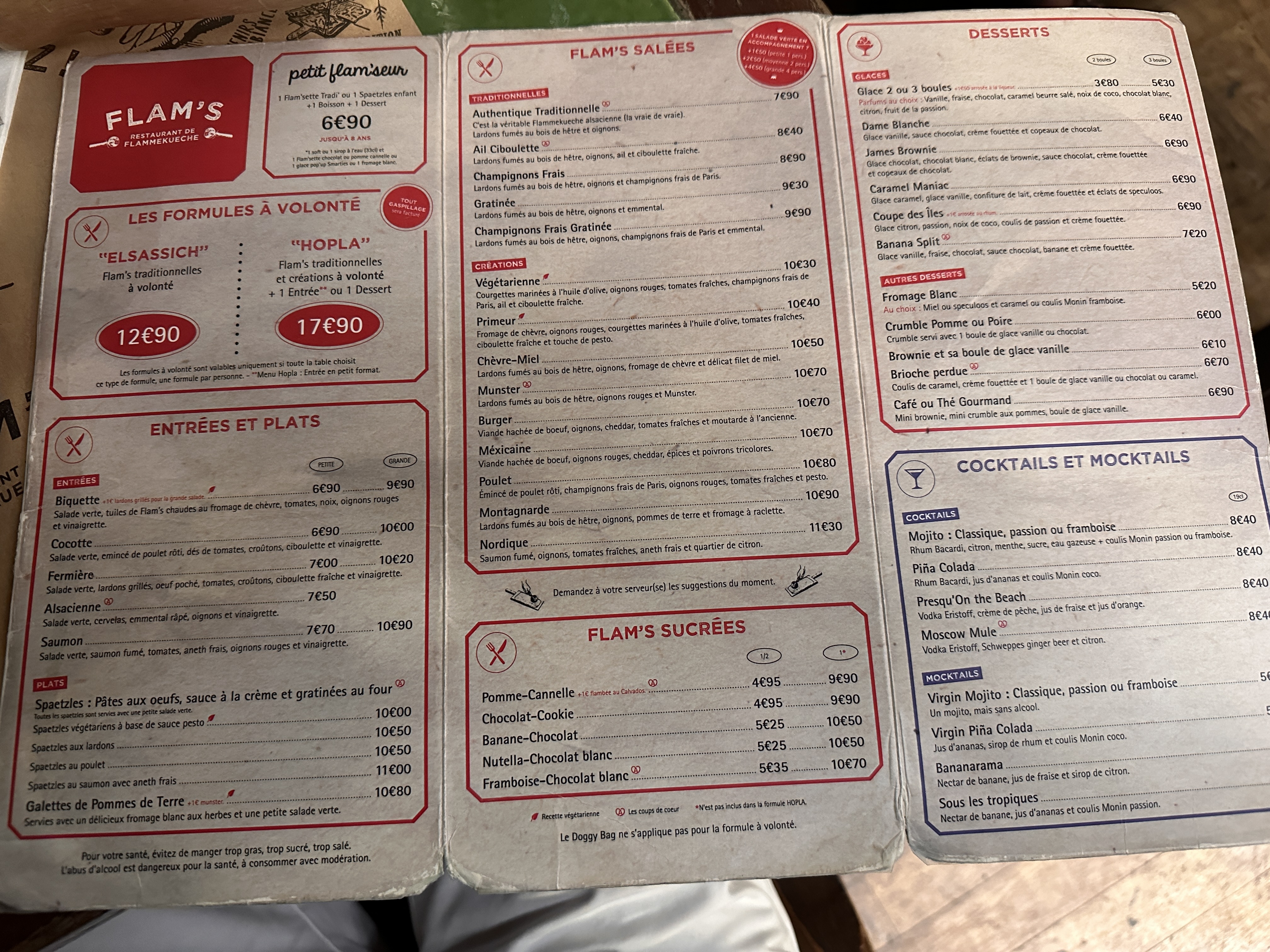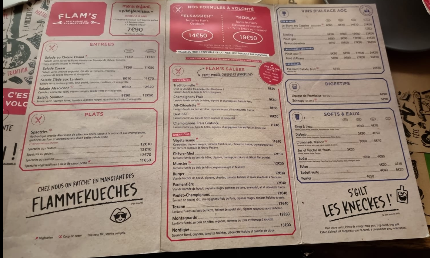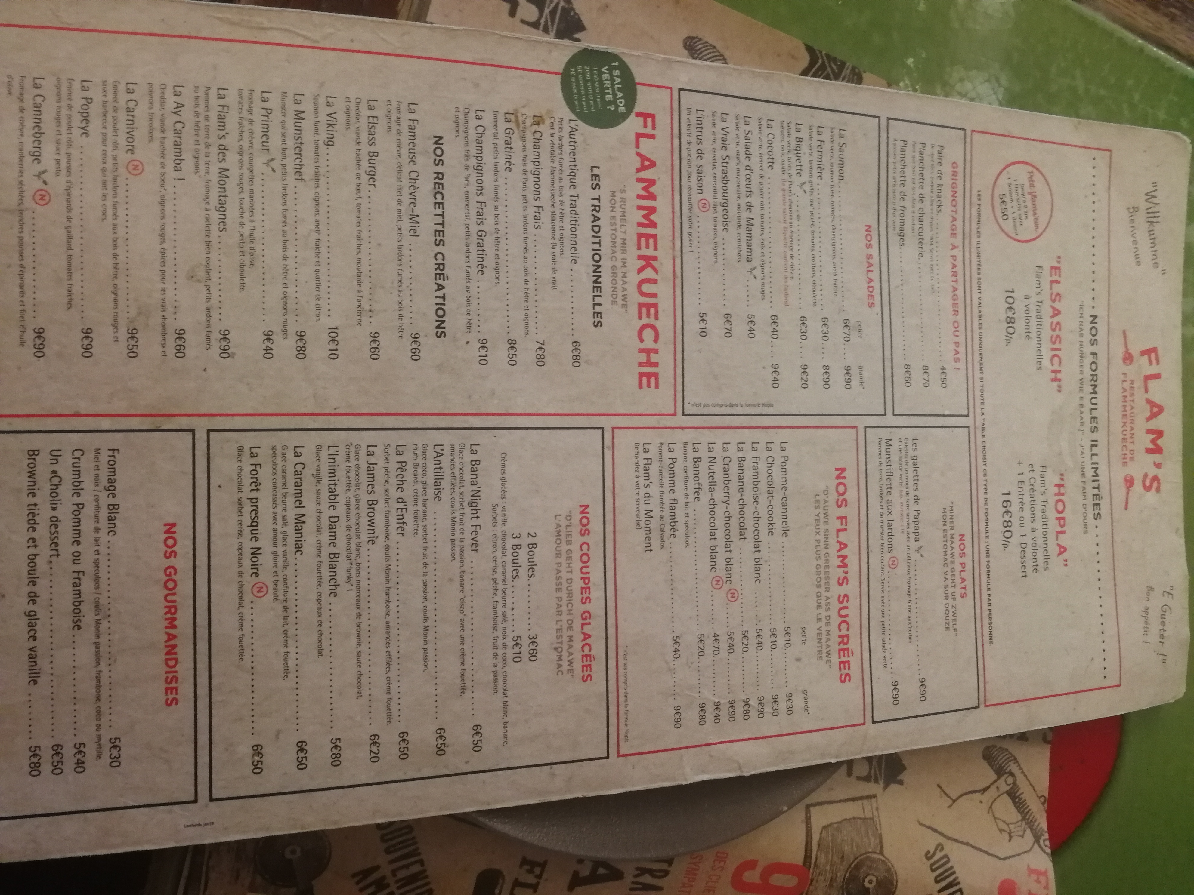 Nous avons pris la formule à volonté avec les flams speciales On peut commander autant de flams que l'on peut manger, comme nous étions 6 on pouvait en prendre 2 par 2 pour la tablée. Le service est ultra rapide et les flams sont délicieuses je recommande celle au munster et la classique. Avec la formule on peut choisir parmi tous les desserts. Je ne recommande pas pour les végétariens (si il y a un seul végétarien dans l'équipe c'est pas très fun pour lui)