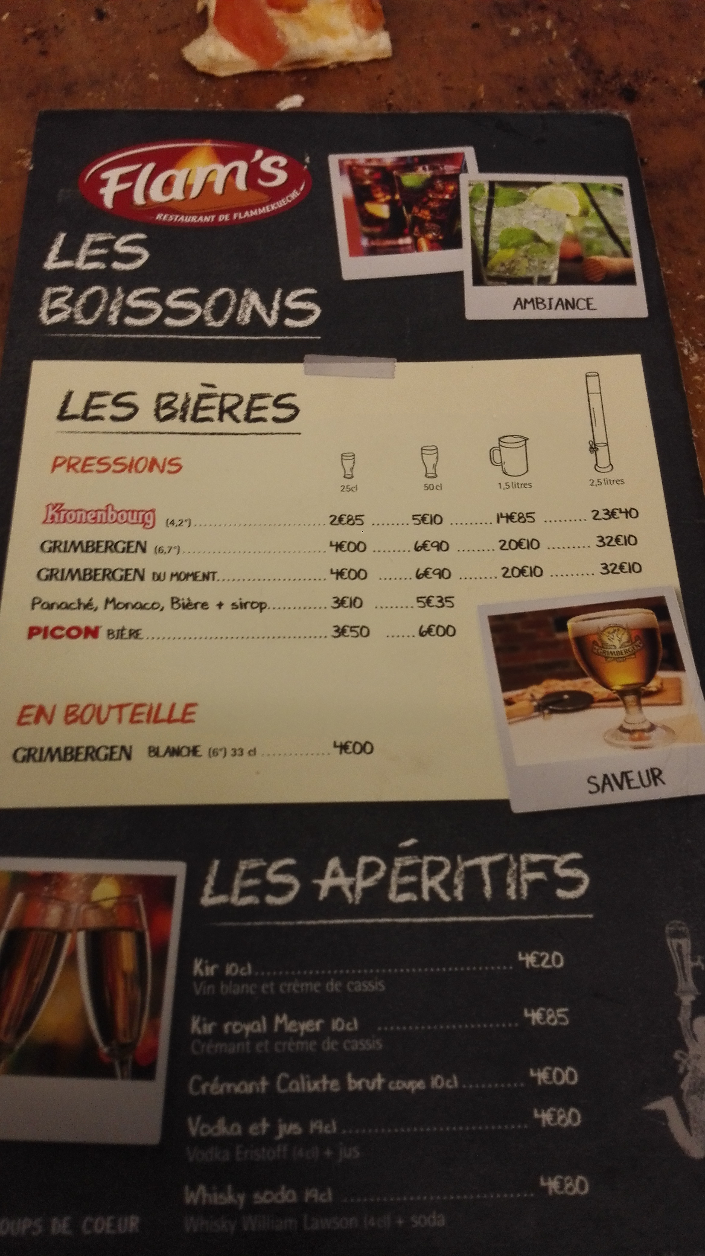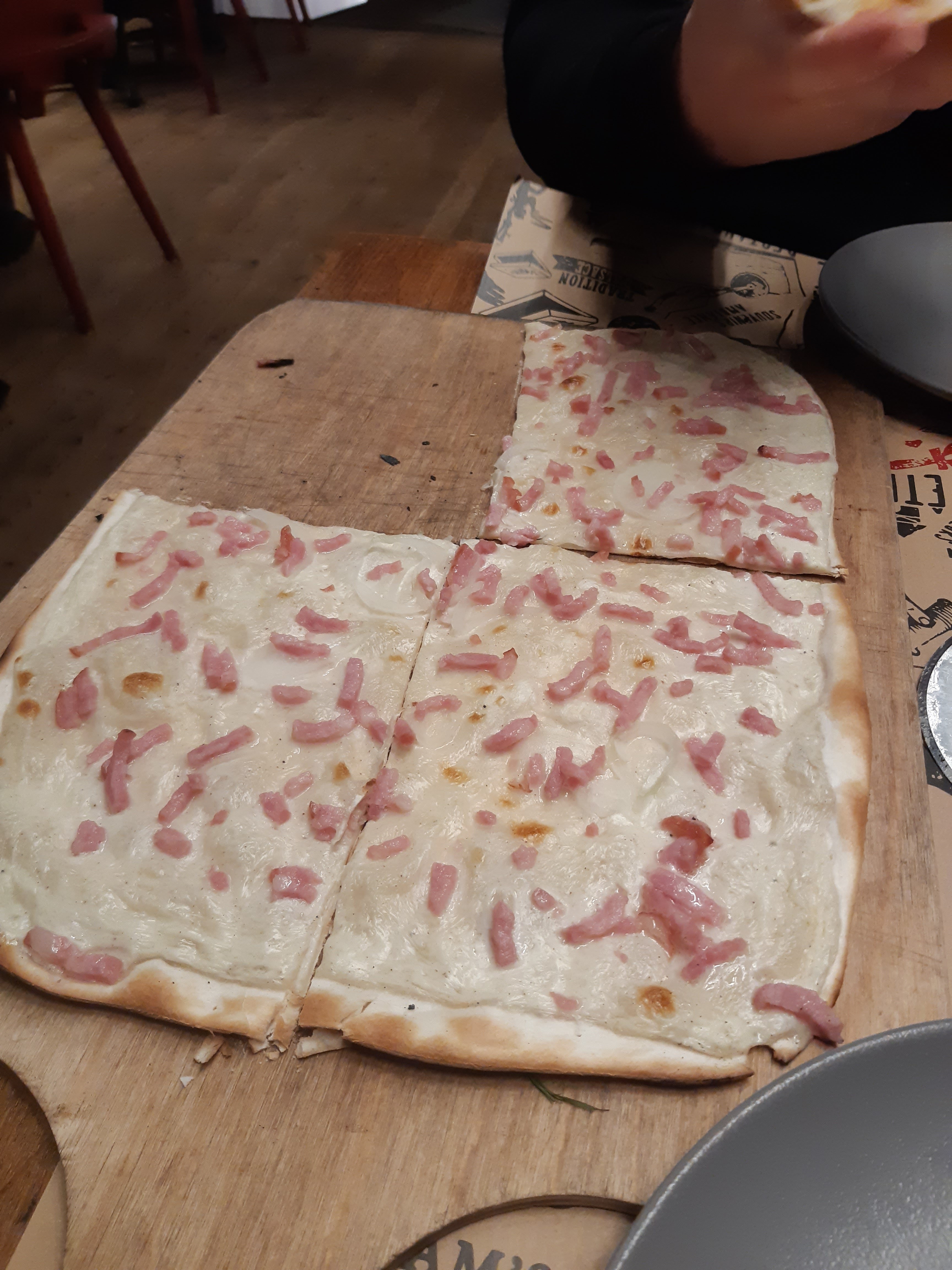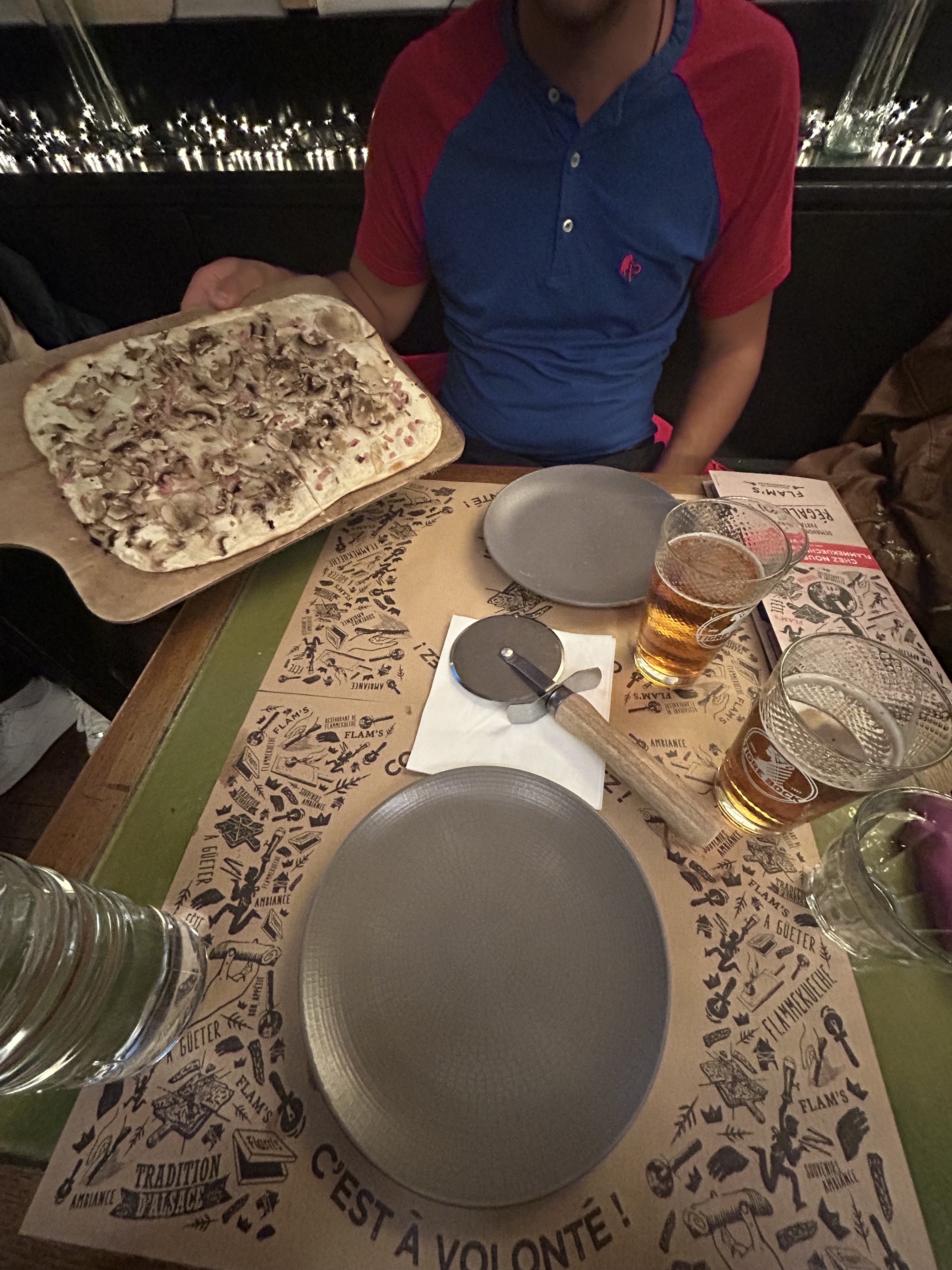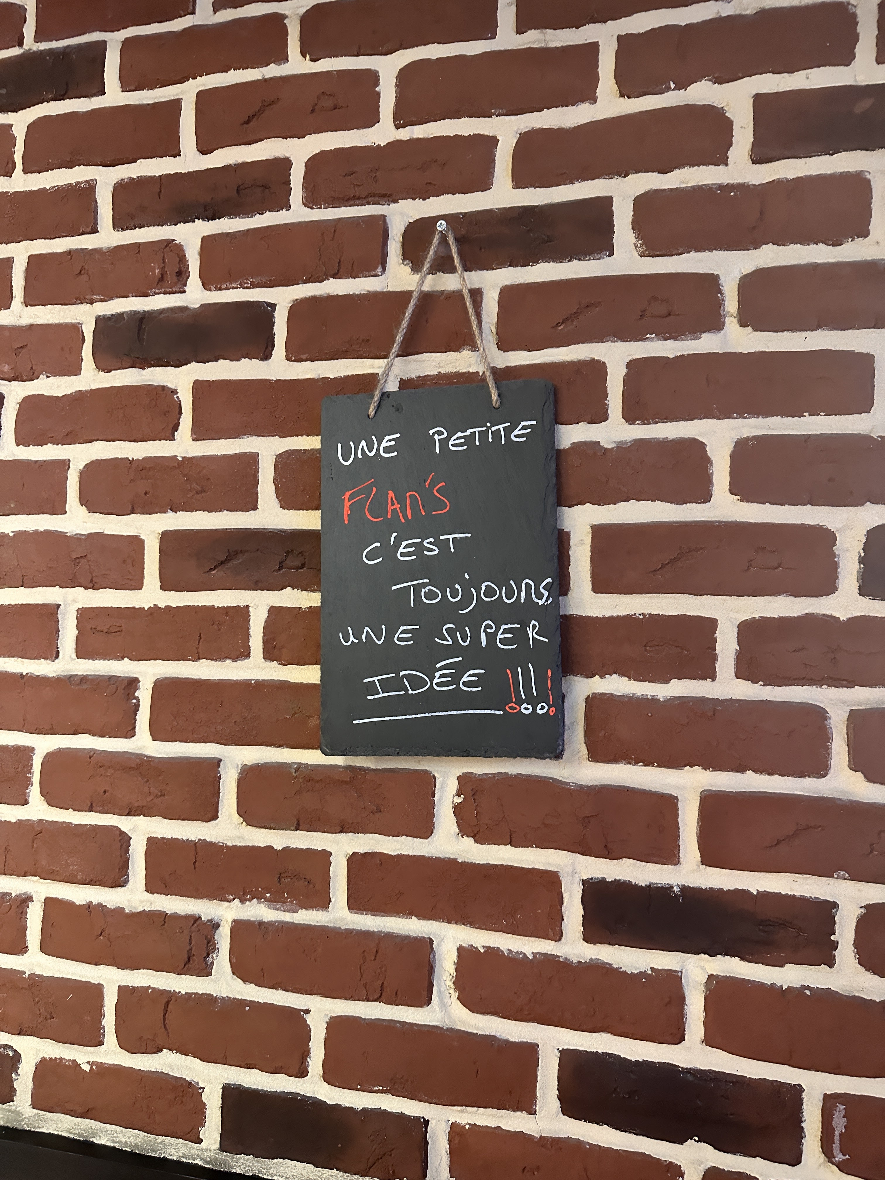 Les flams sont vraiment très bonnes et il y en a pour tous les goûts. Nous avons eu un serveur super aimable qui a rendu le repas encore meilleur ! Petit point négatif, au fond du sous sol en me trompant de côté pour aller aux wc, j’ai aperçu un rat ou une souris. Heureusement, loin des cuisines.