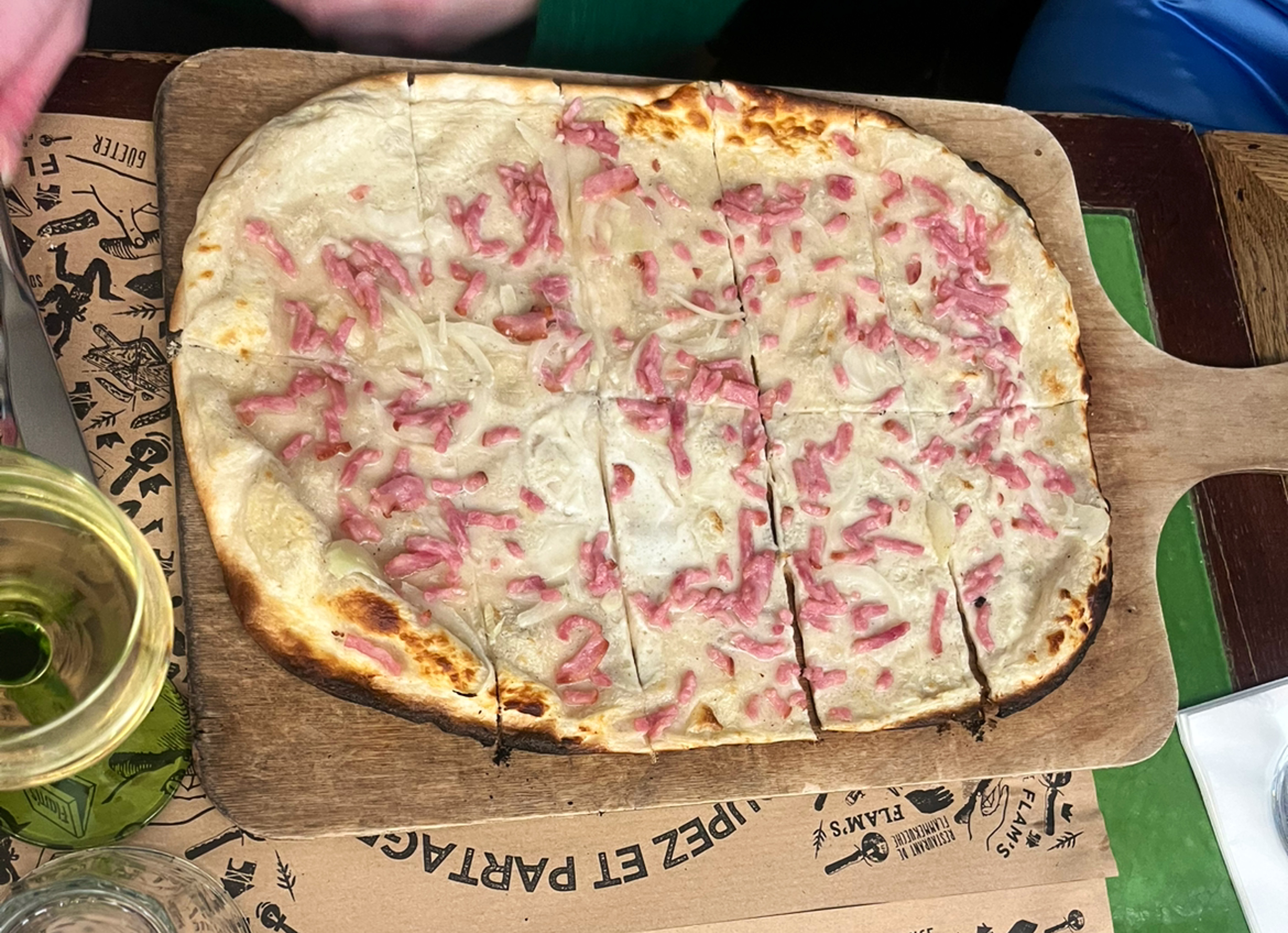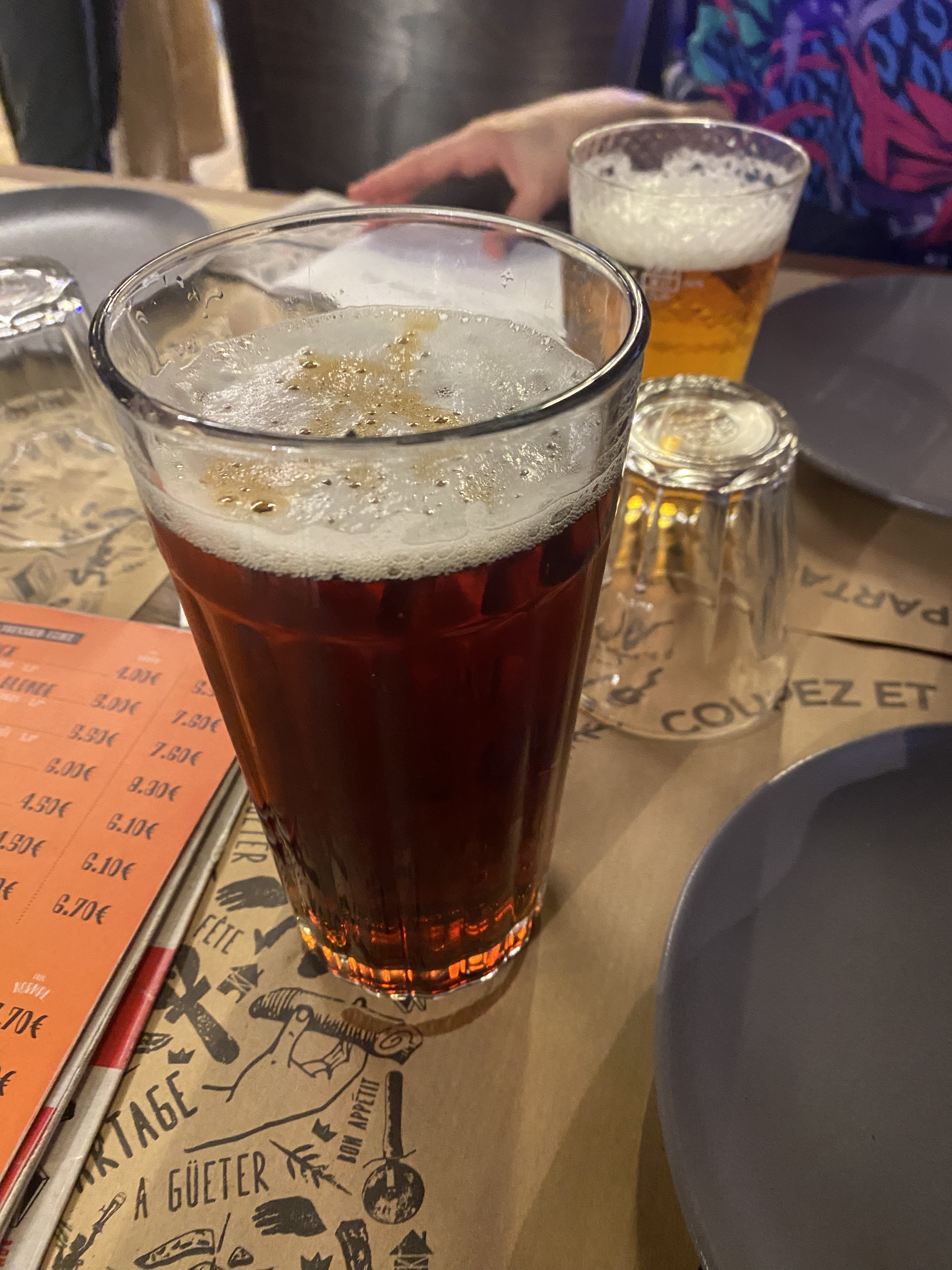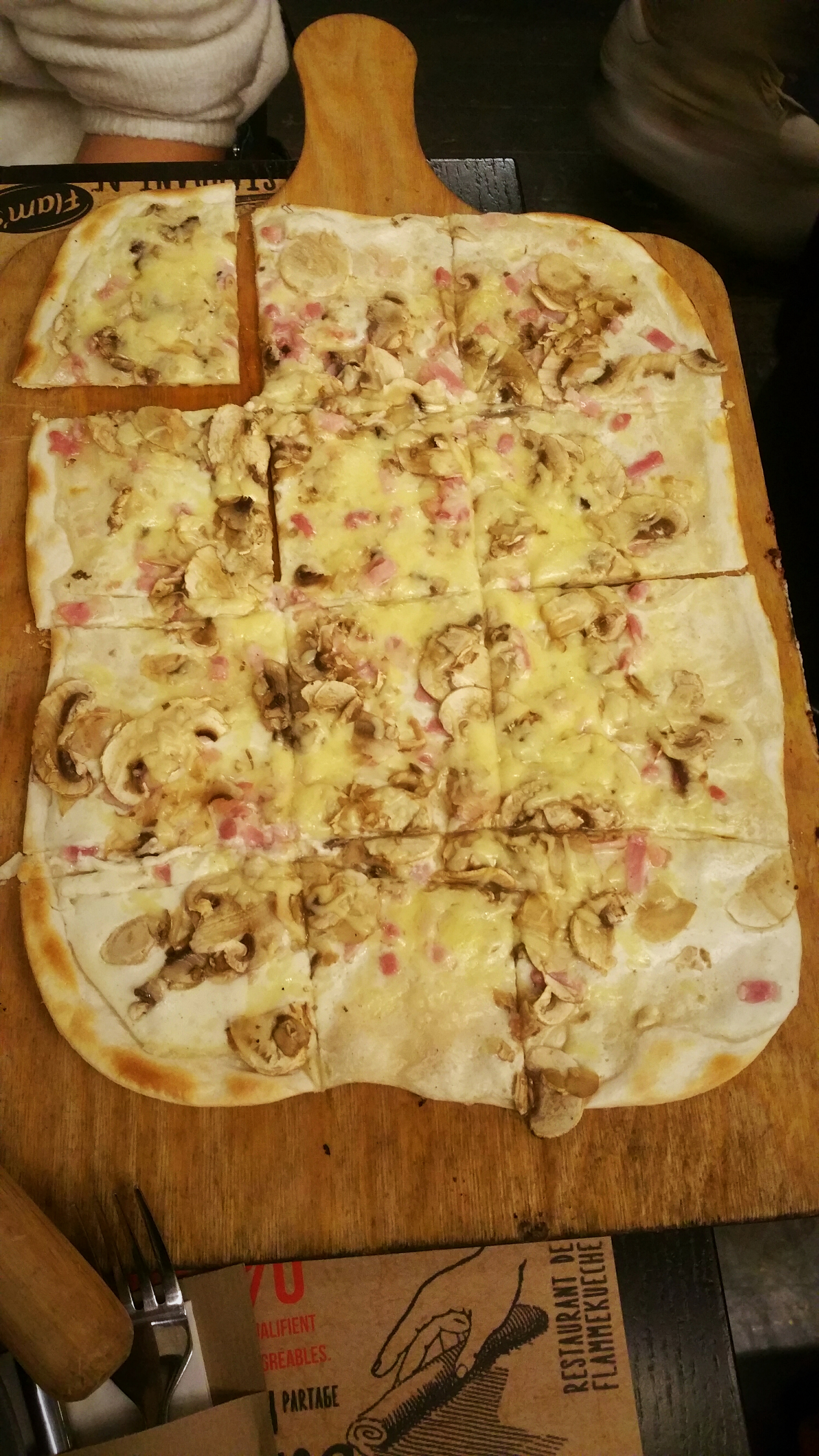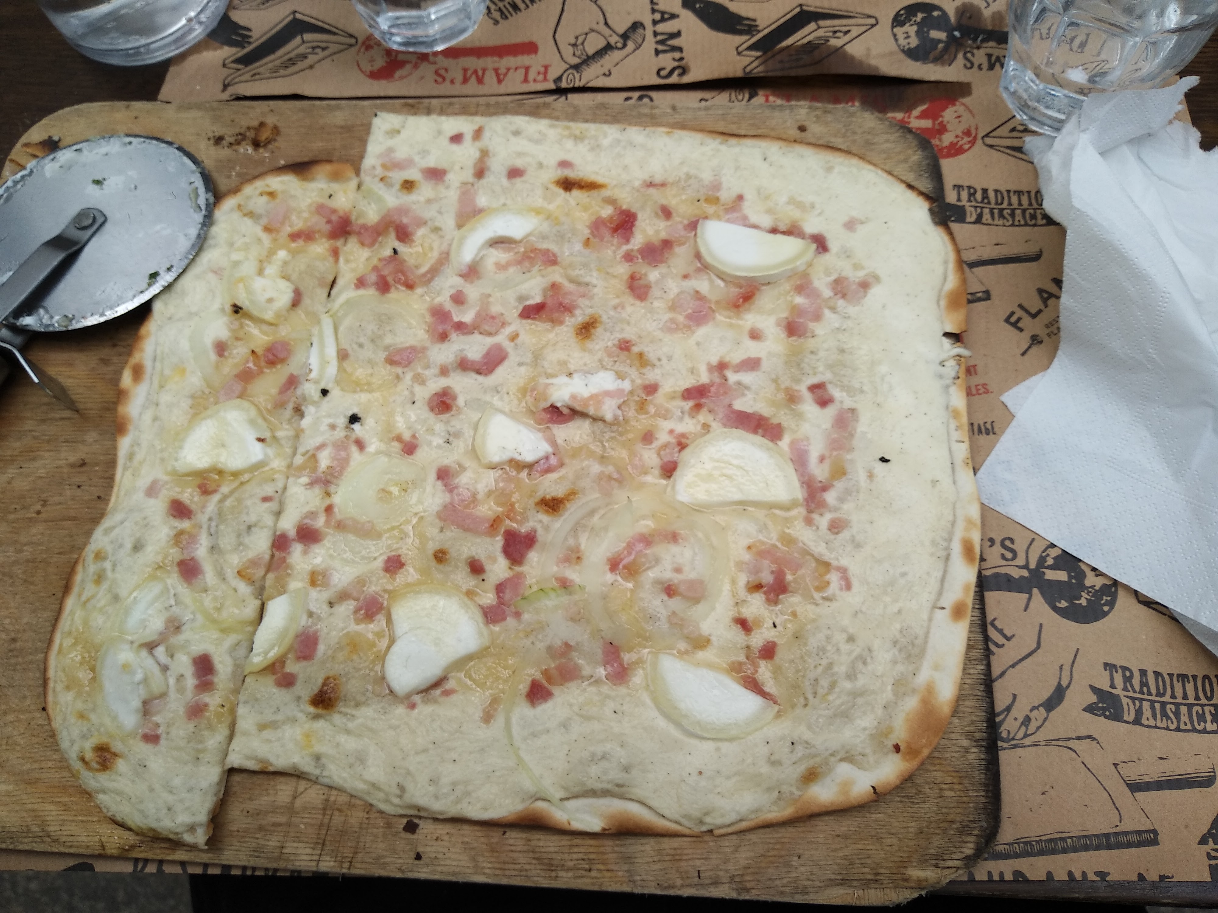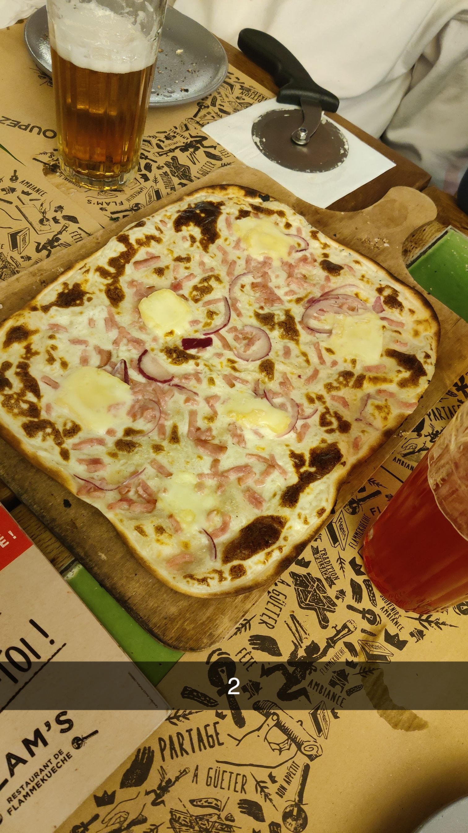 Les flams sont vraiment très bonnes et il y en a pour tous les goûts. Nous avons eu un serveur super aimable qui a rendu le repas encore meilleur ! Petit point négatif, au fond du sous sol en me trompant de côté pour aller aux wc, j’ai aperçu un rat ou une souris. Heureusement, loin des cuisines.