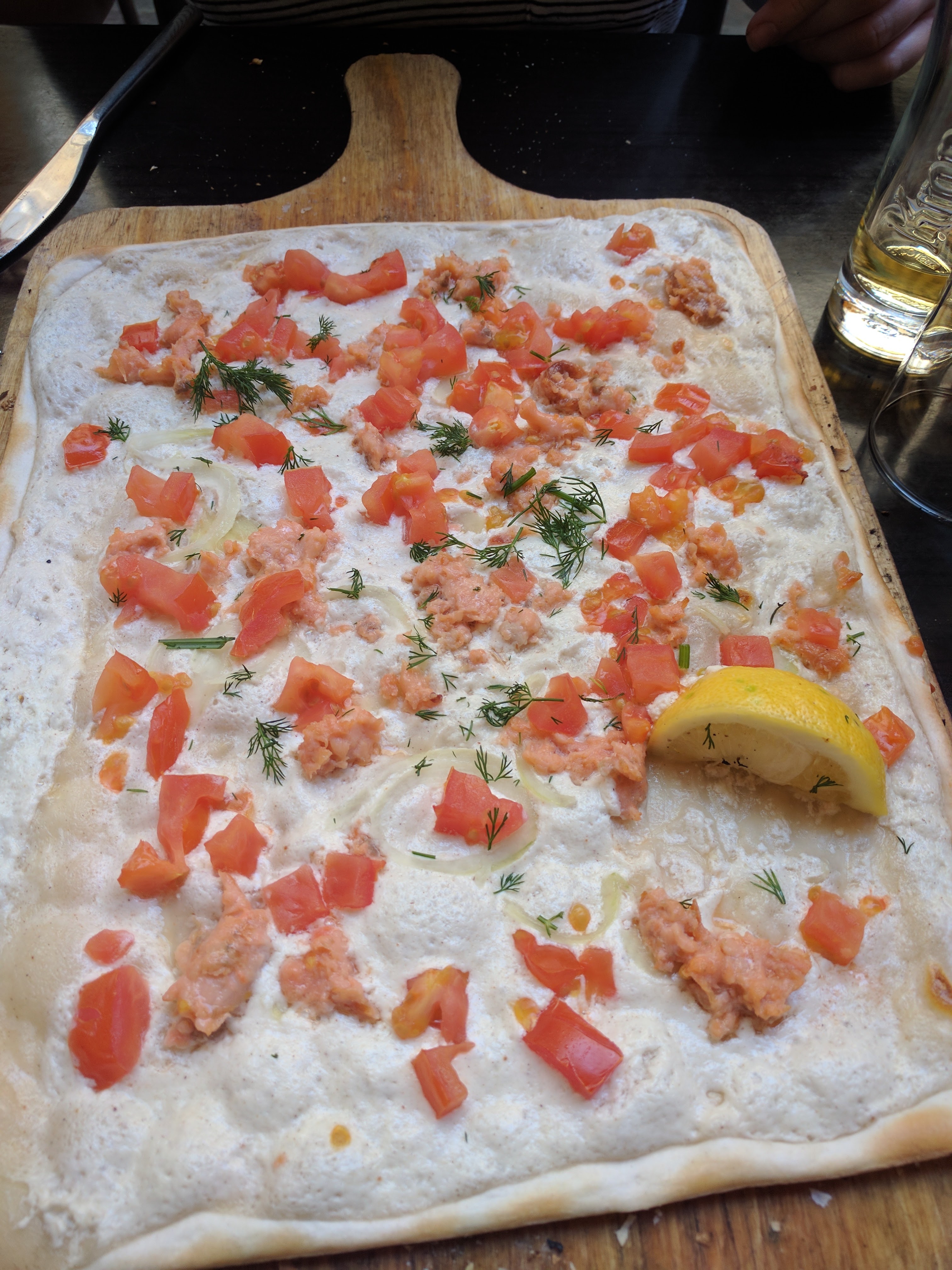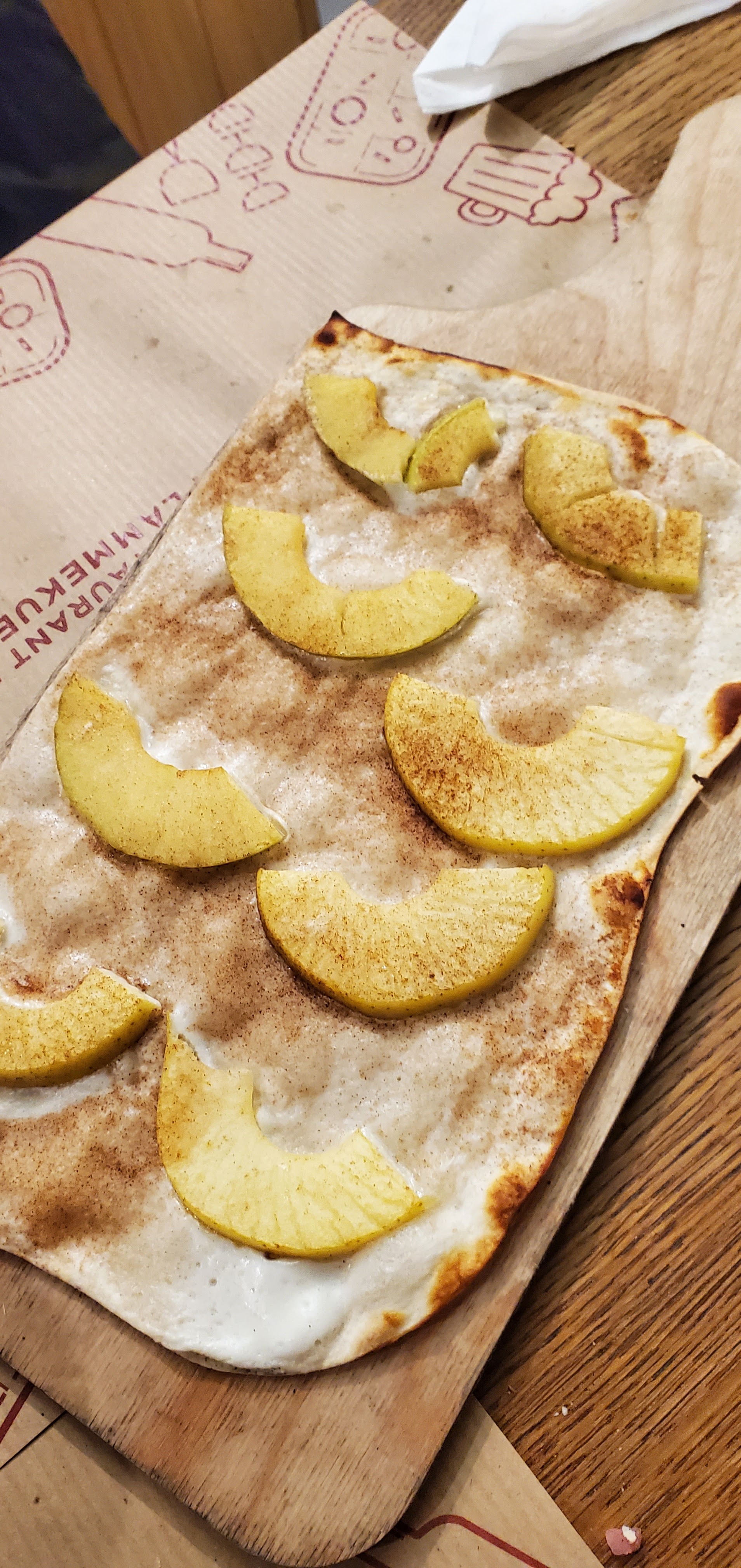 Un repas de qualité. Nous avons été servis comme des King. Que dis-je, comme des quiches, sans mauvais jeu de mot. Ce restaurant représente le pays de la flammenkueche, le Japon. Ne vous y trompez pas, l’Alsace n’est qu’une pâle copie de ce qui se fait de mieux dans la フラムクーヘ. L’Alsace n’a qu’à bien se tenir ! Allez y les yeux bandés, contrairement à moi.