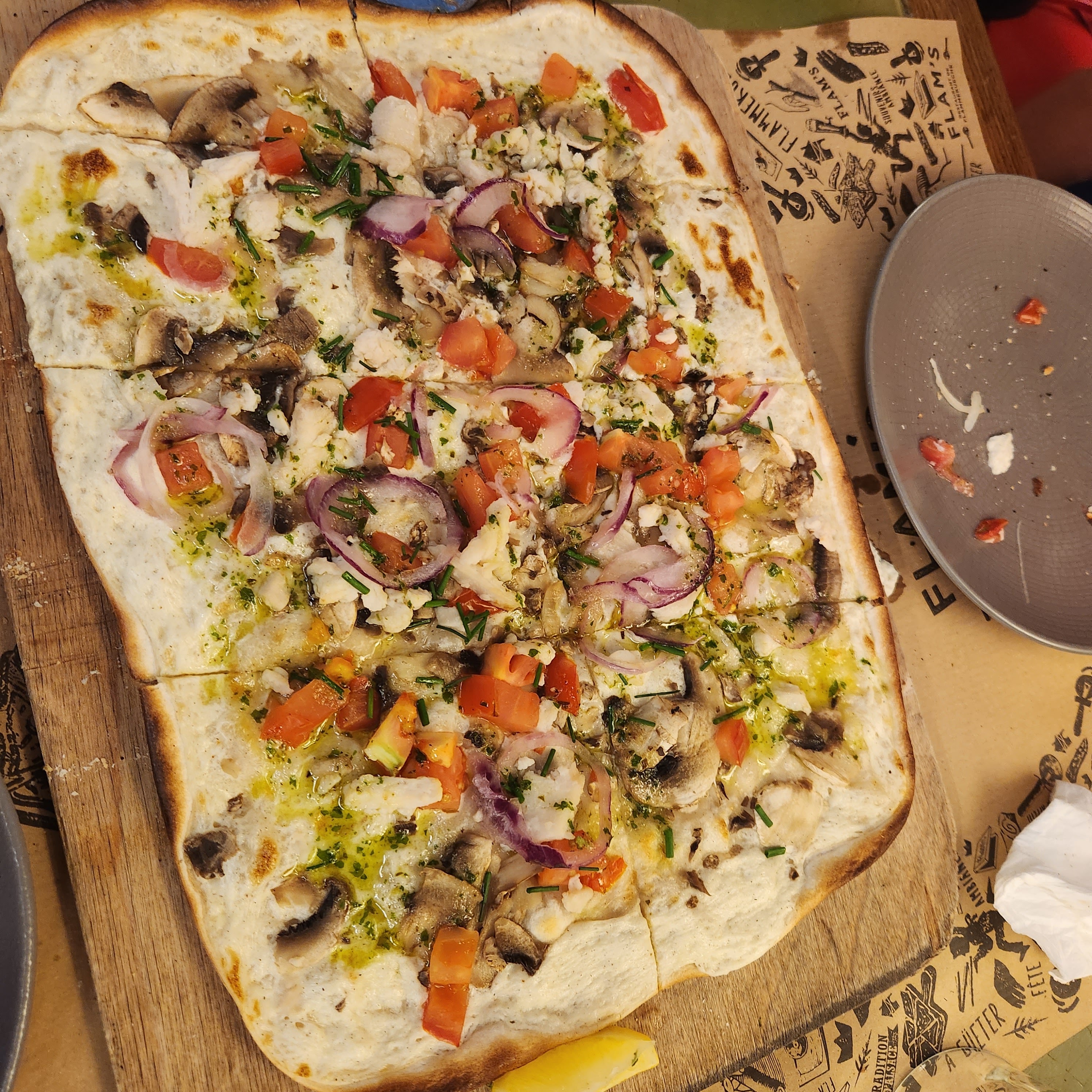 Cuisine incroyable, en même temps la flam représente ce qu'il y a de mieux culinairement : lardon oignon crème. Le début d'une grande œuvre. Et là, y a plein d'œuvres différentes. Le service est plutôt rapide, et qu'on puisse avoir des demi-flams sucrées c'est le top. L'ambiance est folle avec la playlist du chef ! Metallica, Guns & Roses, Kiss et j'en passe ! Y a même la partie bar pour les amoureux de la boisson