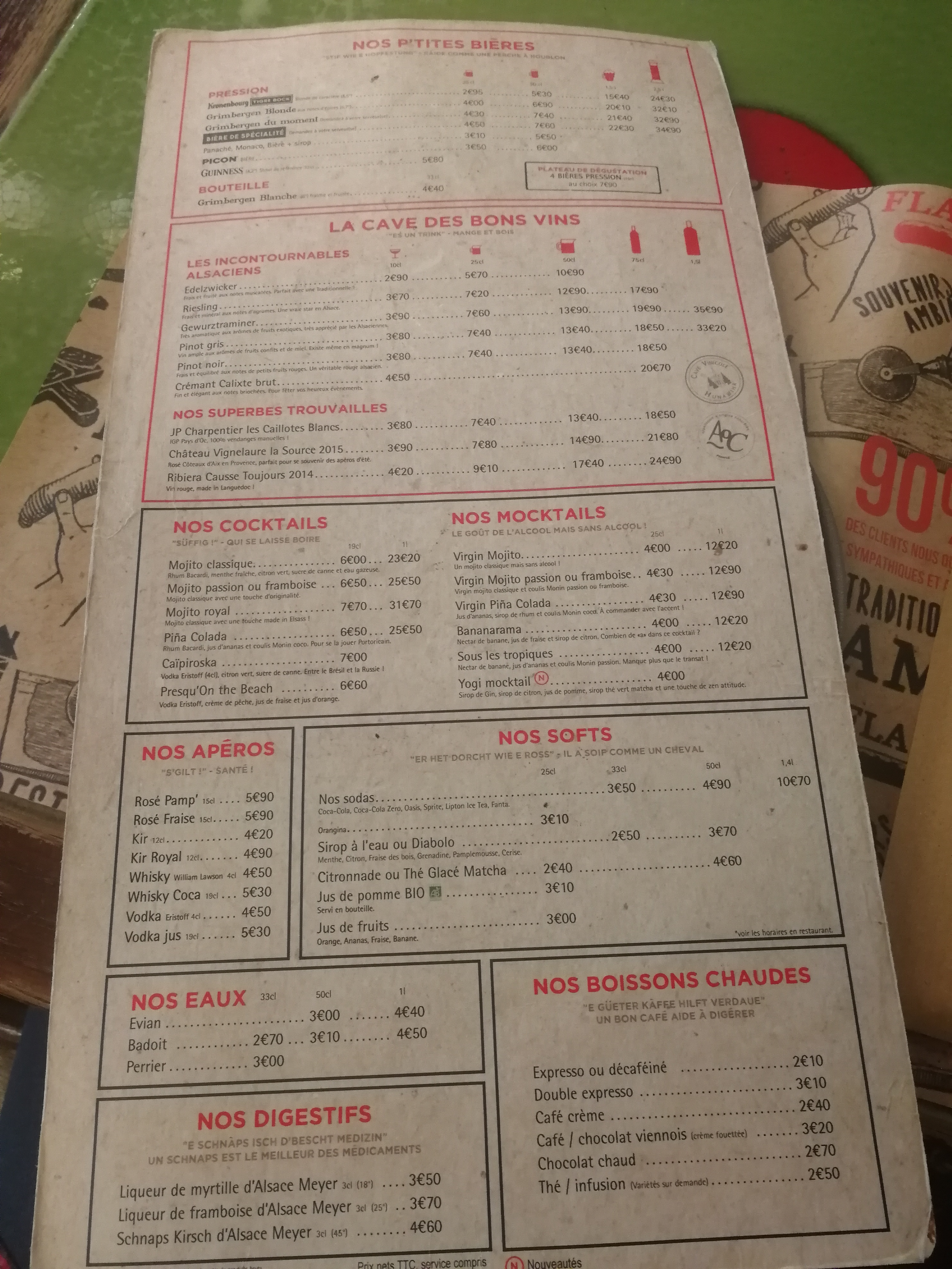 Personnel très gentil. C’est la première fois que je goûte ce plat alsacien donc je ne peux pas comparer mais c’était très bon. Service rapide. Prix corrects. Petit bémol pour : la musique heavy metal et les tables/chaises grasses et collantes.