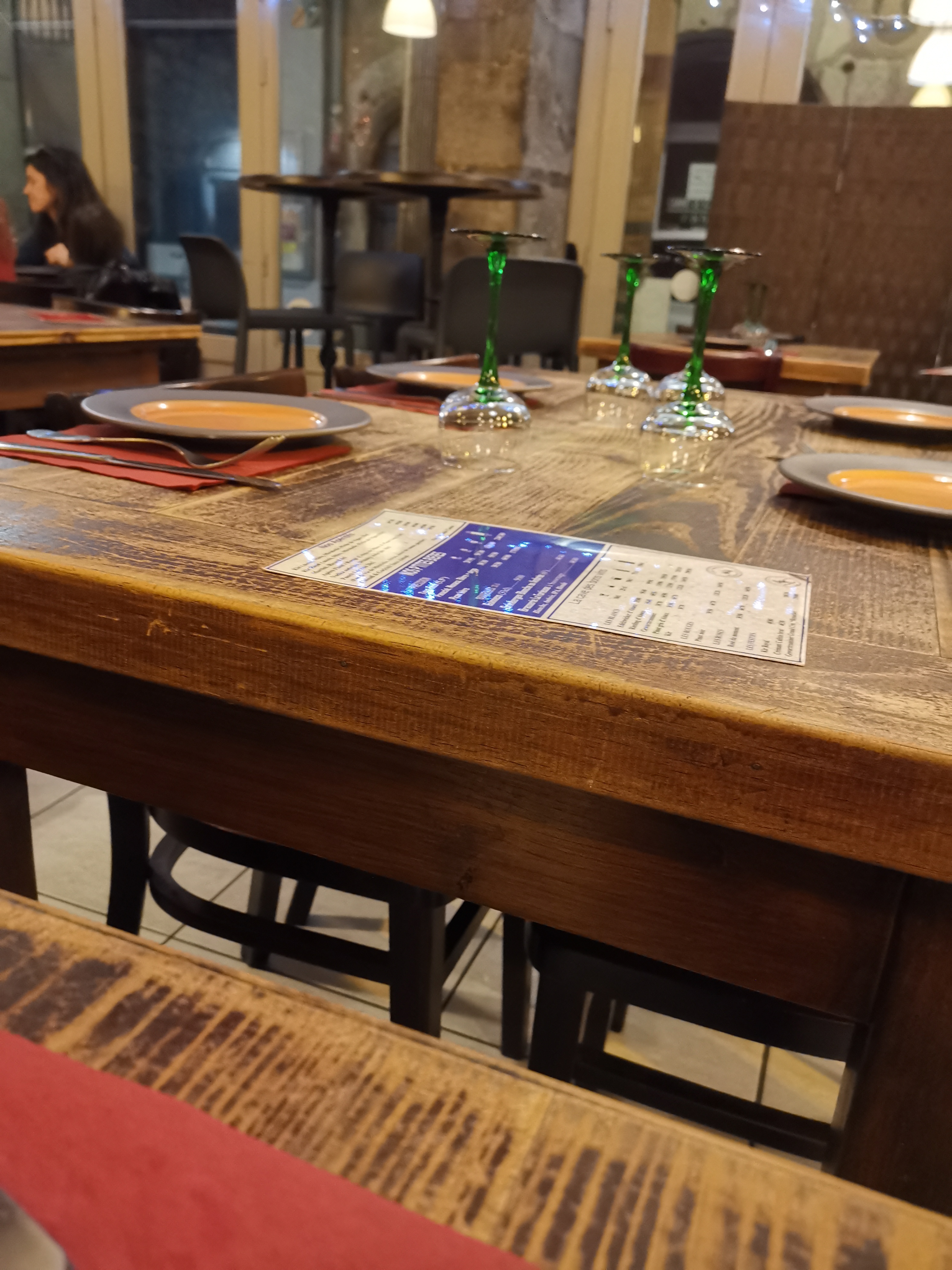 Cadre sympa dans les vieilles rues de grenoble Flams super bonnes Service rapide même si restaurant plein Flams faites à la minute Option sans viande, creme soja, sans oignons Personnel accueillant Pensez à réserver Une ardoise pour la suggestion du moment Seul petit bémol, très bruyant quand des groupes sont dans la salle Je recommande++