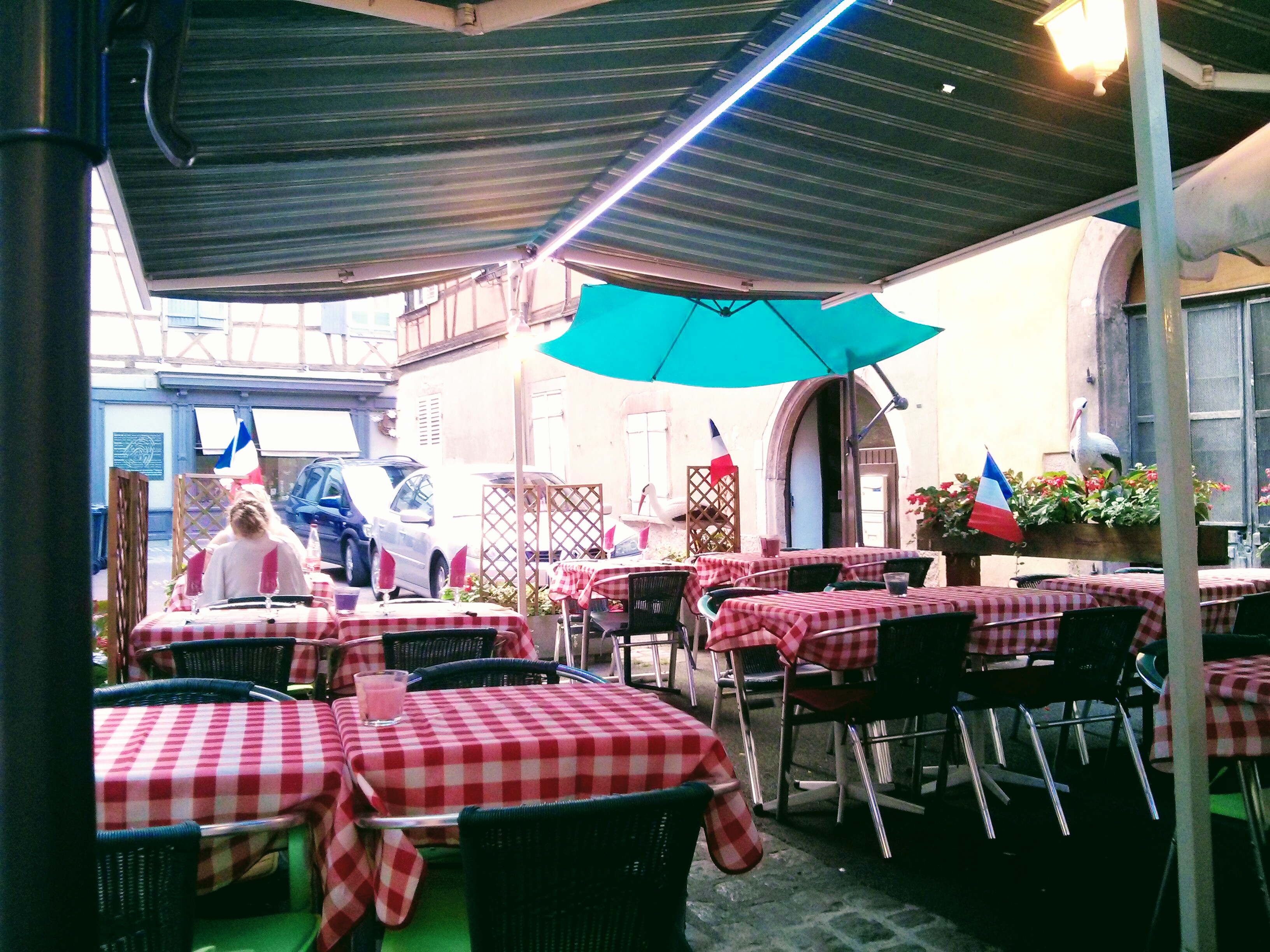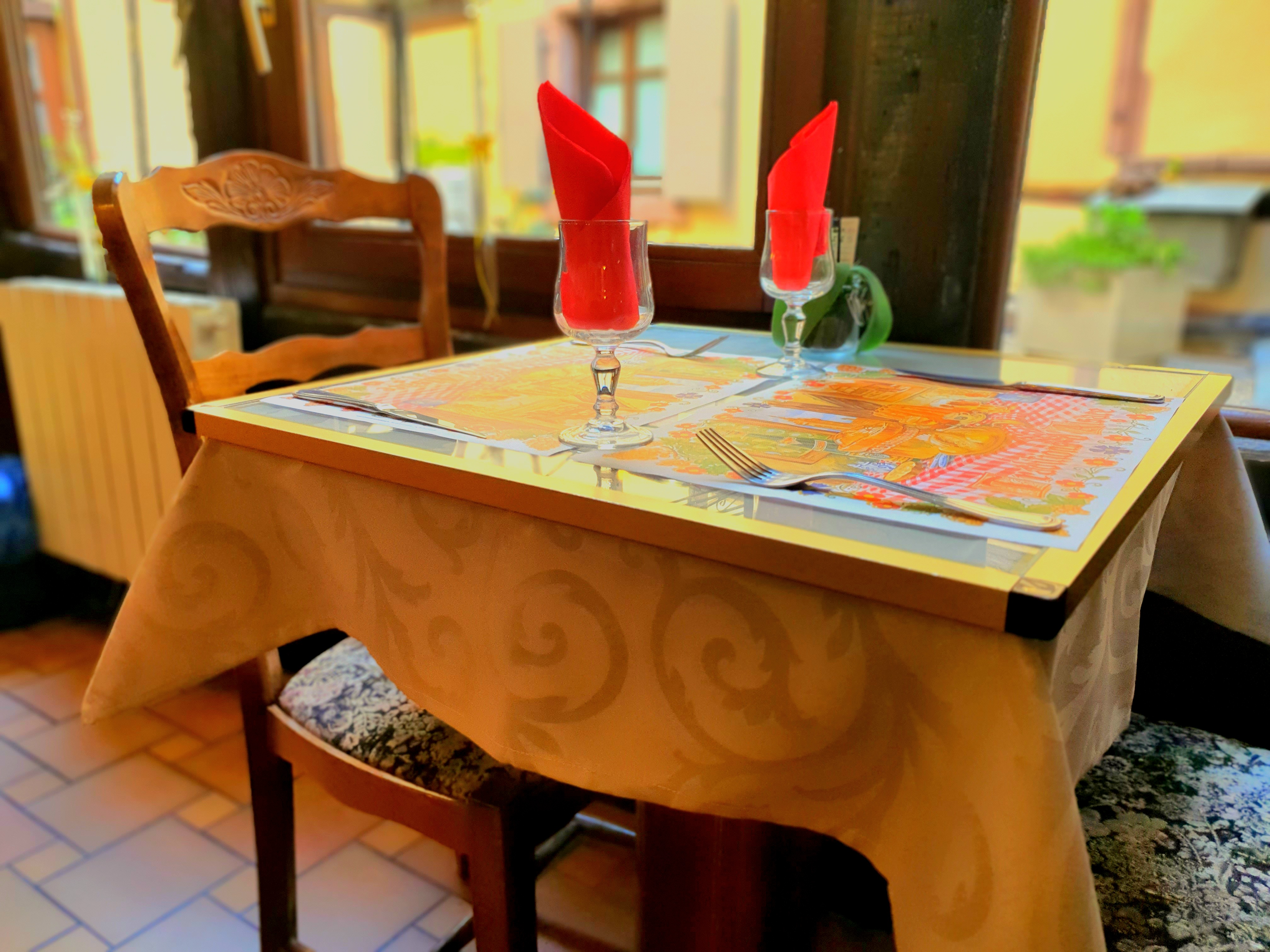 Restaurant atypique au décor alsacien décoré avec finesse et légèreté ce qui n'est pas le cas de tous resto alsacien. La carte est variée et attention au petit appétit les assiettes sont très bien servies un plat voire une salade suffit amplement et je ne suis pas certaine que vous finirez votre assiette même pour les grands appétit. Les tarifs sont très abordable quand on voit de belles assiettes si bien servies. Une assiette pour deux est parfois suffisamment. Je vous conseille de faire une halte sur la terrasse. Les propriétaires vois accueillent avec le sourire et chaleur.