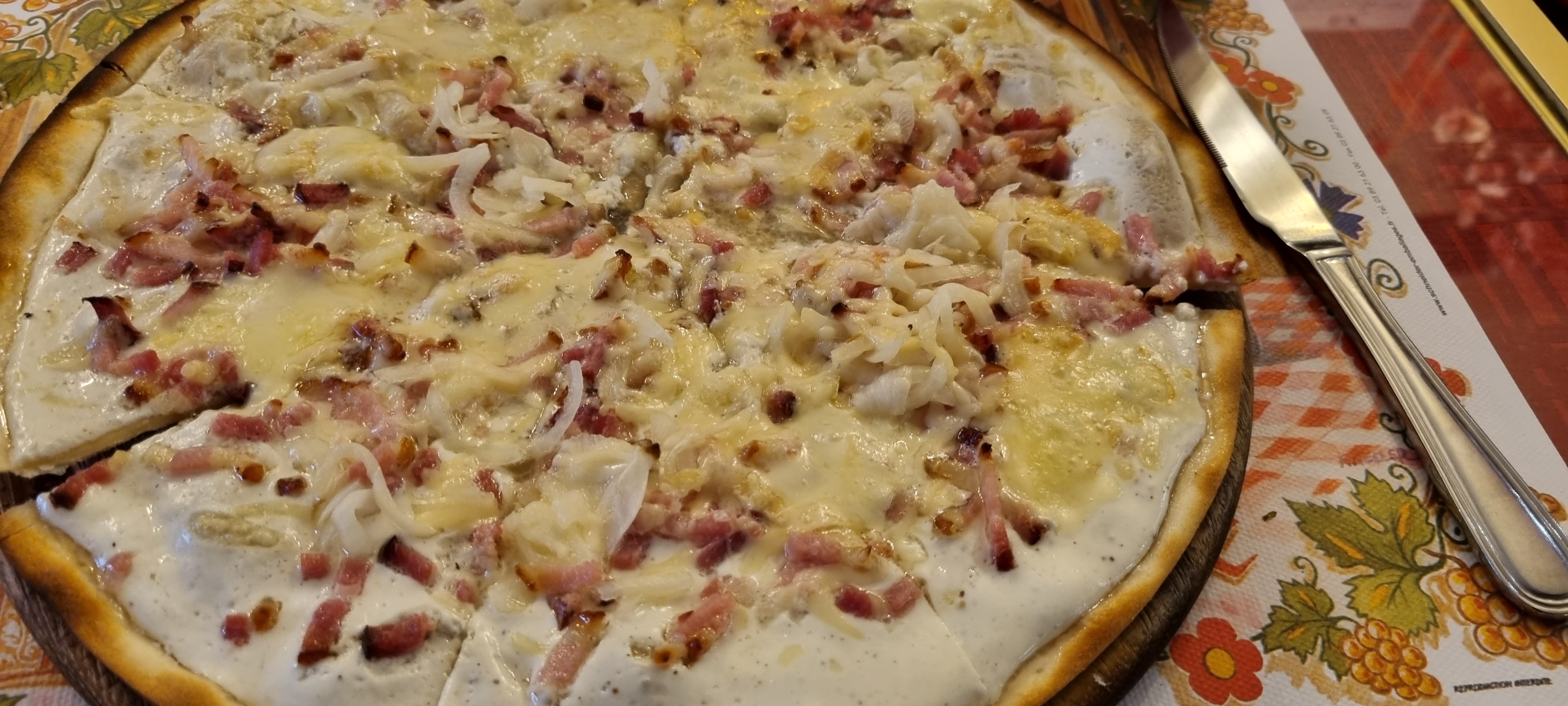 Nous avons cherché les tartes flambées à Colmar désespérément ce soir- là.. l'accueil est correct par contre les tartes flambées sont vraiment pas bons, petites, peu garnie et écoeurantes... achetez chez L'eclerc bcp moins cher et ca fera l'affaire.. Le dernier point négatif : les serveurs sont gentils mais leurs regard persévérant pendant le repas ca gène... je vous déconseille bien évidemment ce resto...