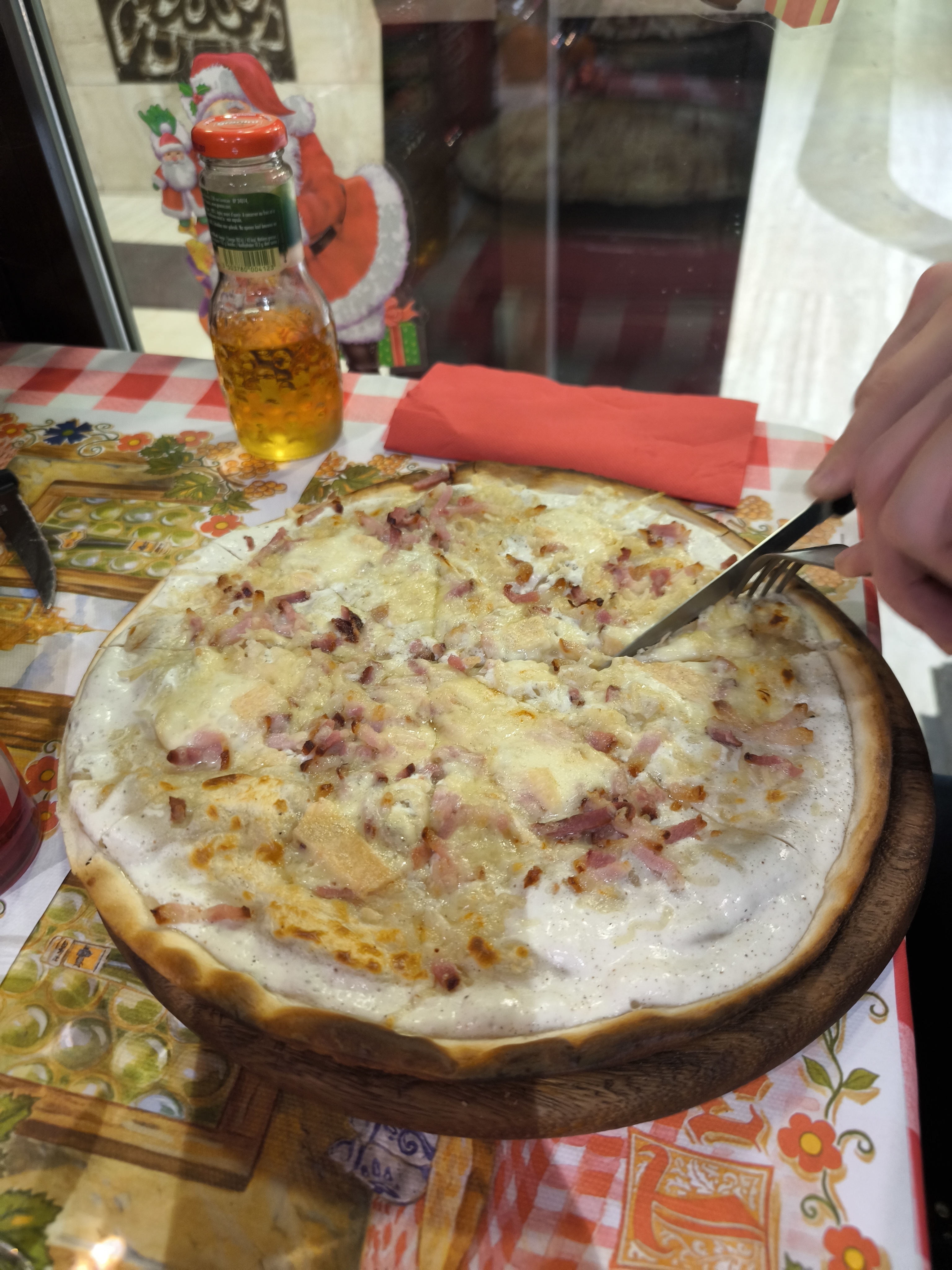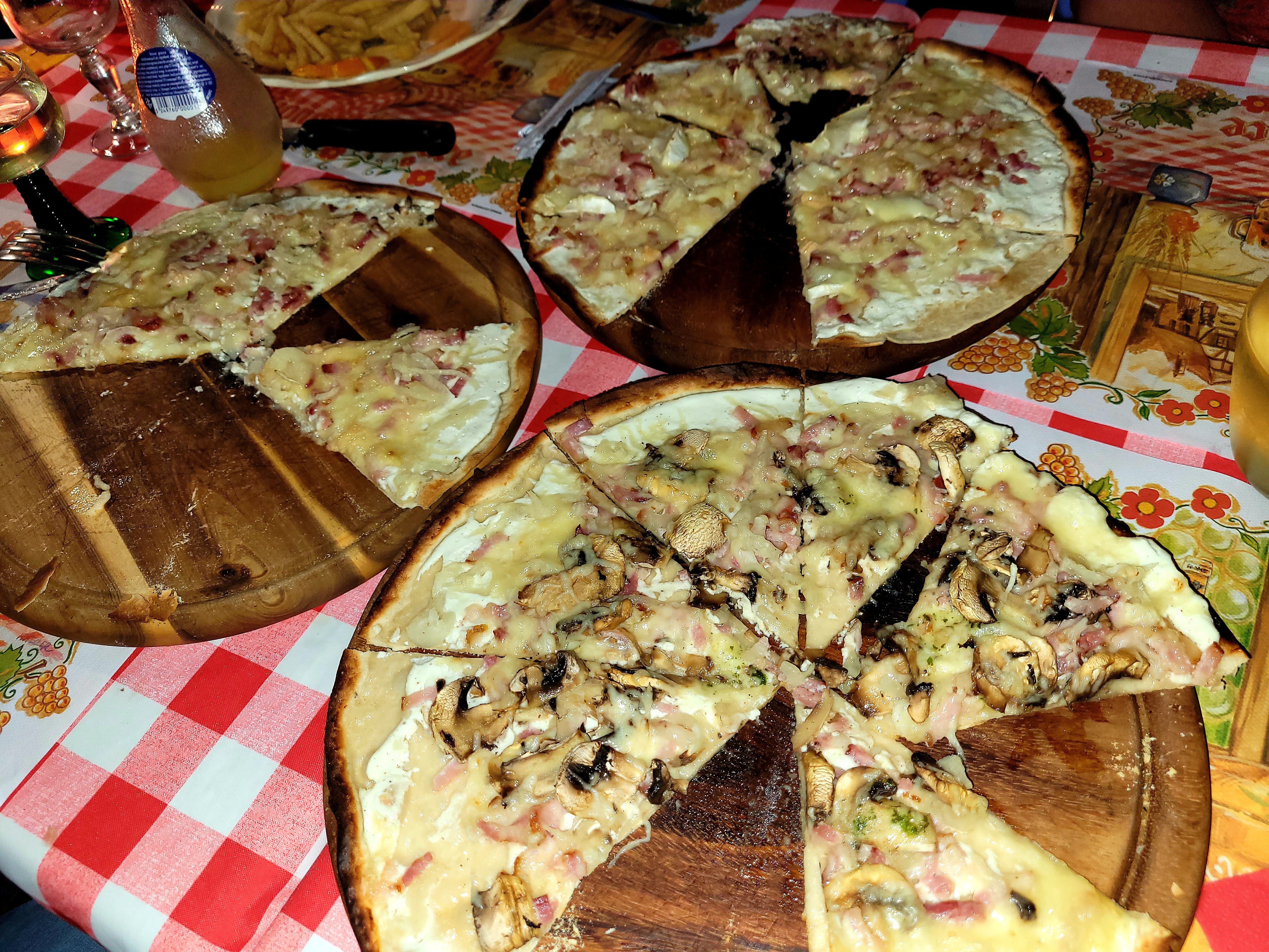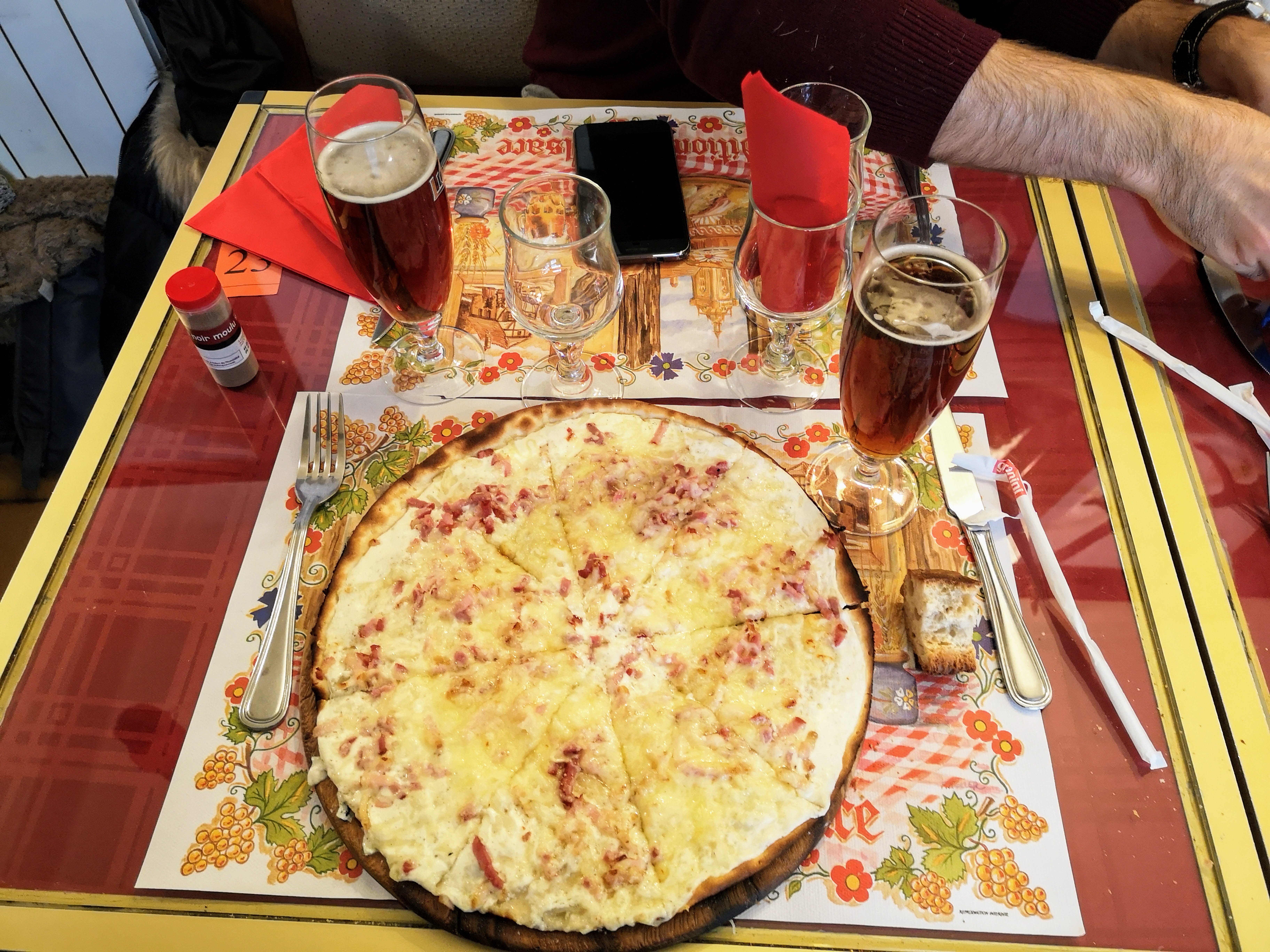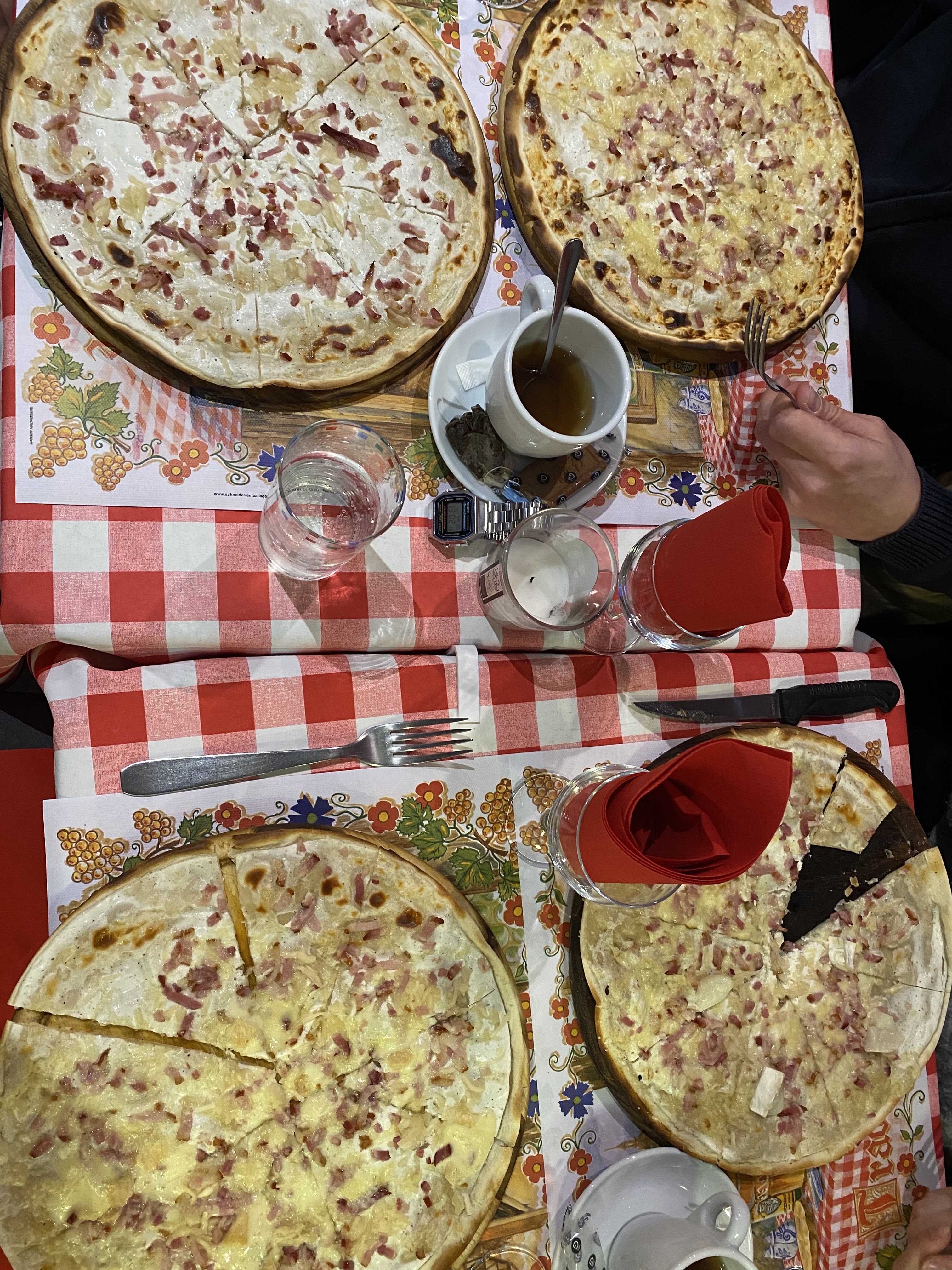 Tartes flambées un peu salée Carafe d eau un peu juste pour 4 personnes ça oblige le serveur à revenir 2 fois Bravo au serveur qui a super bien géré malgré le monde période Noël.