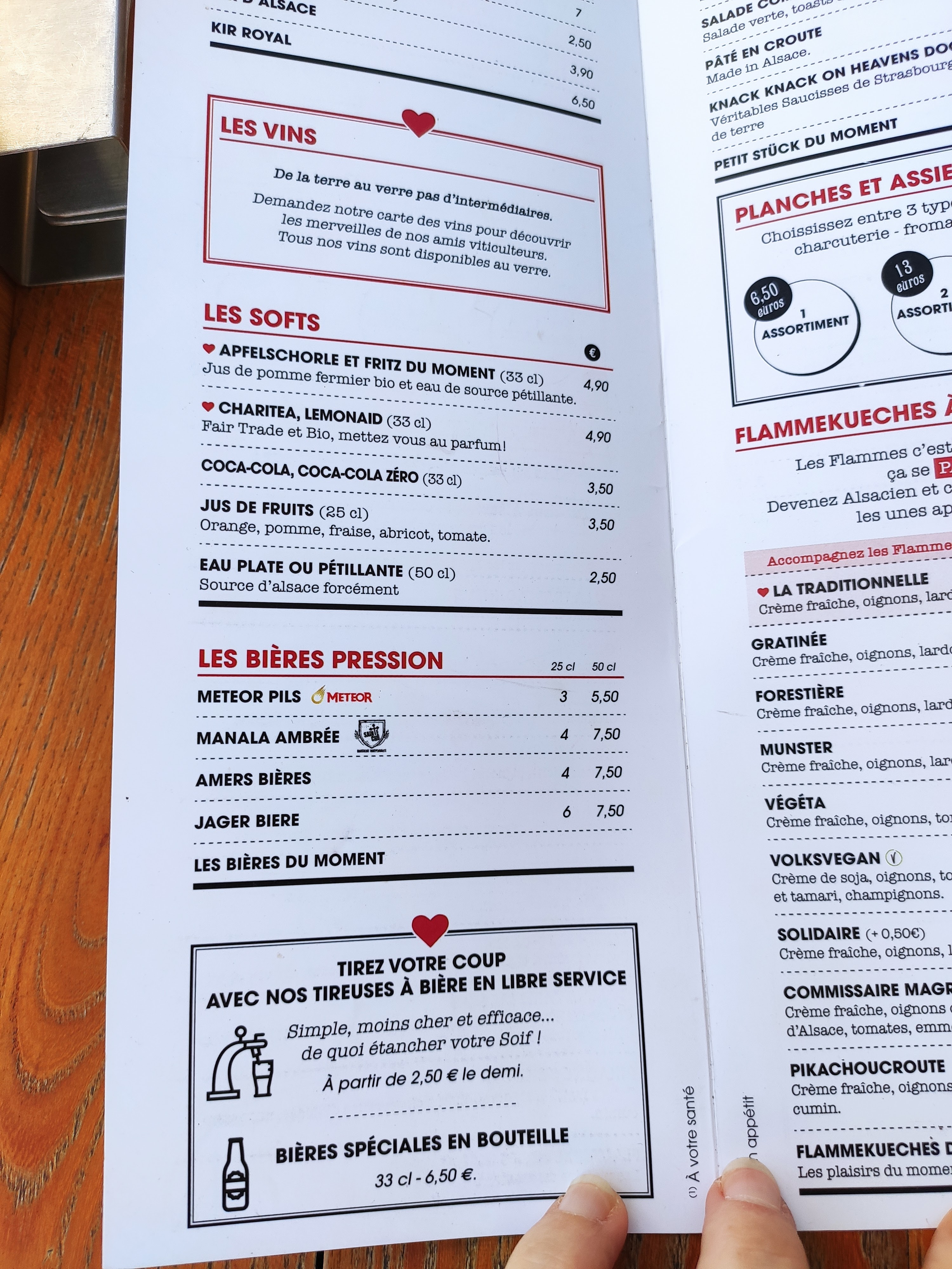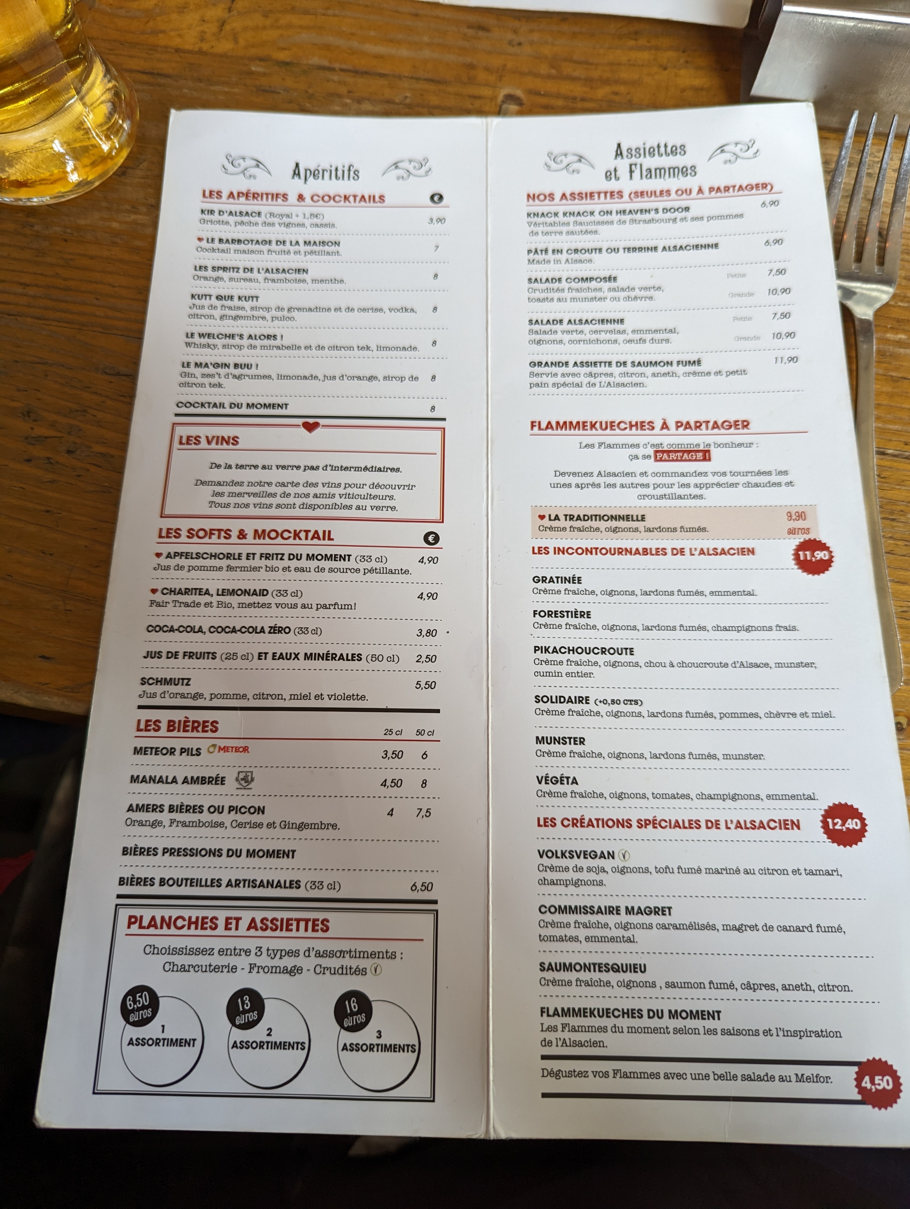 Concept fort sympathiques et croyez les serveurs quand ils vous proposent de partager les flammenkueches c'est le meilleur moyen d'en découvrir plusieurs en un seul repas ! De plus les prix sont abordables et le service rapide. N'hésitez pas !
