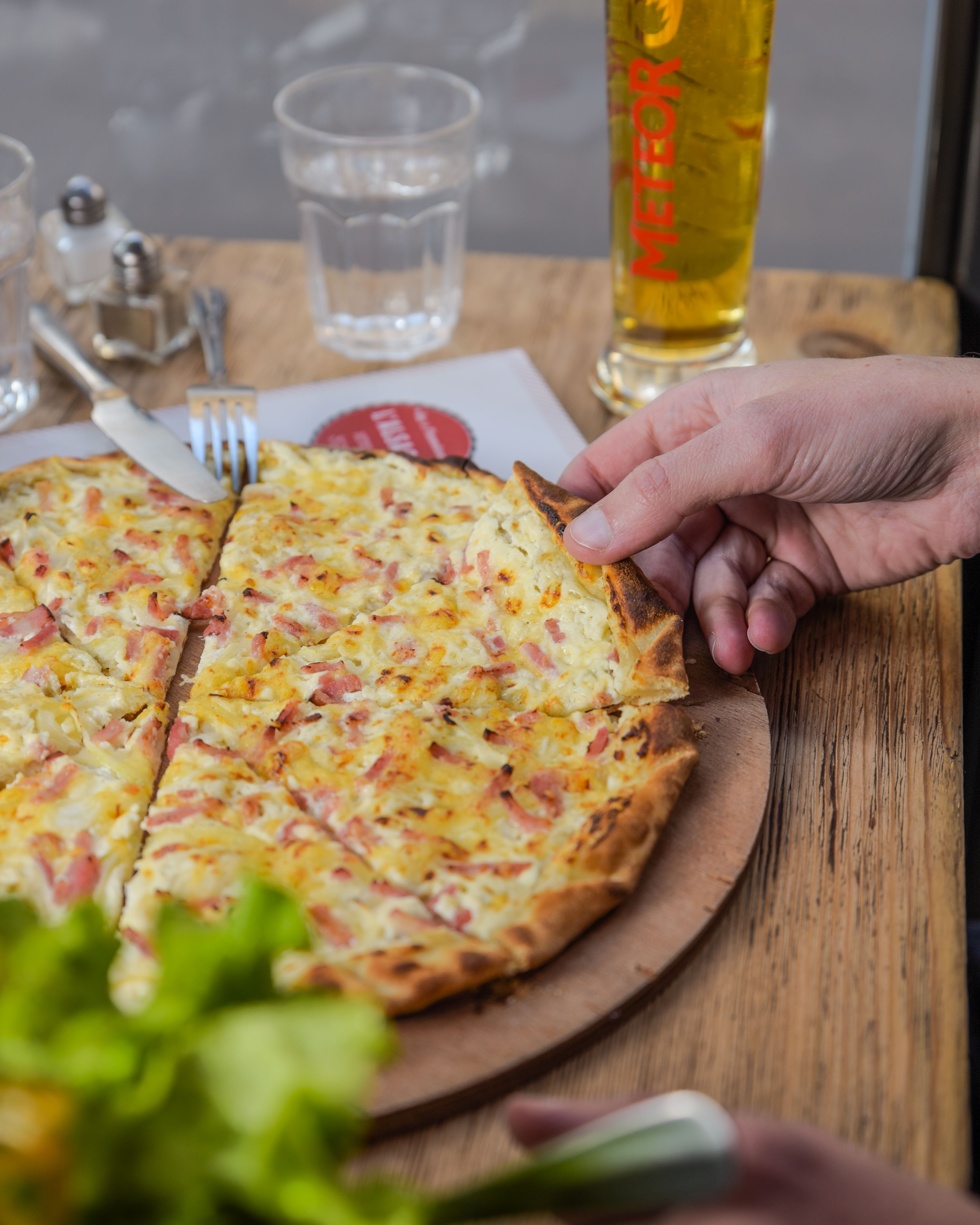 J'en avais entendu parler maintes fois c'était donc avec attention que j'ai testé ce restaurant. Les prix étaient honnêtes, j'ai payé une vingtaine d'euros pour 1 bières, une assiette de charcuterie (partagée à 4) et une tarte flambée. Aspect atypique, les tartes flambées sont servies 2 par 2 et sont communes à la table (après notre autorisation bien entendu), tout le monde peut donc se servir à sa guise, se qui permet à la fois d'accentuer la convivialité et de goûter à moindre coût les différentes tartes flambées proposés. Pour un repas entre amie l'ambiance sera donc parfaite ! Les Flammenkuchs sont bien garnies, il est possible de choisir entre 6 modèles + la tarte du jour ce qui est positif. Les serveurs sont sympathiques et très disponibles, l'attente est raisonnable. Le restaurant est parfaitement positionné près du Pont Battant. Les tables sont séparés par des vitres pour garantir une isolation sonore, possibilité de réserver en ligne et de manger en intérieur où extérieur. Honnêtement je cherche mais je ne trouve pas de point négatif. Je recommande totalement.