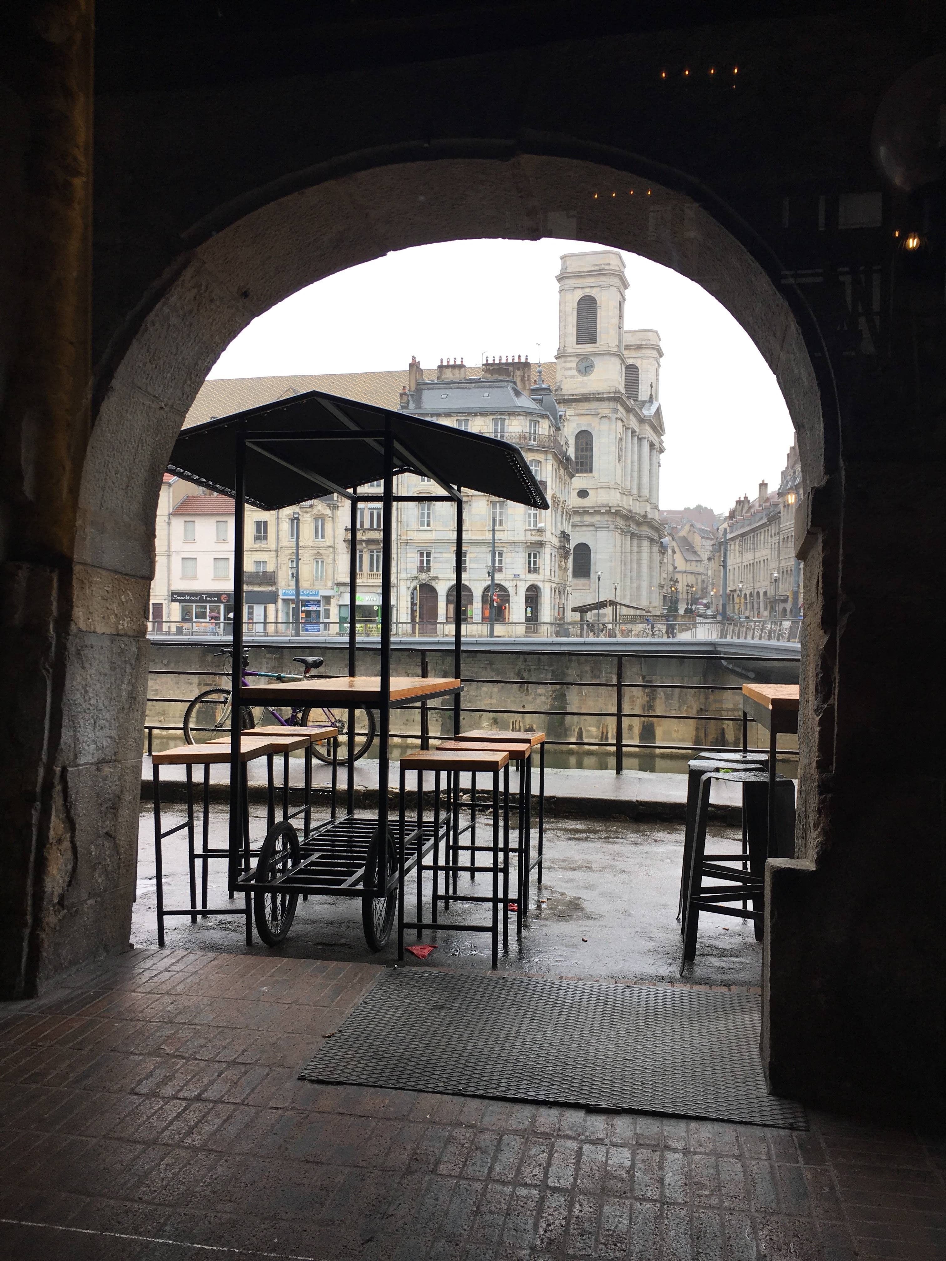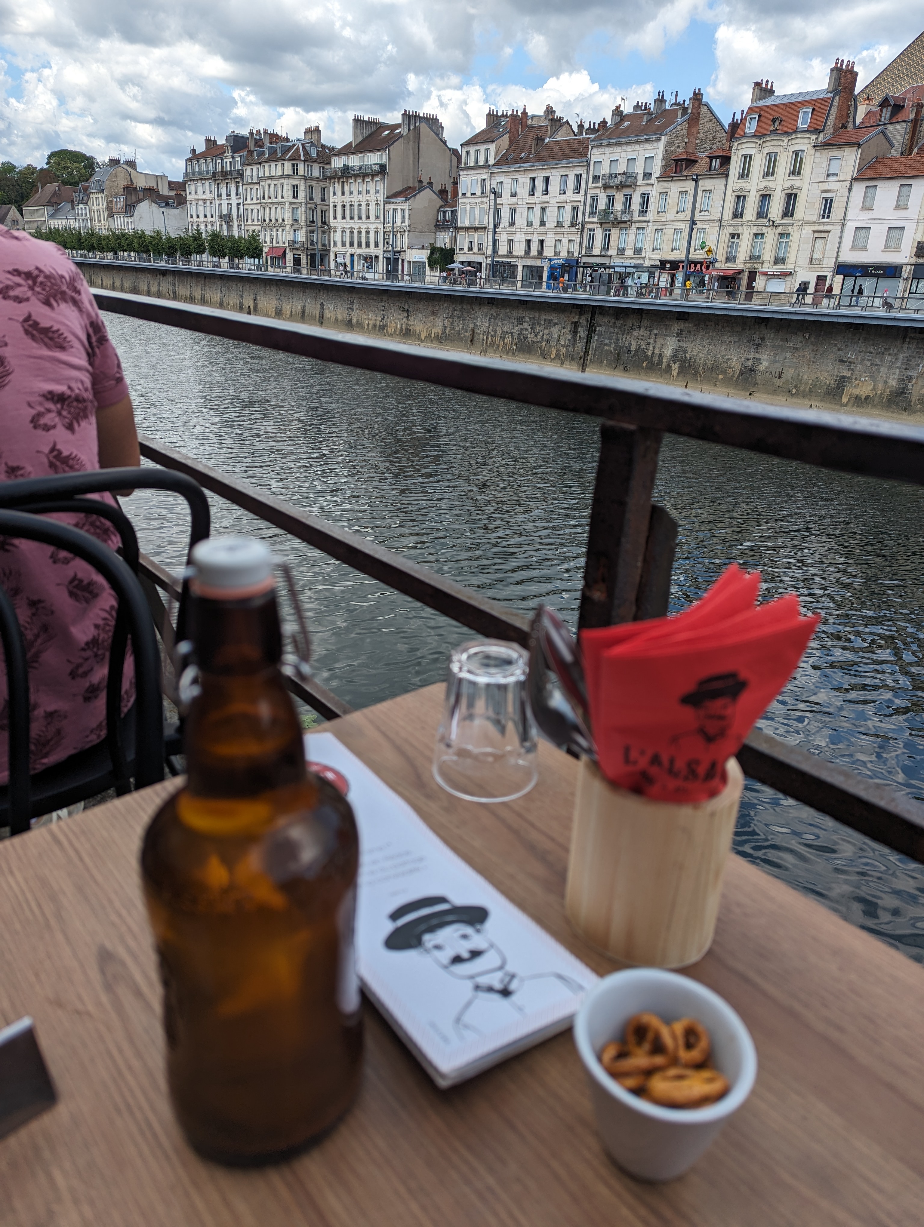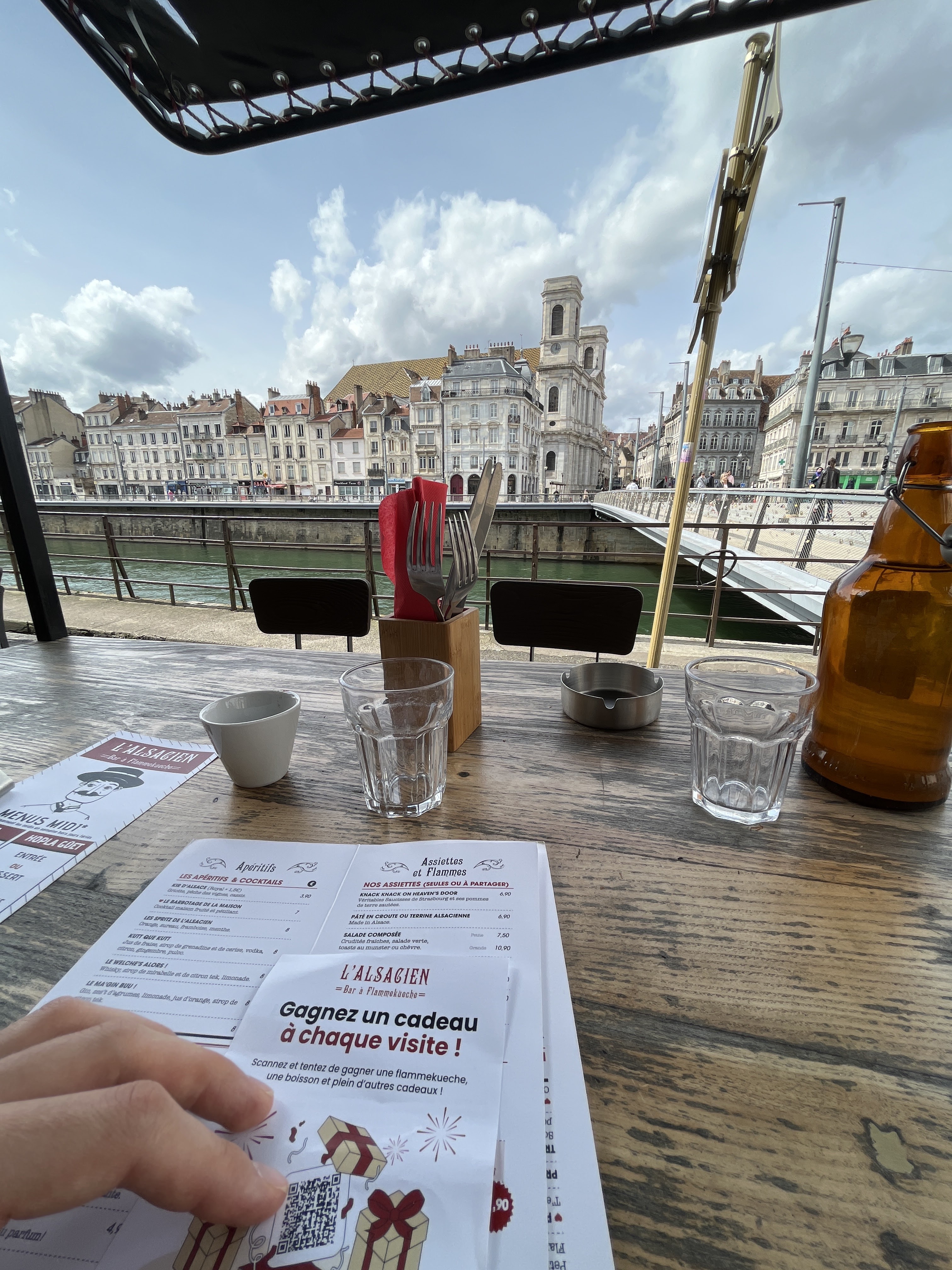 C est sûrement la plus belle terrasse de la ville. Avec vue sur le pont battant m, le Doubs, l'église de la Madeleine et une partie du quartier battant. Bonnes flamenkuches, tarifs corrects et service souriant et très pro.