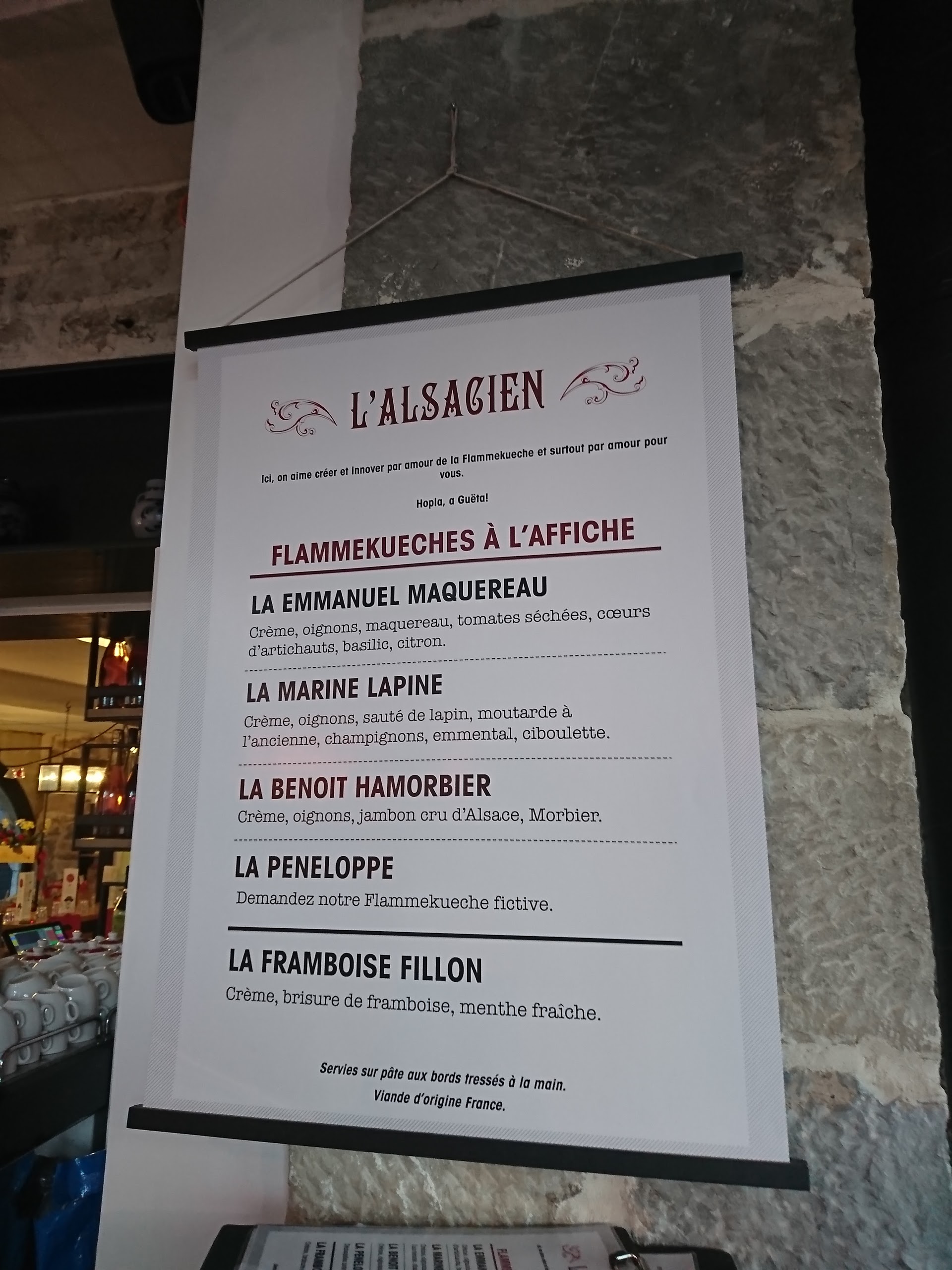 je passais souvent devant ... comme en Alsace flammenkuche traditionnelle à partager ( si gros mangeur vaut mieux en prendre 2 ) excellente et un verre de gevurtzwinner exquis En dessert une flammenkuche sucrée pomme et sucre de canne ( grains se sucre croustillants) avec boule de glace alsacienne un régal Le tout avec une très belle vue ( photo prise de la terrasse côté quai) et pour une addition dune vingtaine d'euros rien à redire. serveuse super sympa en prime