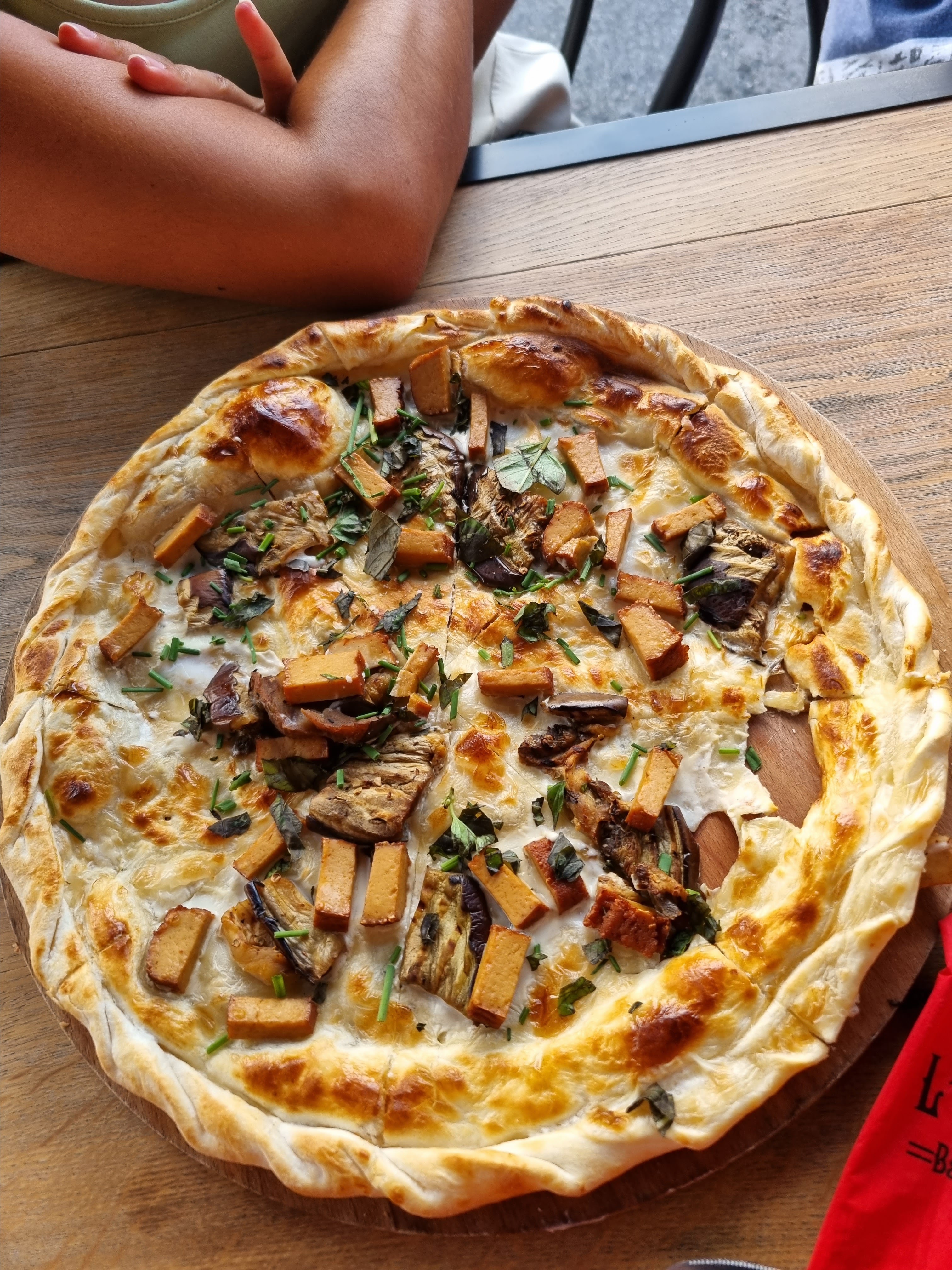 Bonne expérience : on est arrivés sans réserver et on a eu de la chance d'avoir une table car tout est vite complet, après nous beaucoup de personnes sans réservation n'étaient plus acceptées. Il y avait du monde donc on a patienté un peu avant qu'on ne prenne nos commandes, ça nous a laissé le temps de regarder la décoration bien réalisée. Les chiens sont acceptés et bien accueillis : merci pour la gamelle d'eau ! Quelle bonne surprise de voir qu'en plus des flam's végétariennes, il y en a une vegan (qui est bonne). La philosophie du lieu est le partage et donc on ne déguste qu'une tarte flambée à la fois pour partager avec la table, heureusement pour moi mon conjoint en avait choisi une sans viande, on a profité de l'expérience grâce à ça, sinon ça aurait été impossible. J'ai été un peu surprise par la pâtes repliée sur les bords de la tarte flambée, ce qui lui donne un aspect de pâtes feuilletées et qu'on ne voit pas en Alsace. Malgré tout c'était très bon, on recommande ! PS: on a bien bu aussi, les bières en pression sont bonnes.