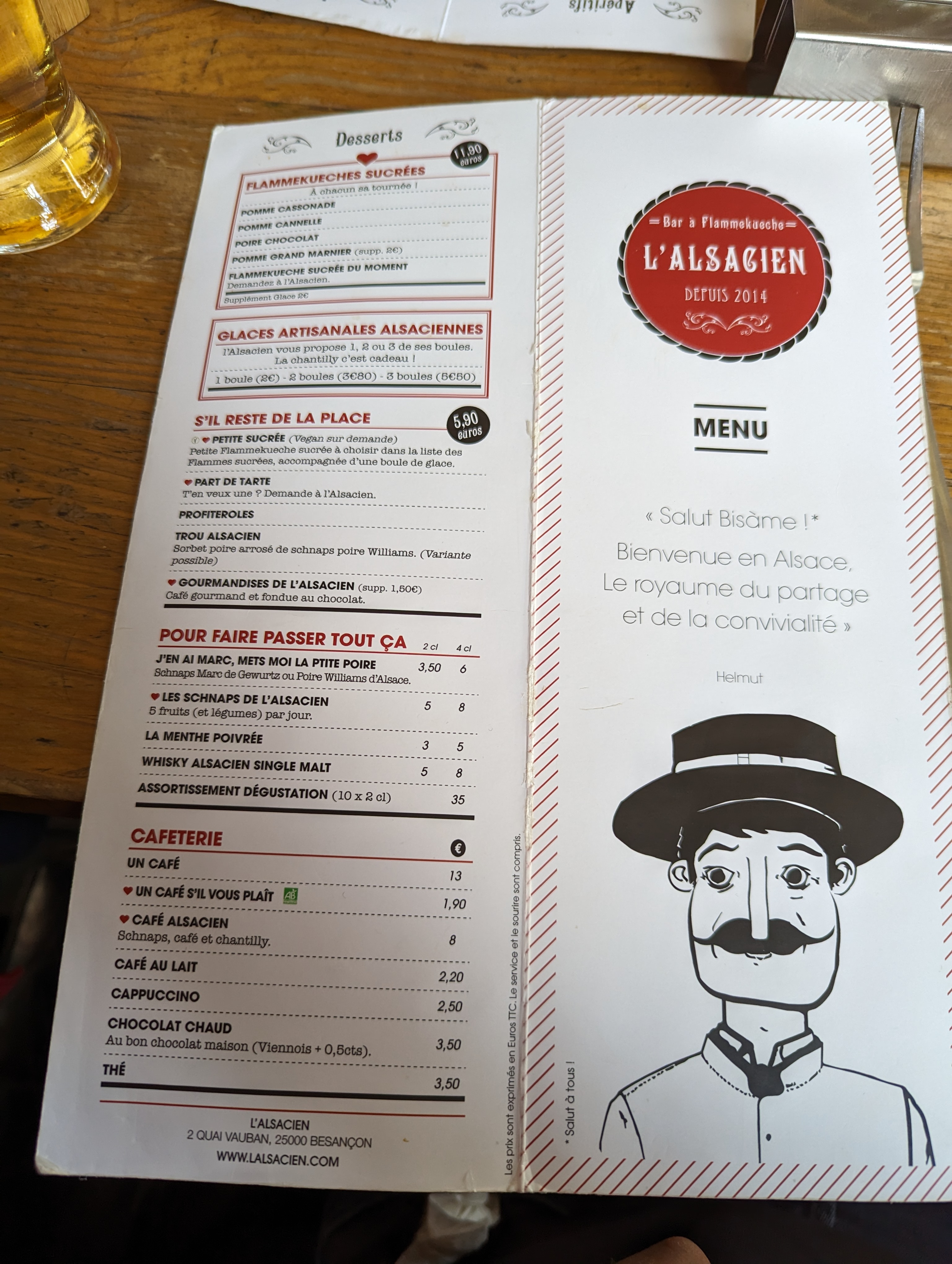 Des spécialistes alsaciennes dans la cité bisontine ! J'étais plutôt tenter par une pizza dans un restaurant situé à proximité, j'ai plutôt décider de manger dans ce restaurant pour voir ce qu'il avait dans le ventre. La déco est sobre et fait le travail. On peut se servir soi même de la bière pour grappiller quelques pièces et faire baisser la note, on peut s'essayer donc à se servir une pression ! Côte cuisine, on retrouve toutes les saveurs d'une tarte flambée, assez bien garnise. Mention pour celle à la truite ! Cependant 2 points négatifs : les prix, un peu élevé contrairement à certaines références à Strasbourg. mes profiteroles, j'aurait penser qu'elle était généreuse et fait maison mais je doute guère.... Dommage le cadre est sympa, les plats aussi. Le dessert casse cette belle dynamique.