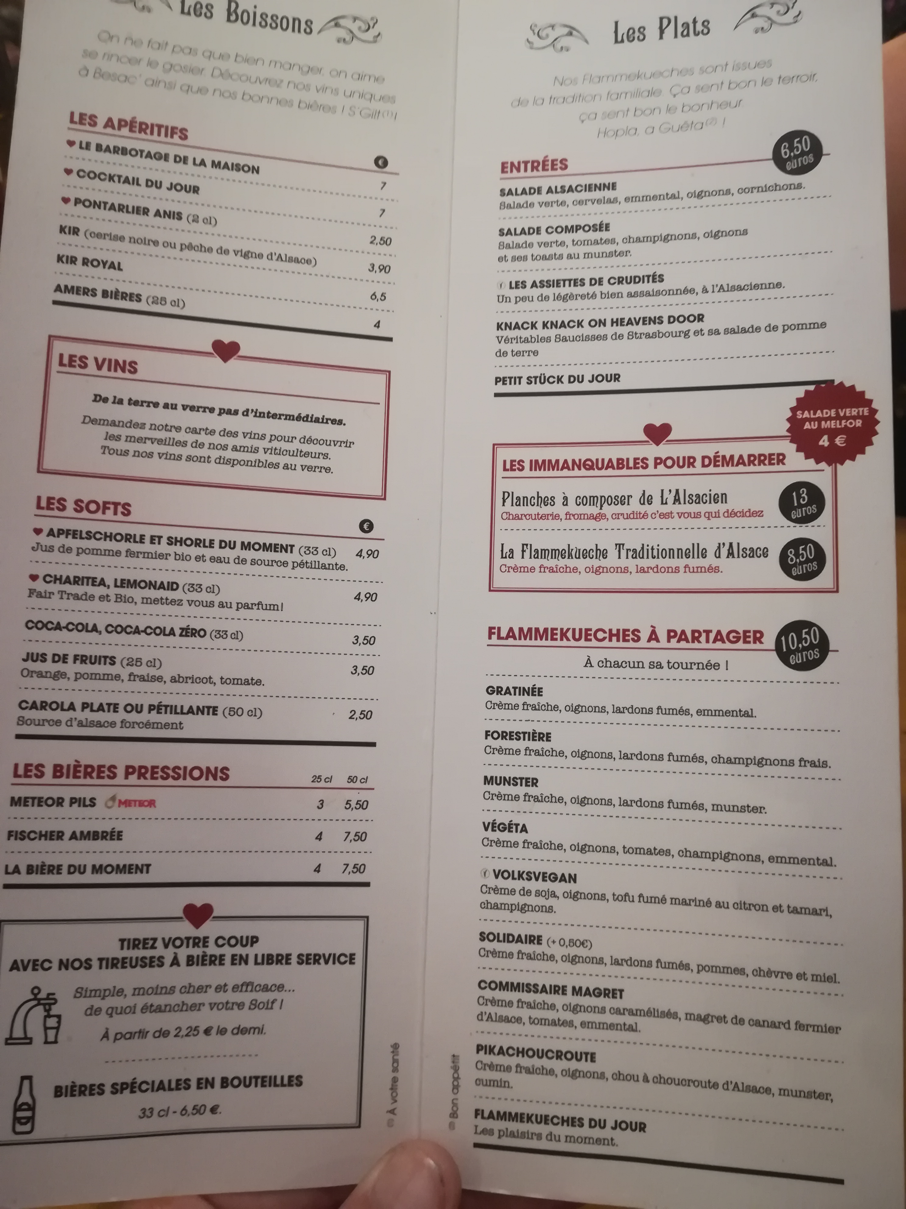 Flammekueche annoncé au prix de 10.50€ surprise à l'addition quand nous avons du les payer 10.90€, encore cela est acceptable, mais autre surprise sur la salade qui n'est pas affiché sur la carte mais apporté sur la table, au prix de 4 € pour quelques feuilles qui se battent en duel dans le saladier ! Pas de possibilité d'avoir chacun sa flammekeuche, car ça se partage, donc une attente de 15 minutes entre les tartes flambés, nous ne reviendrons pas malgré le faite qu'elles étaient plutôt bonne, je déconseille !