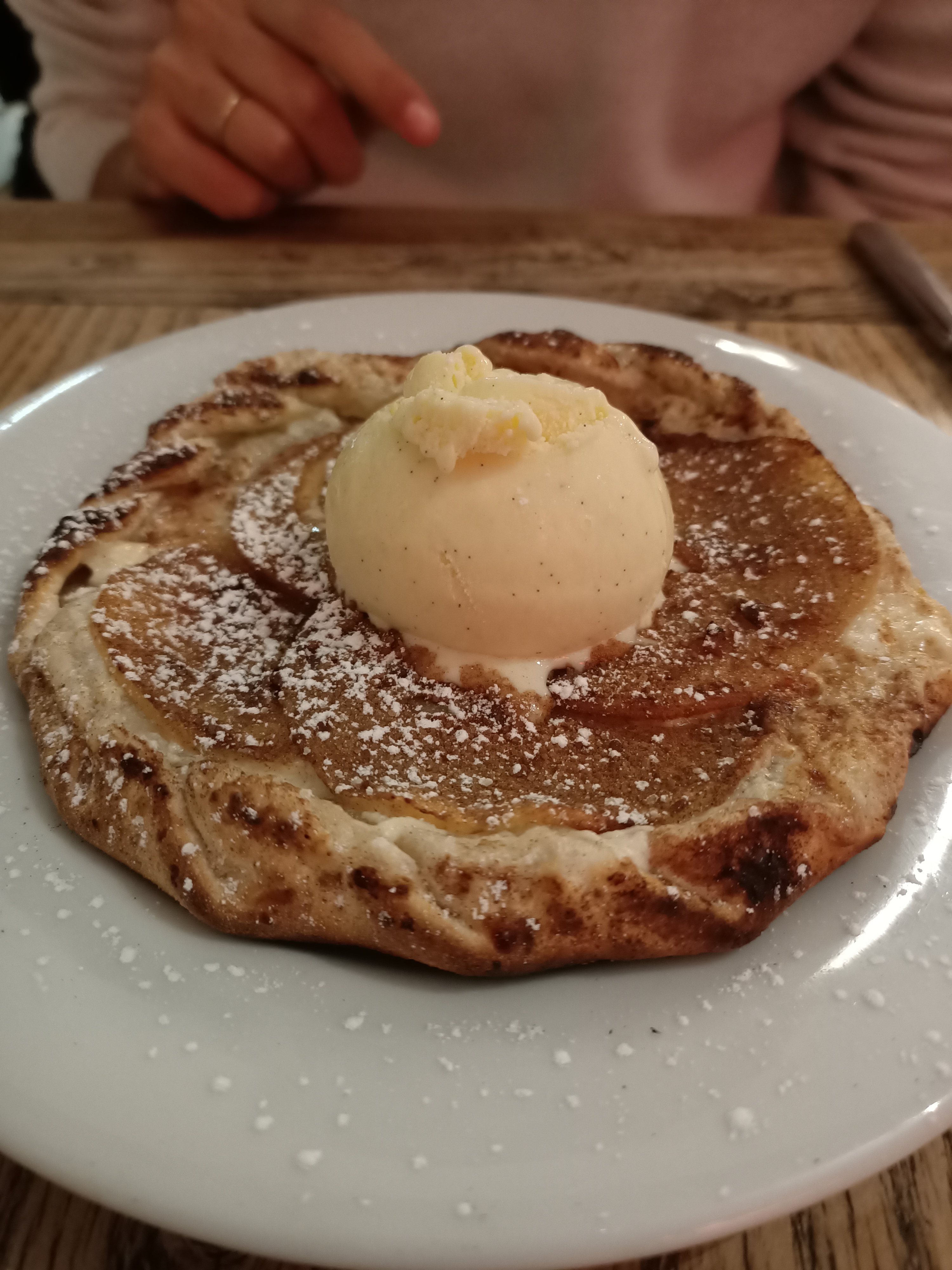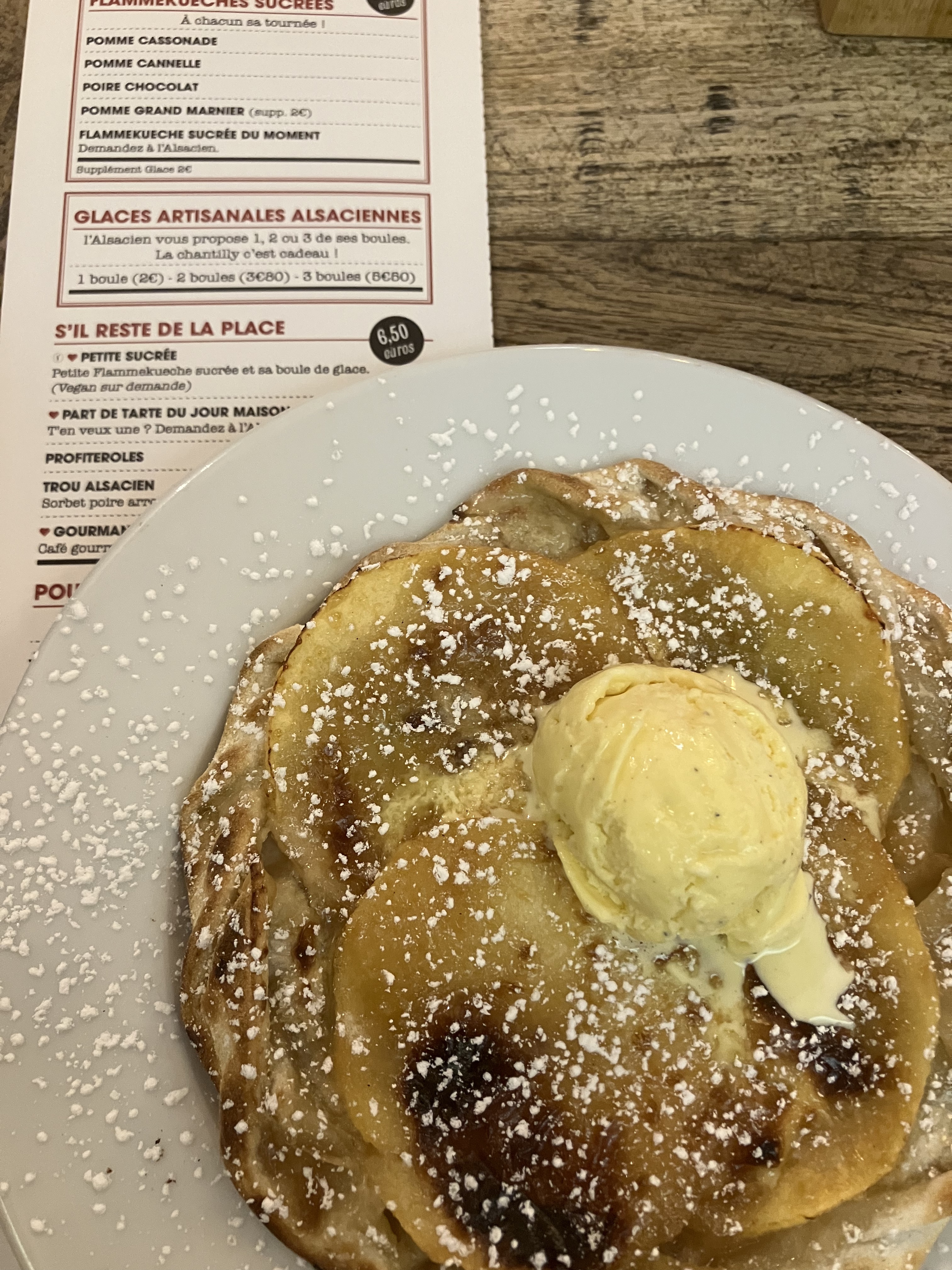 De bonnes tartes flambées ou flammenkuches, comme celle que vous trouvez à Strasbourg ! Un bon rapport qualité prix, comptez 11€ pour la traditionnelle et 13€ pour les autres. À deux, vous pouvez opter pour 5€ de plus avec une salade verte partagée ! Les tartes desserts sont moins bonnes je trouve, pas dans nos goûts. Attention, vous affichez « fraise, crème citron, menthe » en pancarte dans le restaurant, précisez qu'il s’agit d’une flammenkuche en dessert et pas un dessert servi en mode patisserie/dessert classique sans la base d’une flammenkuche. Cela porte à confusion et nous en avons fait les frais. Elle n’était pas aussi alléchante que ce que la pancarte vendait. Mais dans l’ensemble c’était bon, serveuse sympathique. Dommage qu’il n’y ait pas de terasse.
