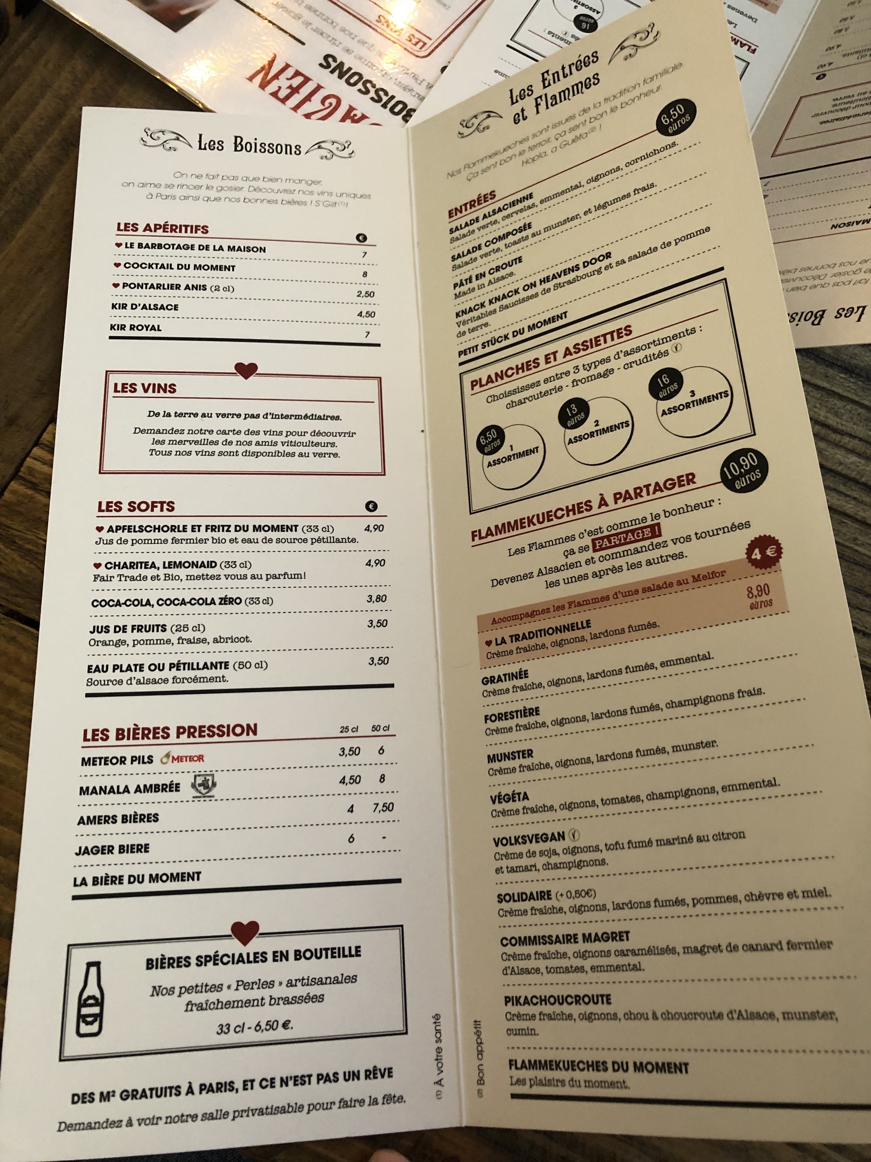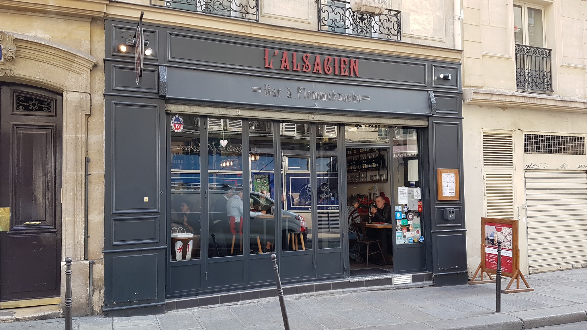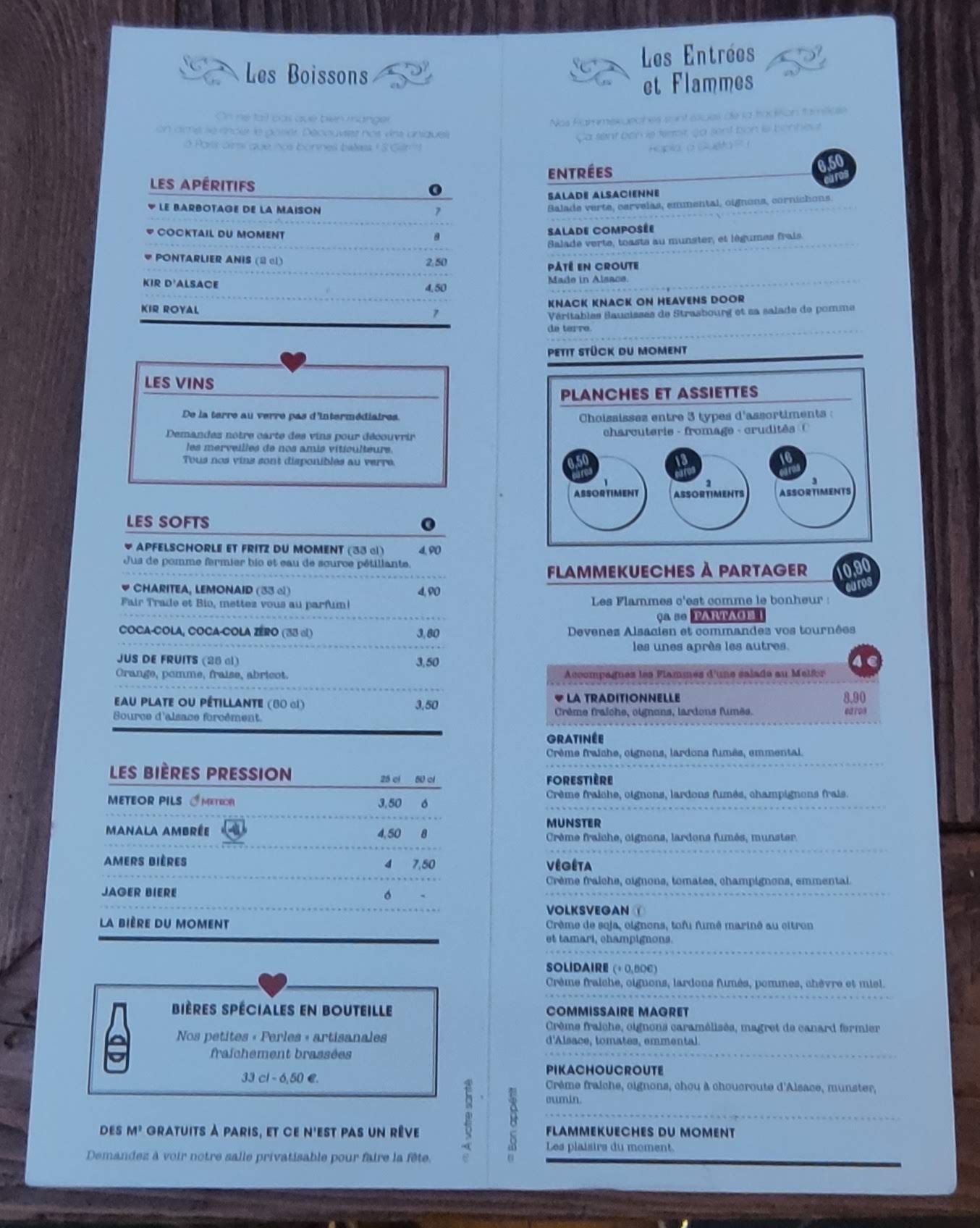 Le plus ancien restaurant de tarte flambée à Paris , apparemment. Une carte pleine d humour et des tables étroites pour partager les tartes flambées aux noms amusants. Service peu réactif mais bonnes tartes flambées. Bon rapport qualité prix.