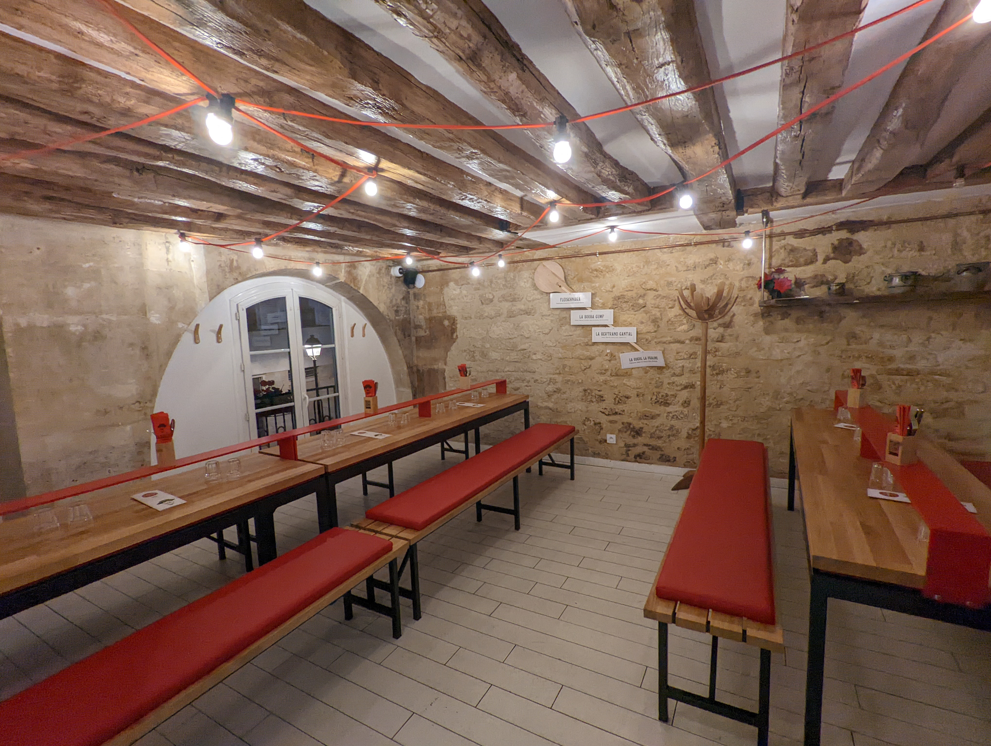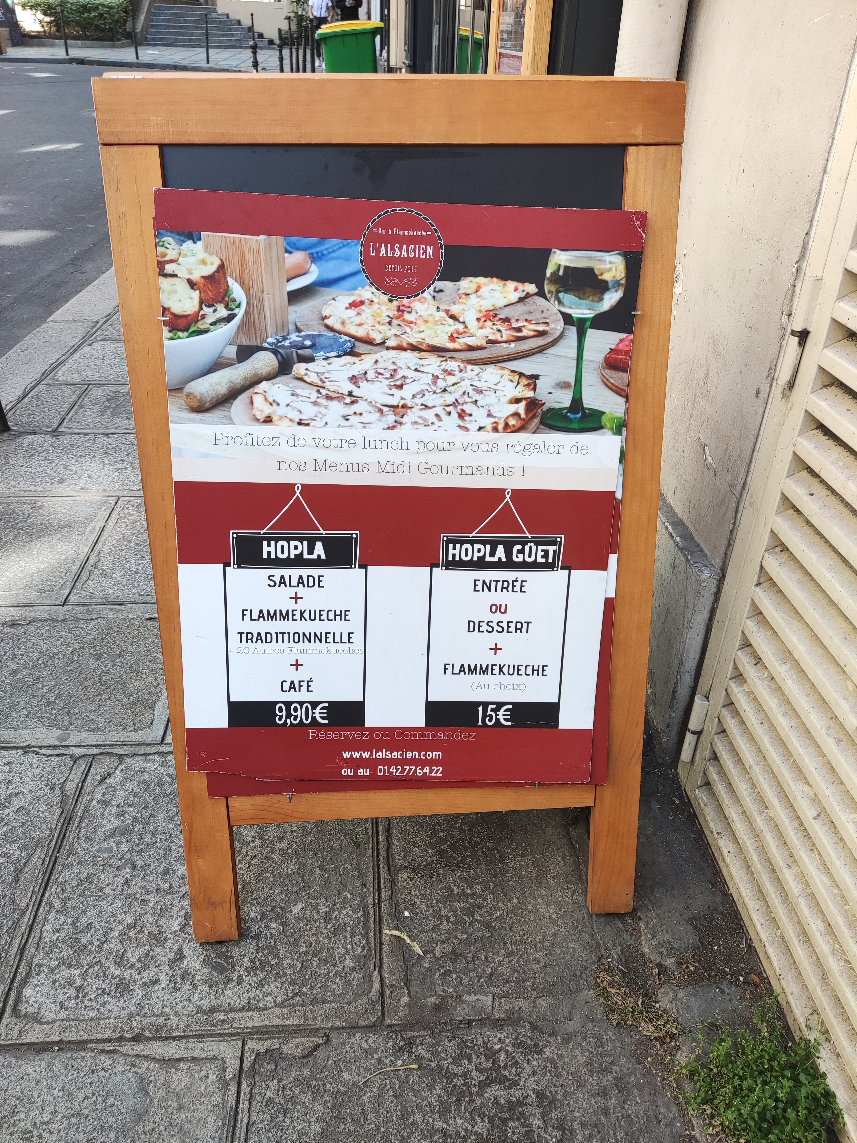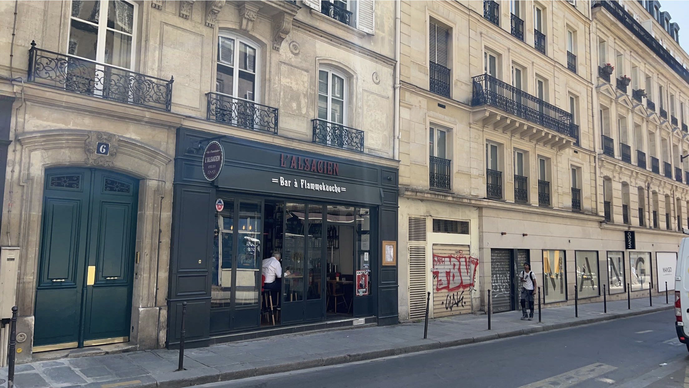 Le plus ancien restaurant de tarte flambée à Paris , apparemment. Une carte pleine d humour et des tables étroites pour partager les tartes flambées aux noms amusants. Service peu réactif mais bonnes tartes flambées. Bon rapport qualité prix.