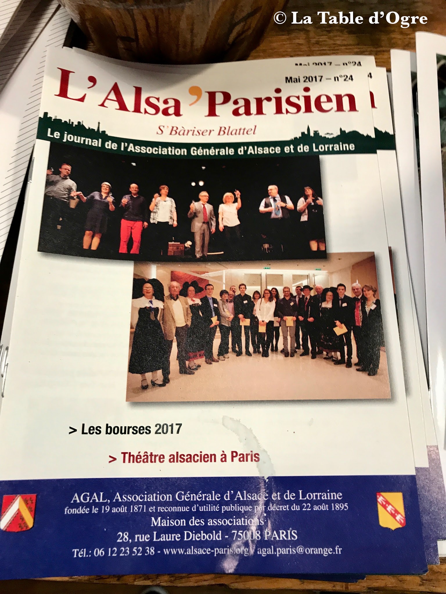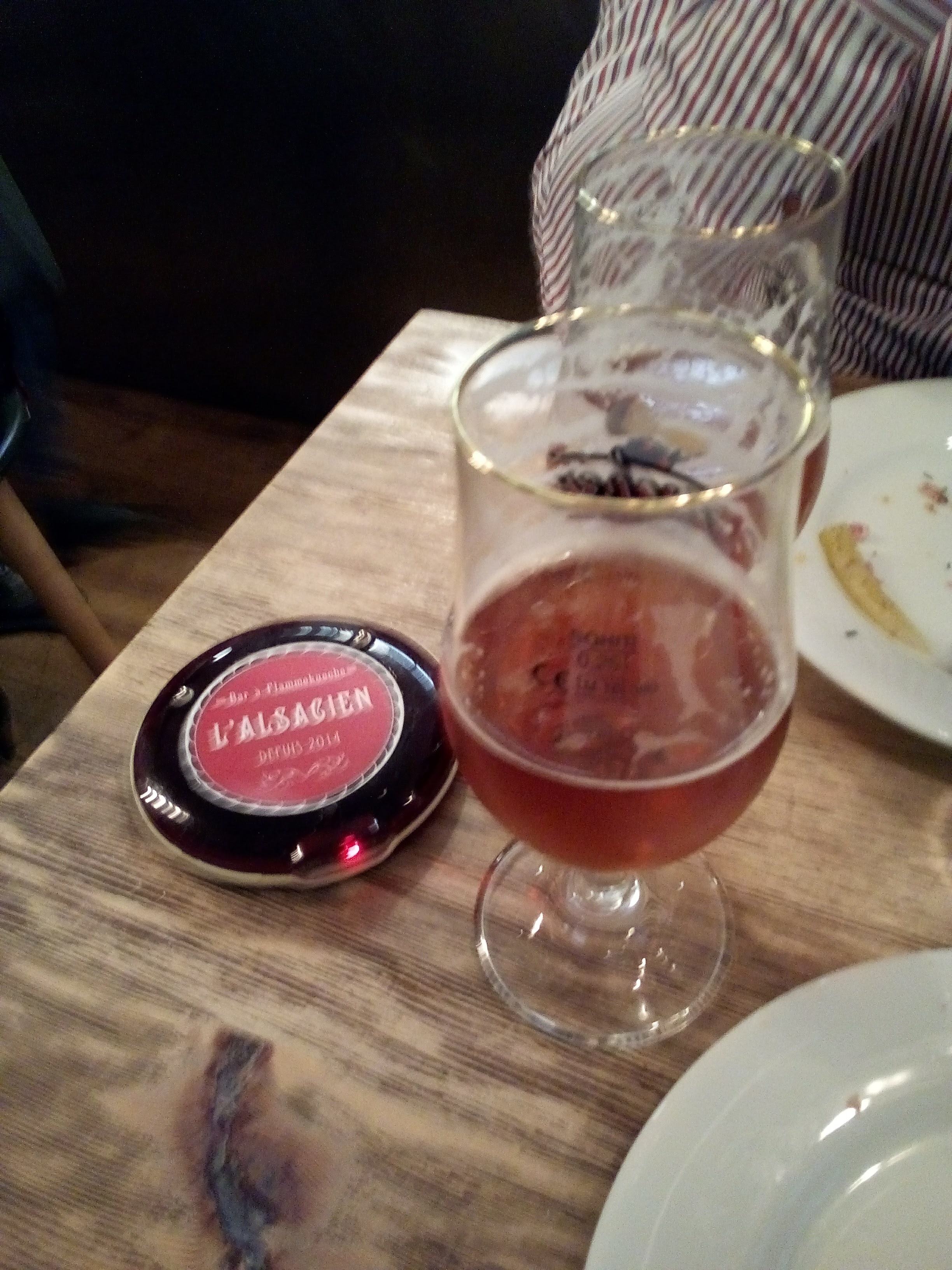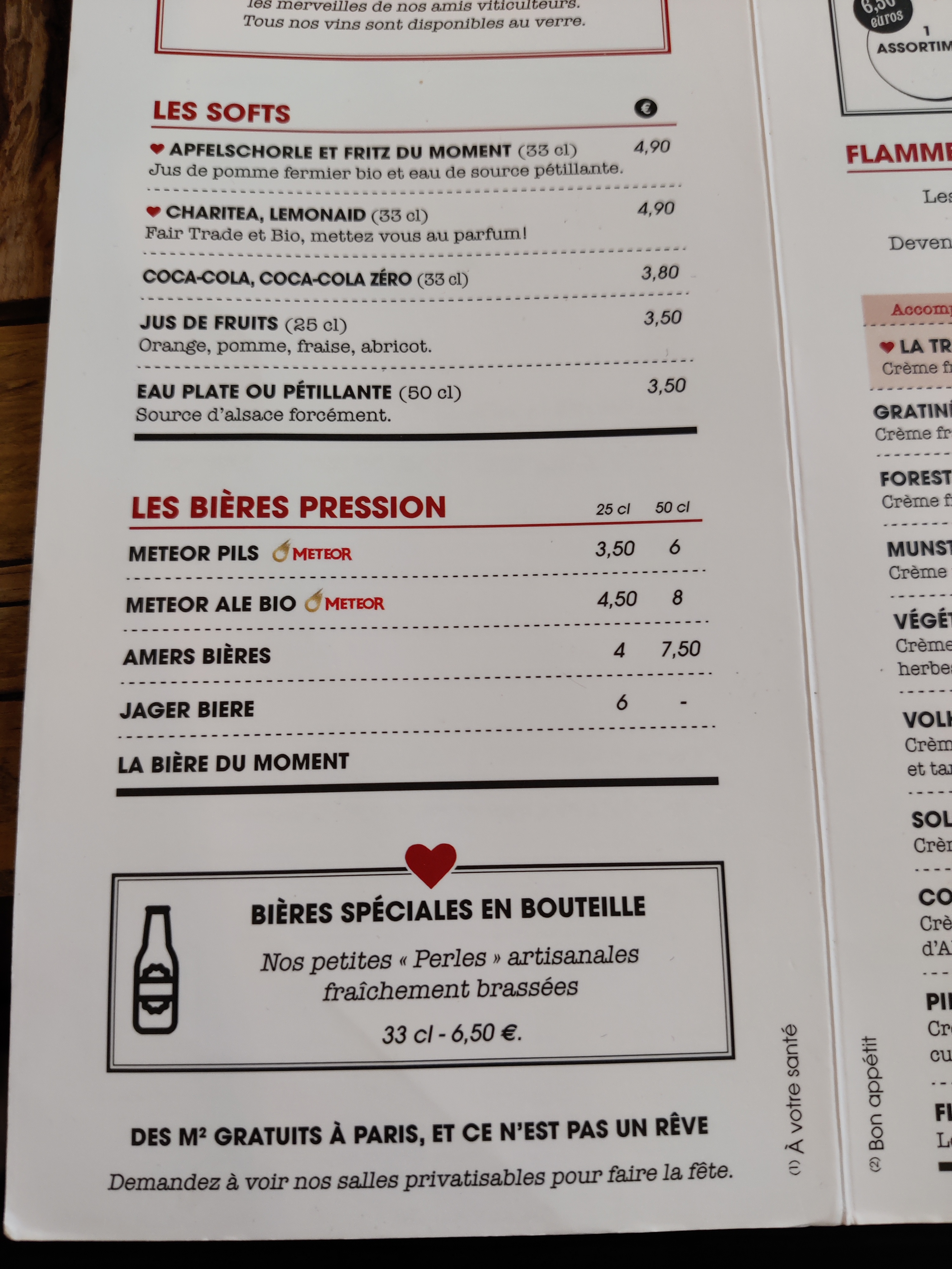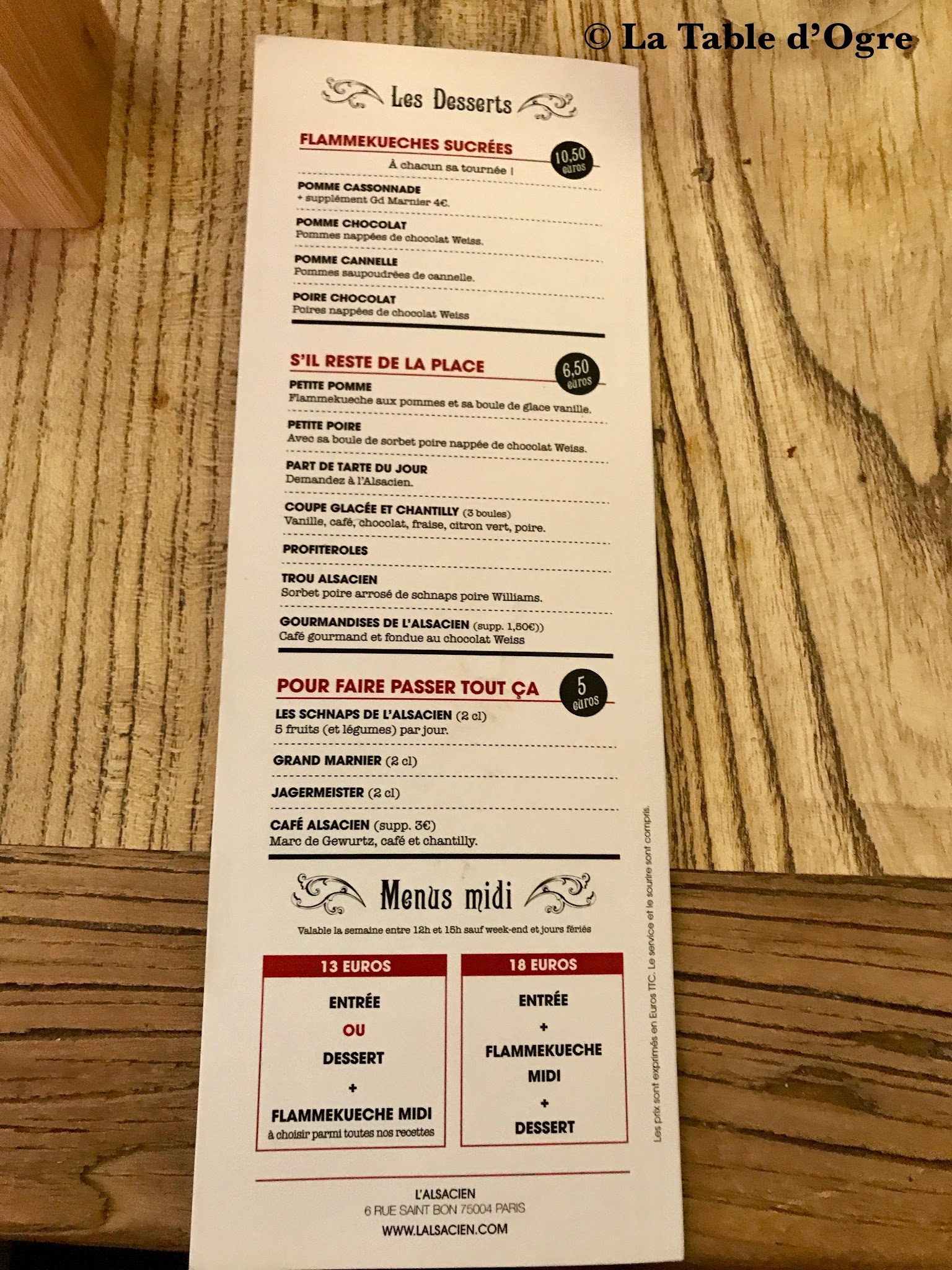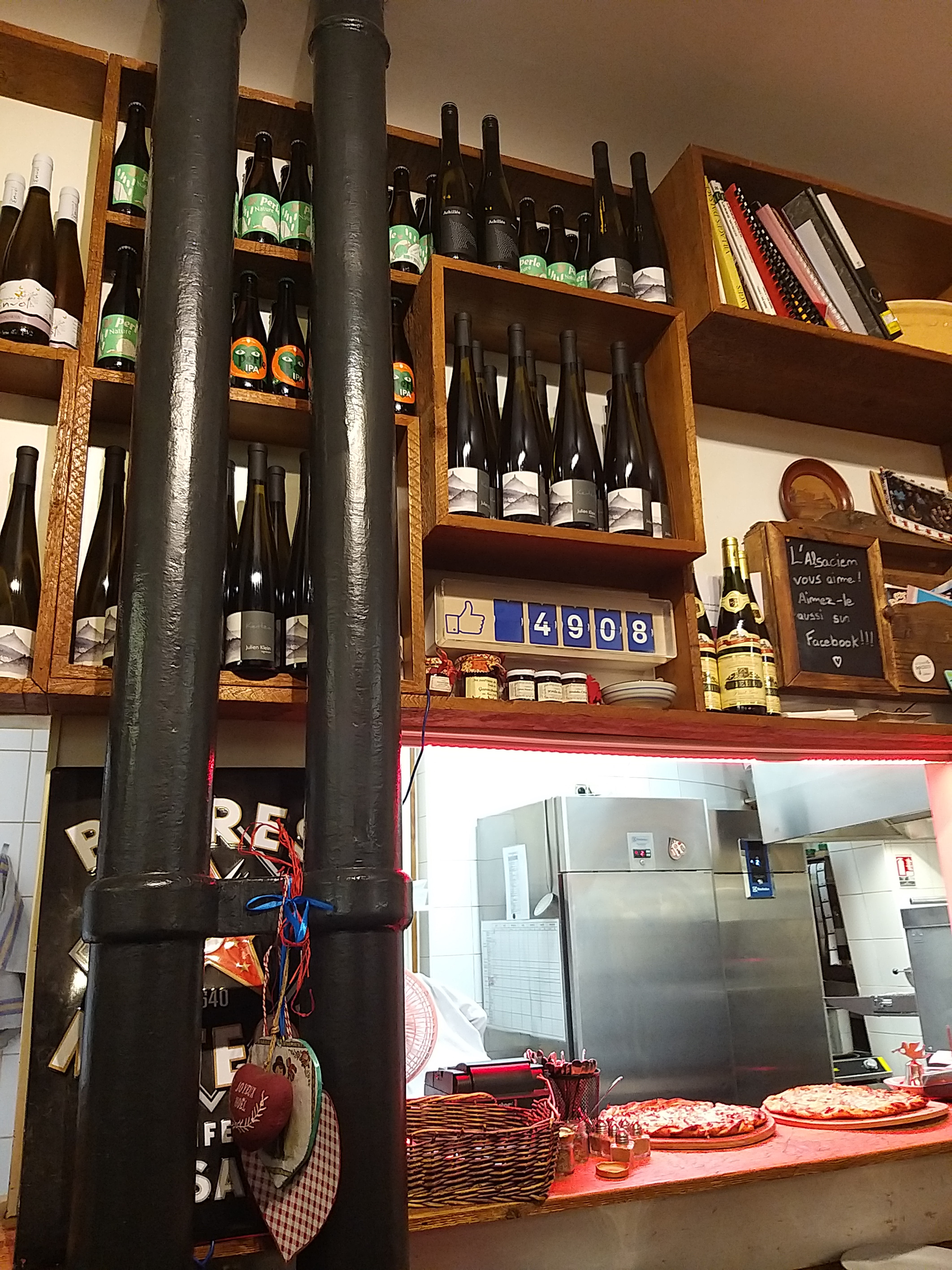 Par pitié, venez ici au lieu de franchir les portes de cette affreuse chaine vous proposant de soi-disants flammekueches alsaciennes, à la pâte industrielle (regardez le piquage en dessous) et à la garniture anémique. Evidemment, c’est moins grand, mais c’est plus convivial, sympathique et traditionnel. Evidemment, on cède un peu à la modernité en déclinaison Auvergne ou crevettes. Mais tant qu’ils ne nous sortent pas la Hawaïenne avec ananas et poulet sauce barbecue, ça va ! Je viens ici une fois par mois pour retrouver quelques Alsaciens et Lorrains (nous en sommes pas racistes !) pour discuter de la pluie et du beau temps et dire des méchantes choses sur les « Français de l’intérieur » ! Blague mise à part, n’hésitez pas, si vous avez le passeport idoine, à nous rejoindre tous les seconds mardis de chaque mois vers 12 heures 30. Vous serez généreusement accueillis. Bonne sélection de vins, sourire constant, que demander de plus ? Addition de 194,50 euros pour 8. Sans se priver !