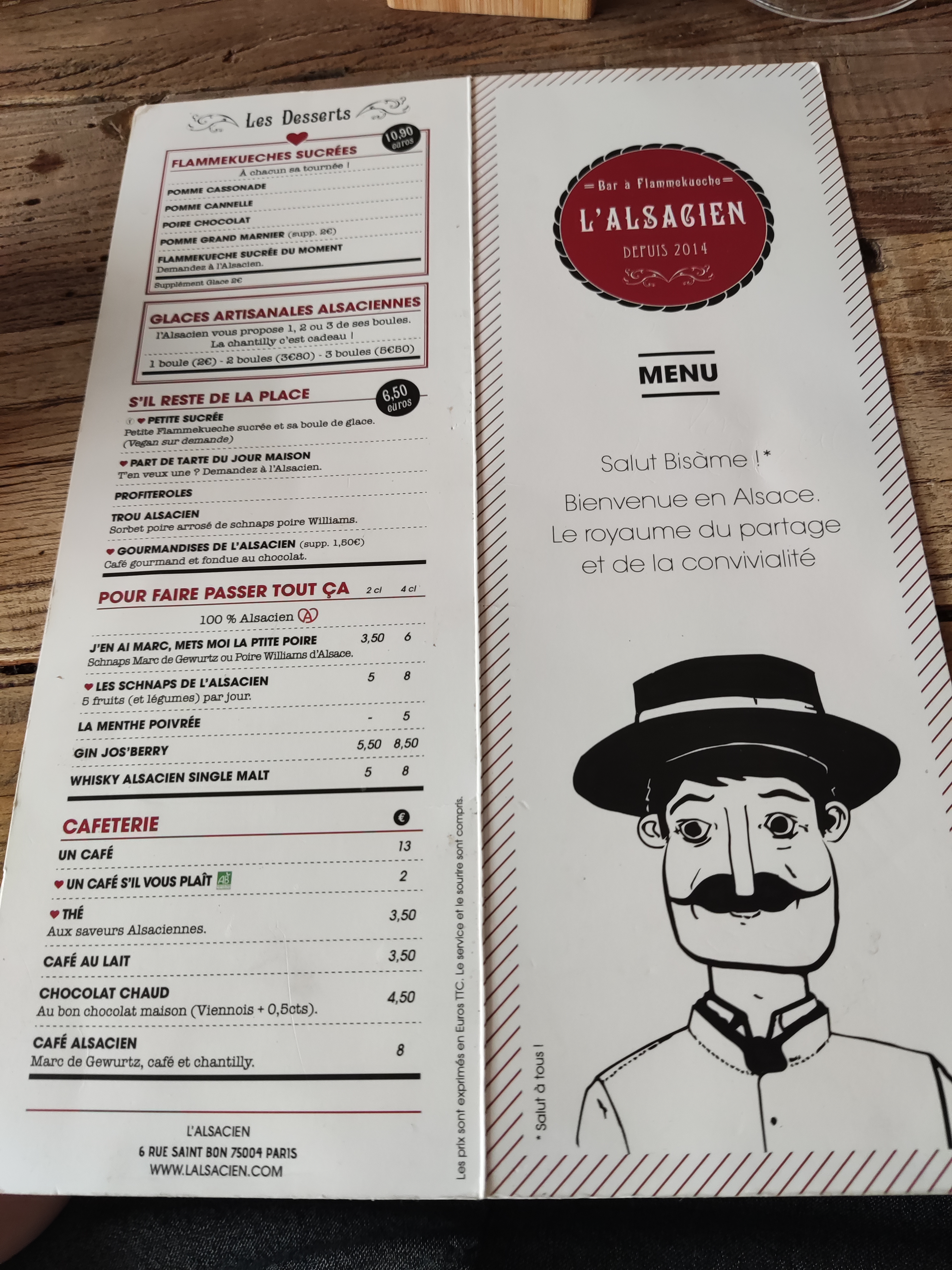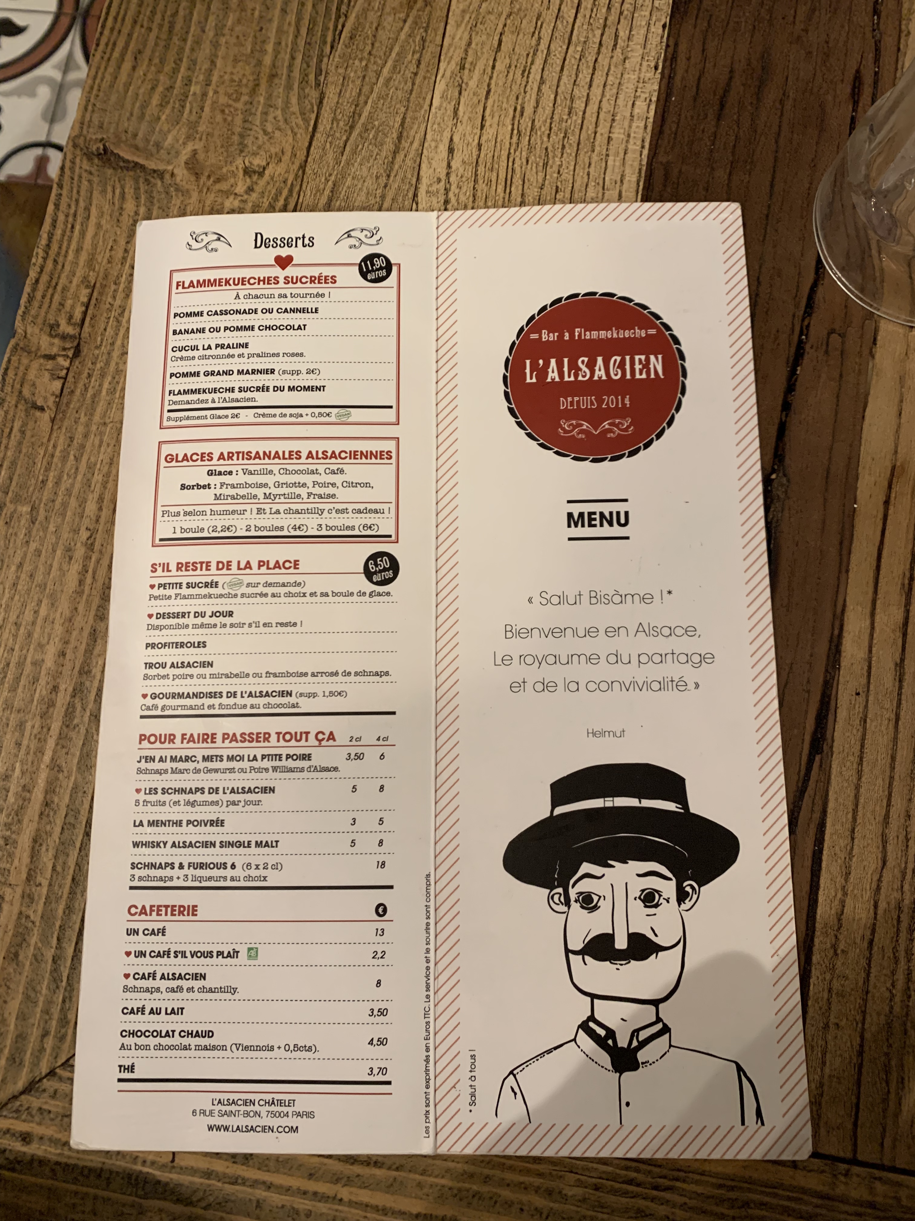 Cher jerome H , C'est toujours un grand plaisir pour nous de lire que nos clients rentrent chez eux avec de si bons souvenirs et nous vous remercions pour le temps que vous avez consacré à partager votre expérience personnelle avec nous et les usagers du site. Nous sommes encore plus heureux de voir que vous avez apprécié nos spécialités alsaciennes ! On espère vous revoir bientôt pour partager des planches de charcuterie ensemble ! L'Alsacien Châtelet , on y est bien, on y revient. Bisous et Flammekueche