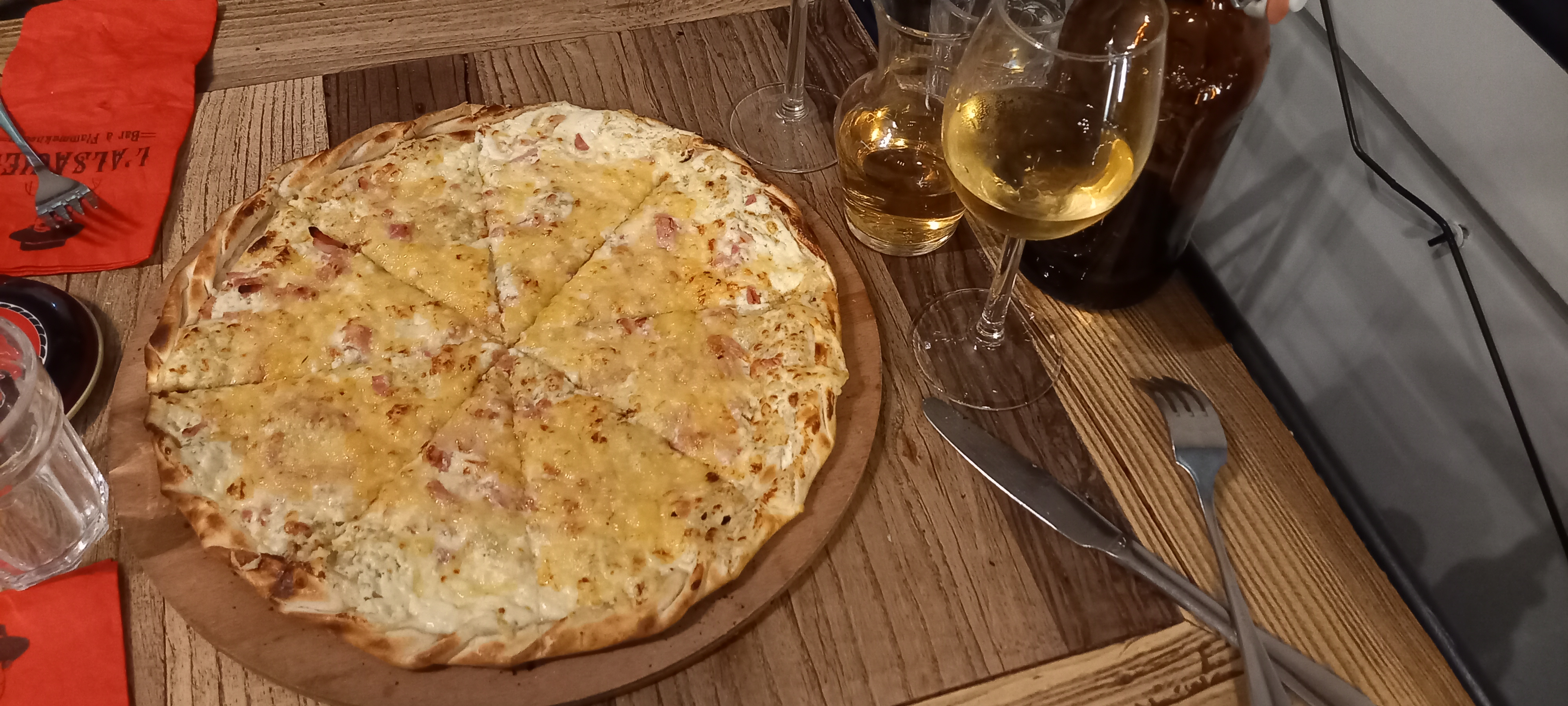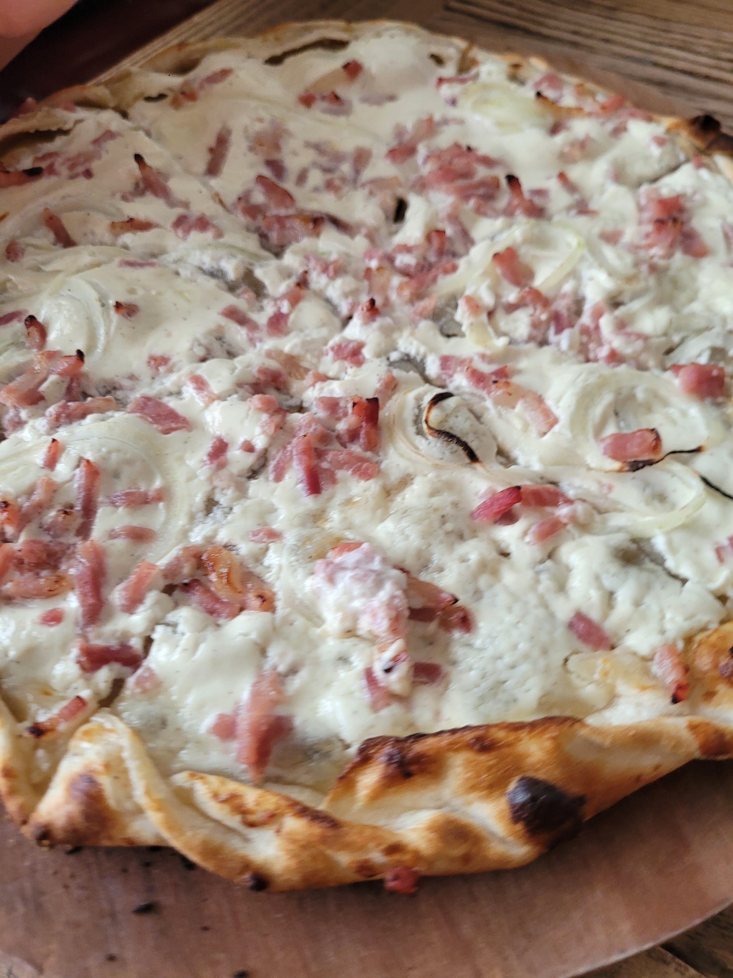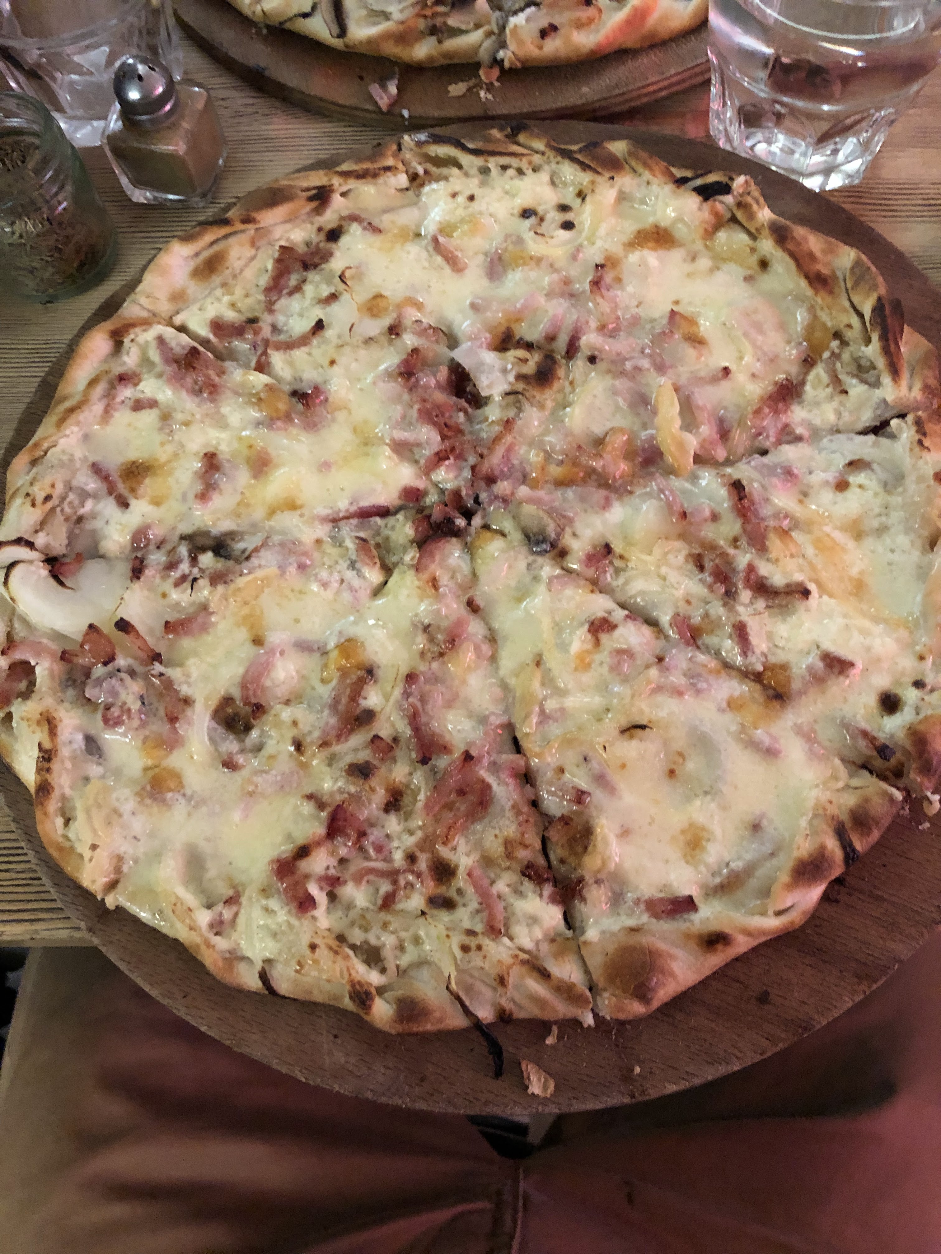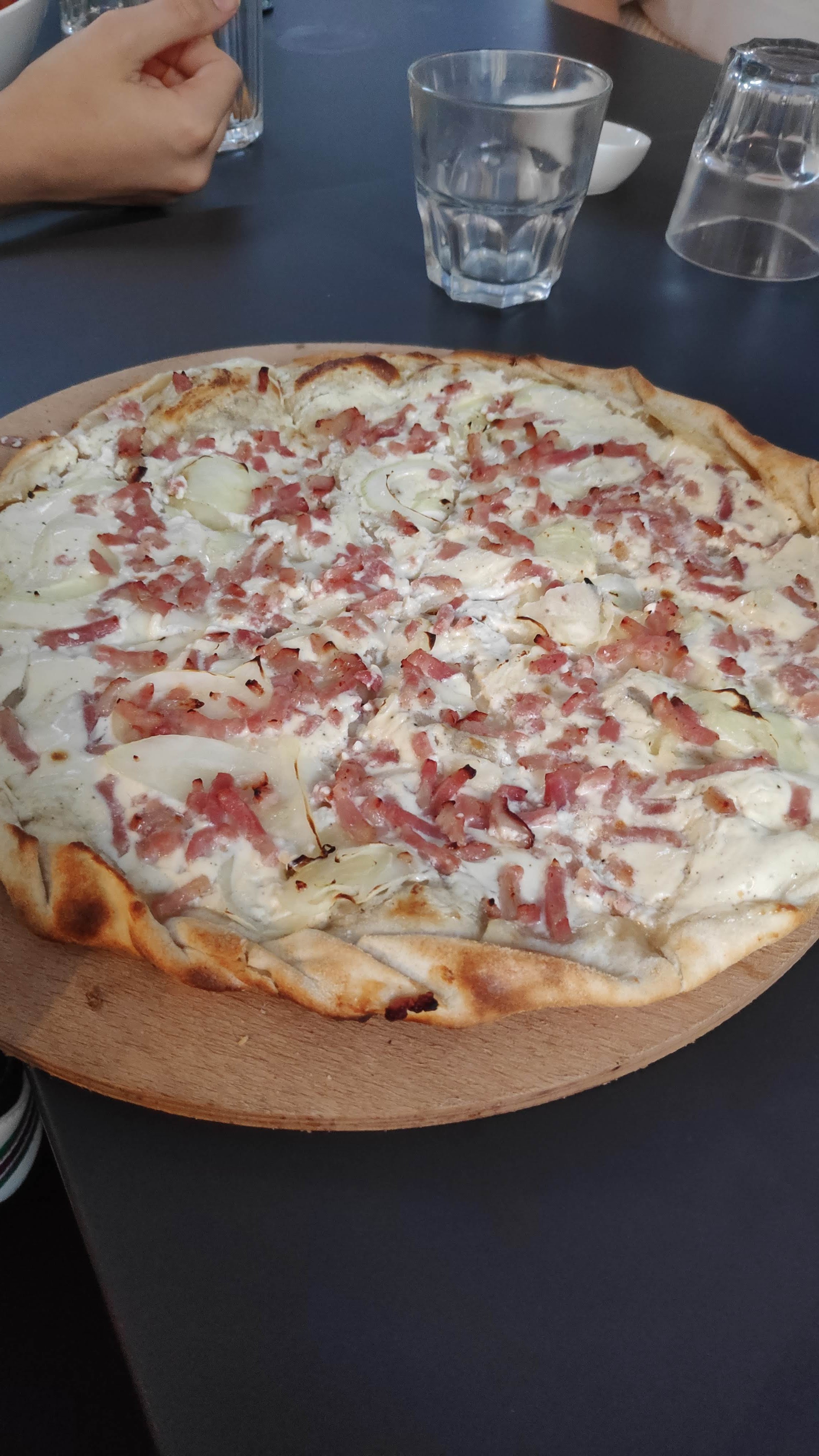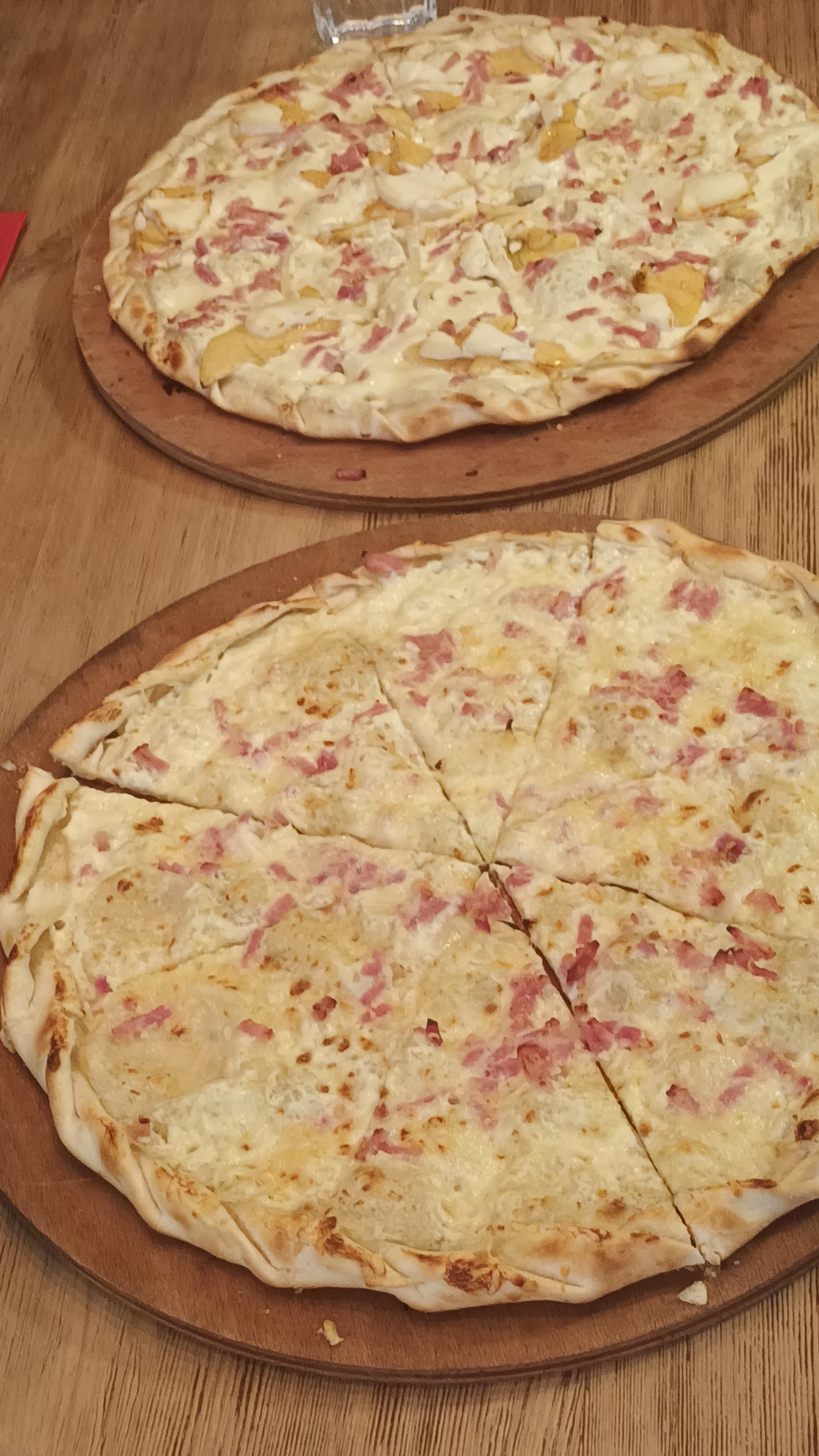 Flamekuches délicieuses, bien garnies. Attention à avoir en tête, pour les flamekuches il faut se lever aller les chercher au comptoir
