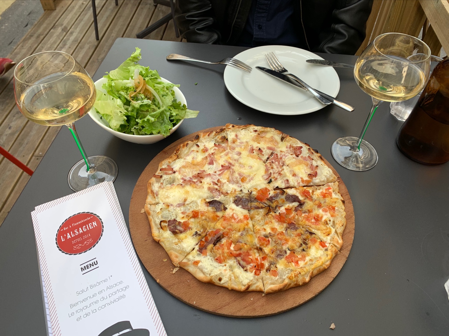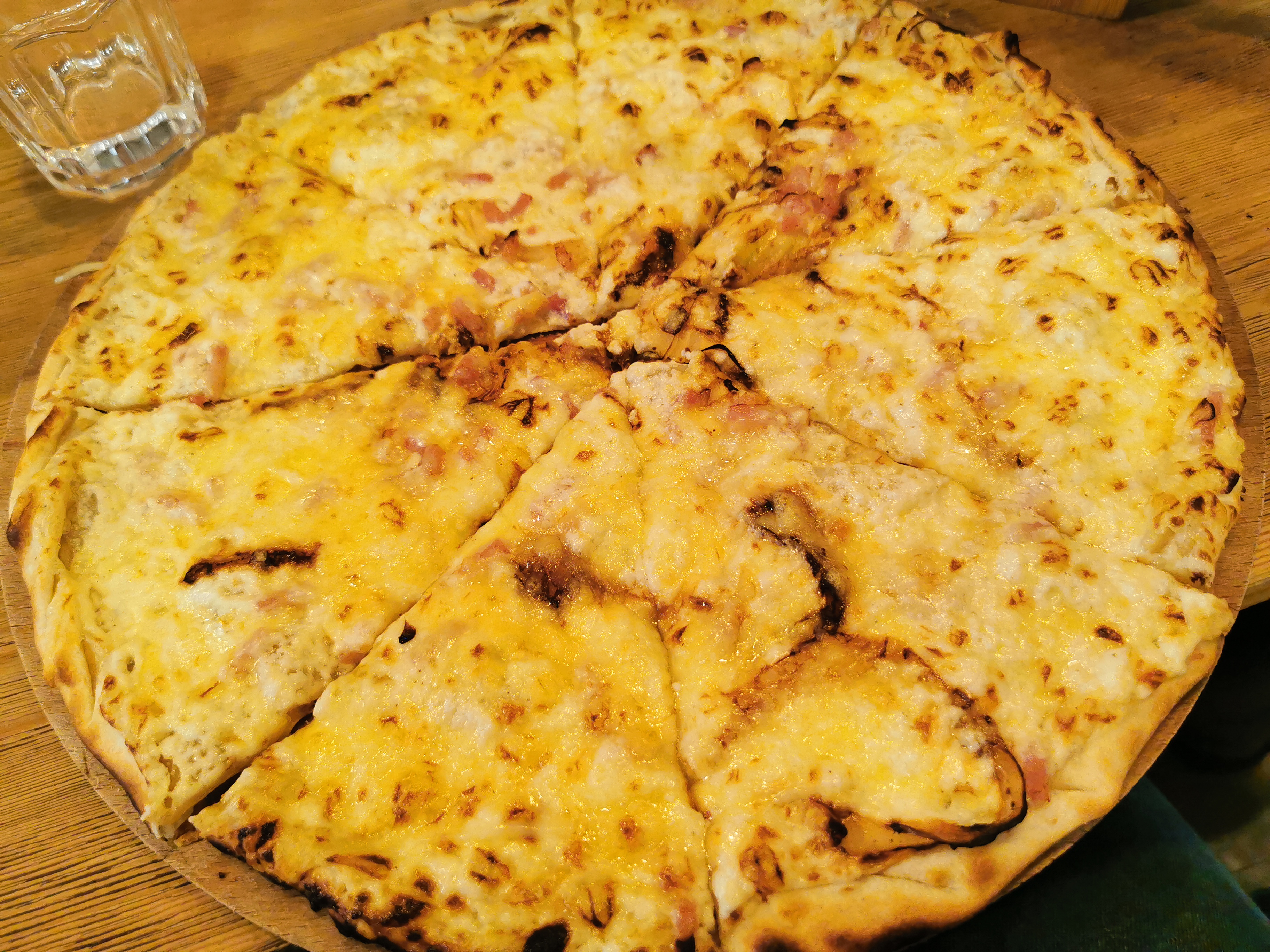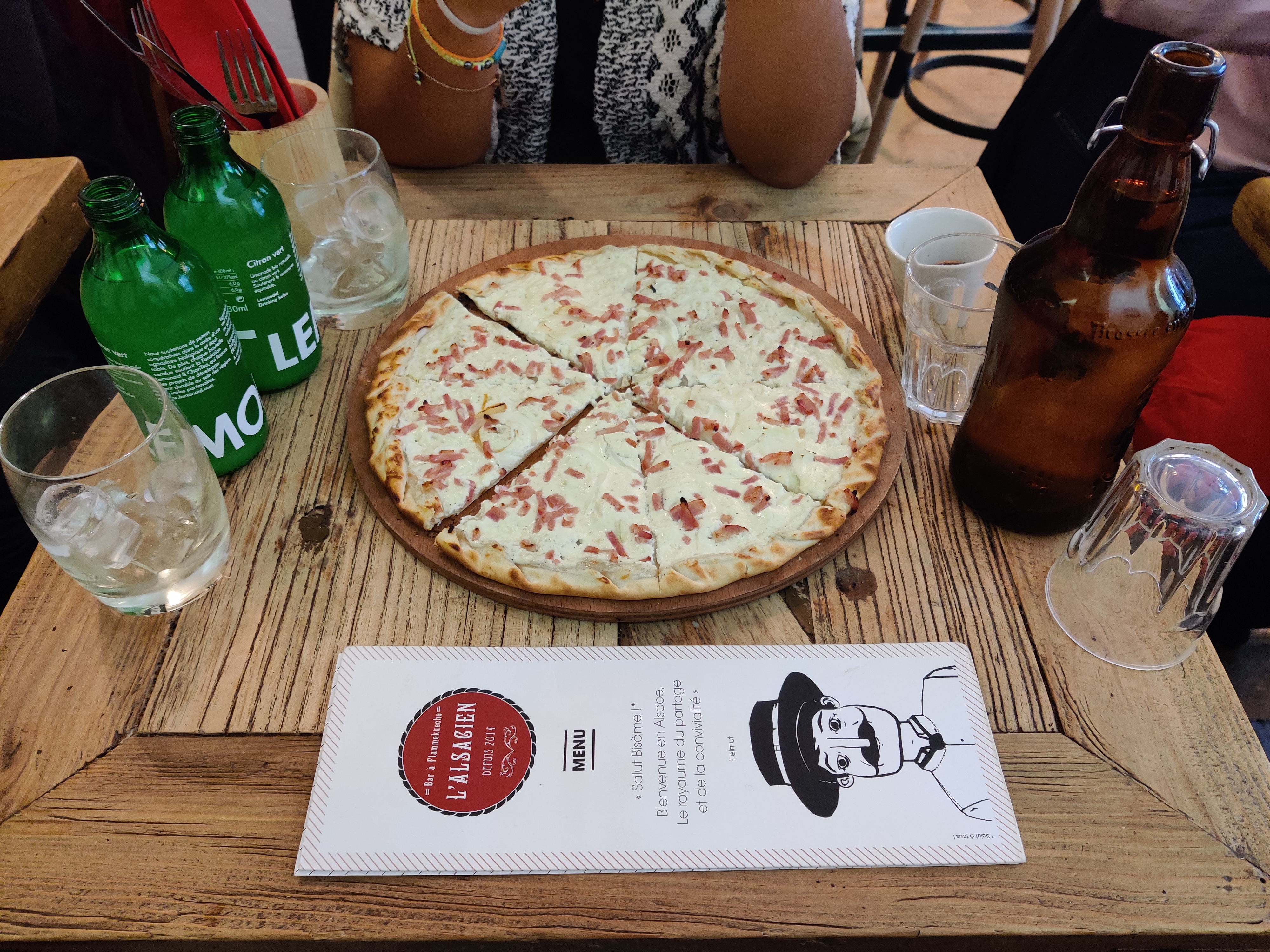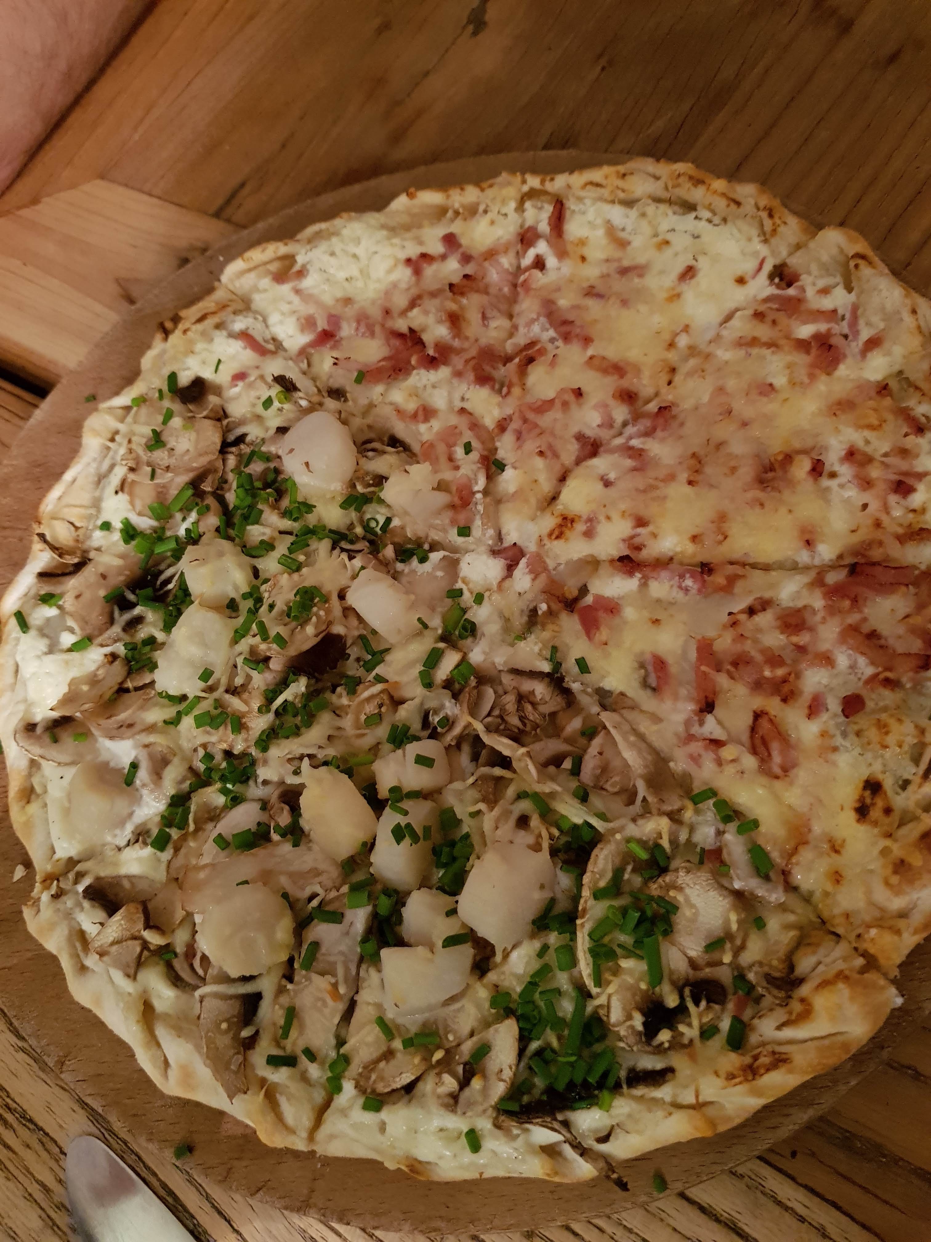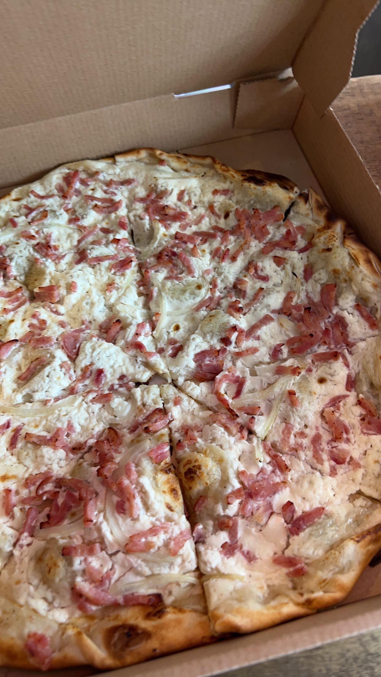 Flamekuches délicieuses, bien garnies. Attention à avoir en tête, pour les flamekuches il faut se lever aller les chercher au comptoir