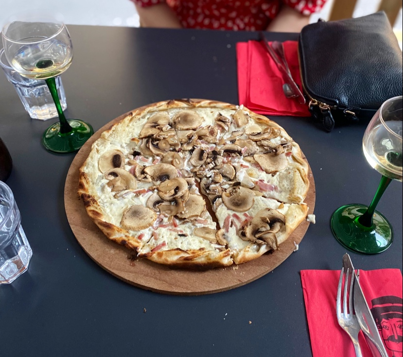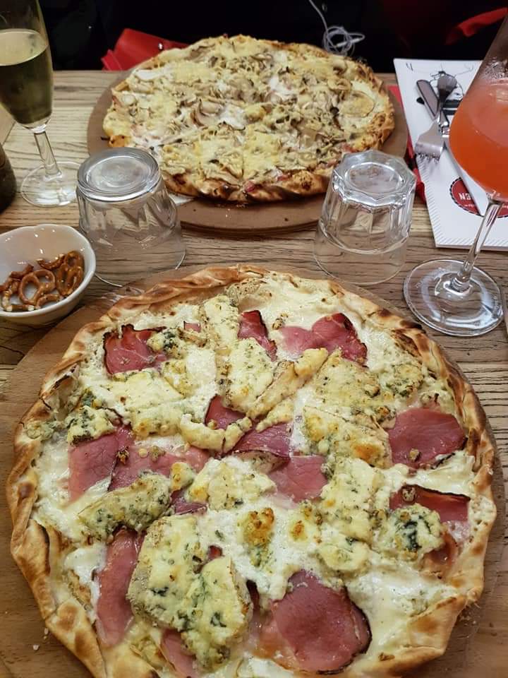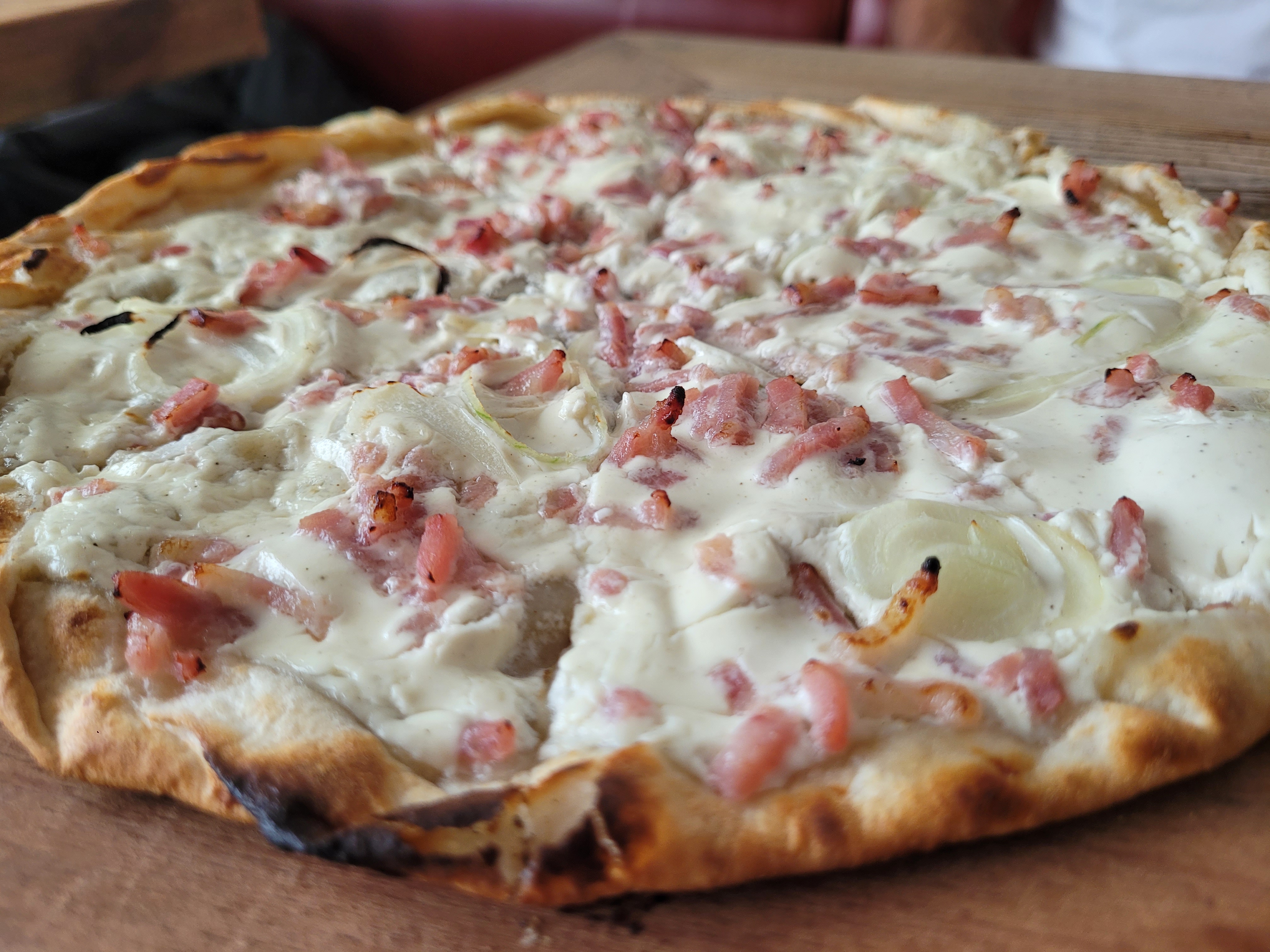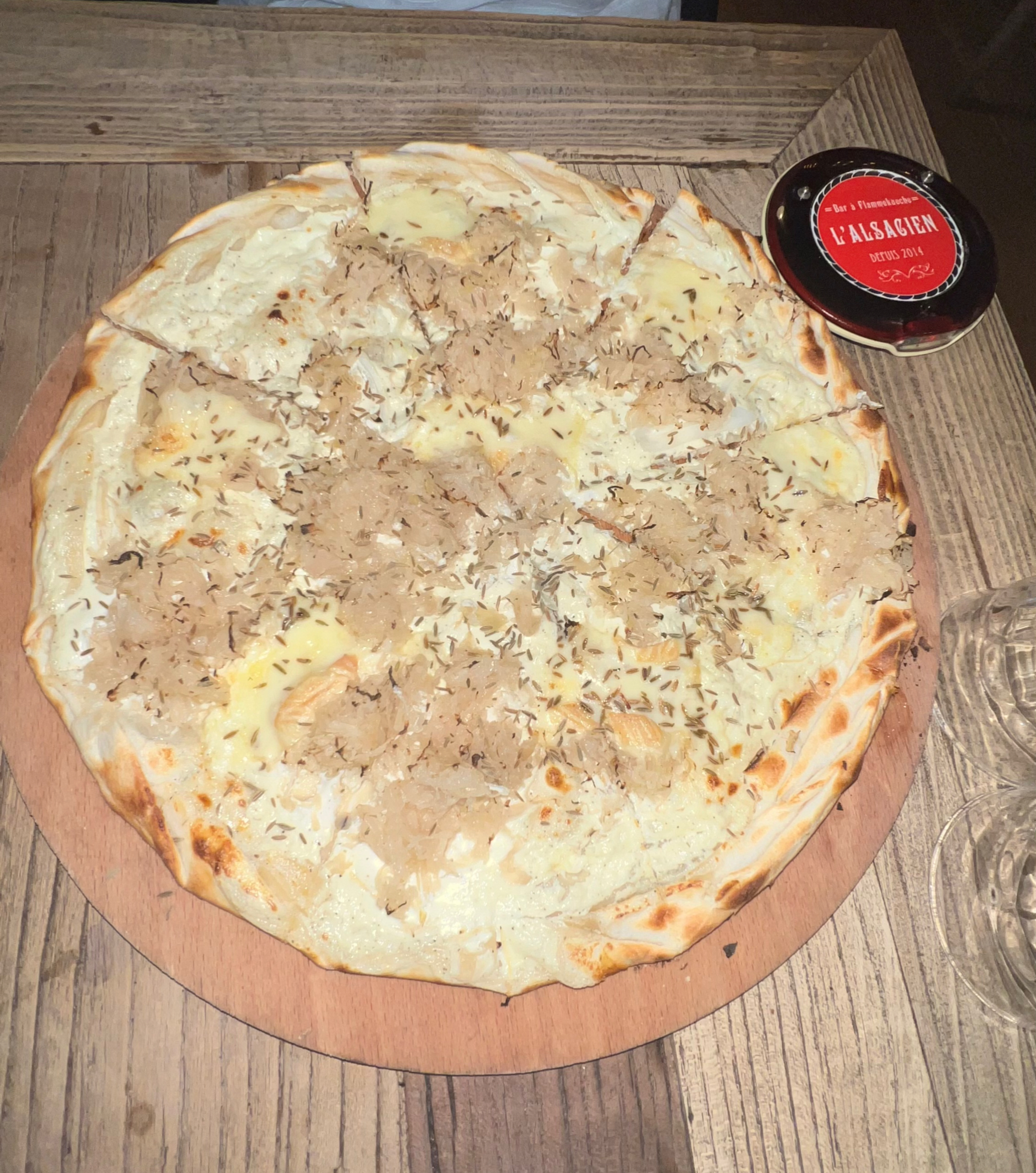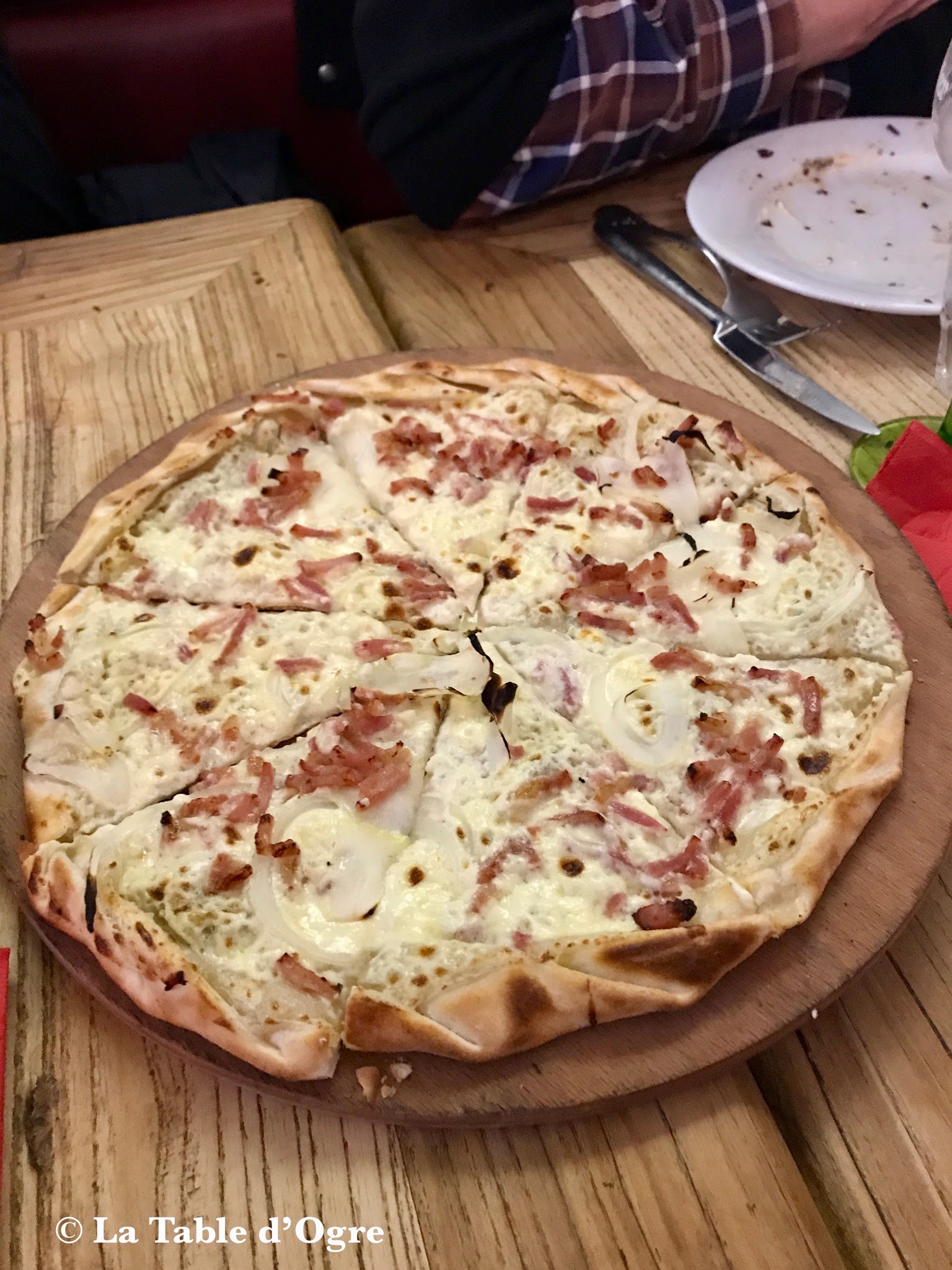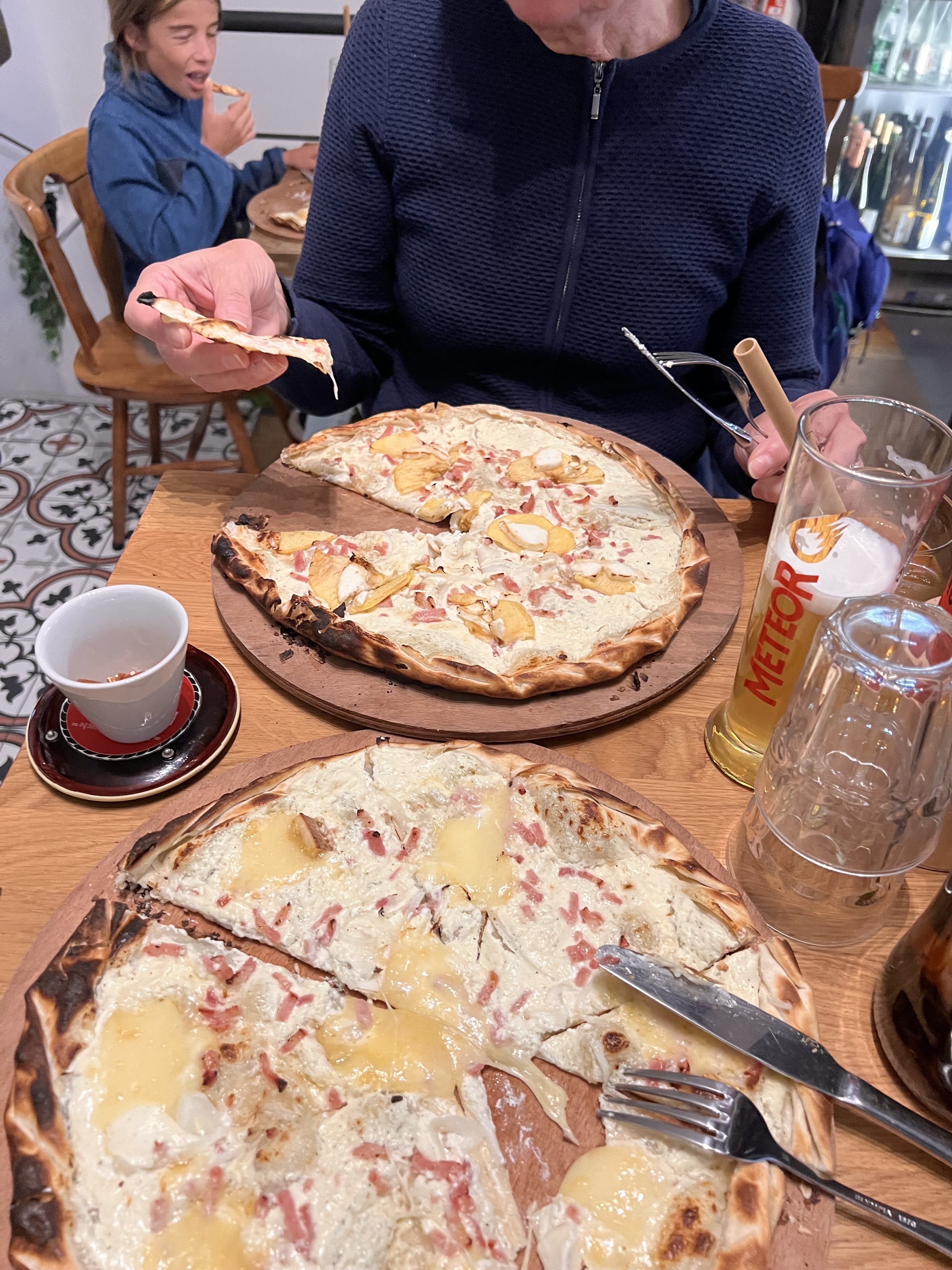 Flamekuches délicieuses, bien garnies. Attention à avoir en tête, pour les flamekuches il faut se lever aller les chercher au comptoir