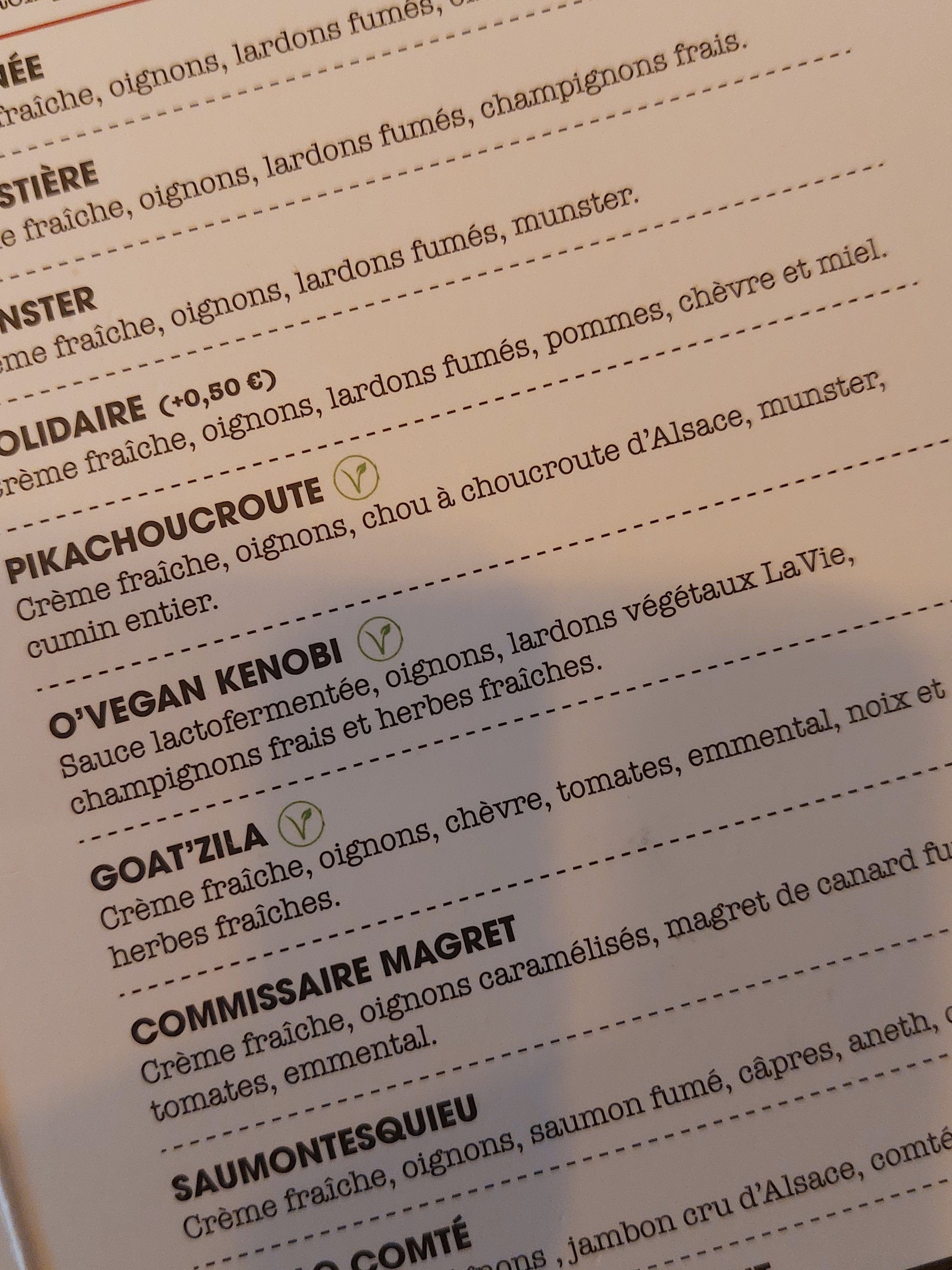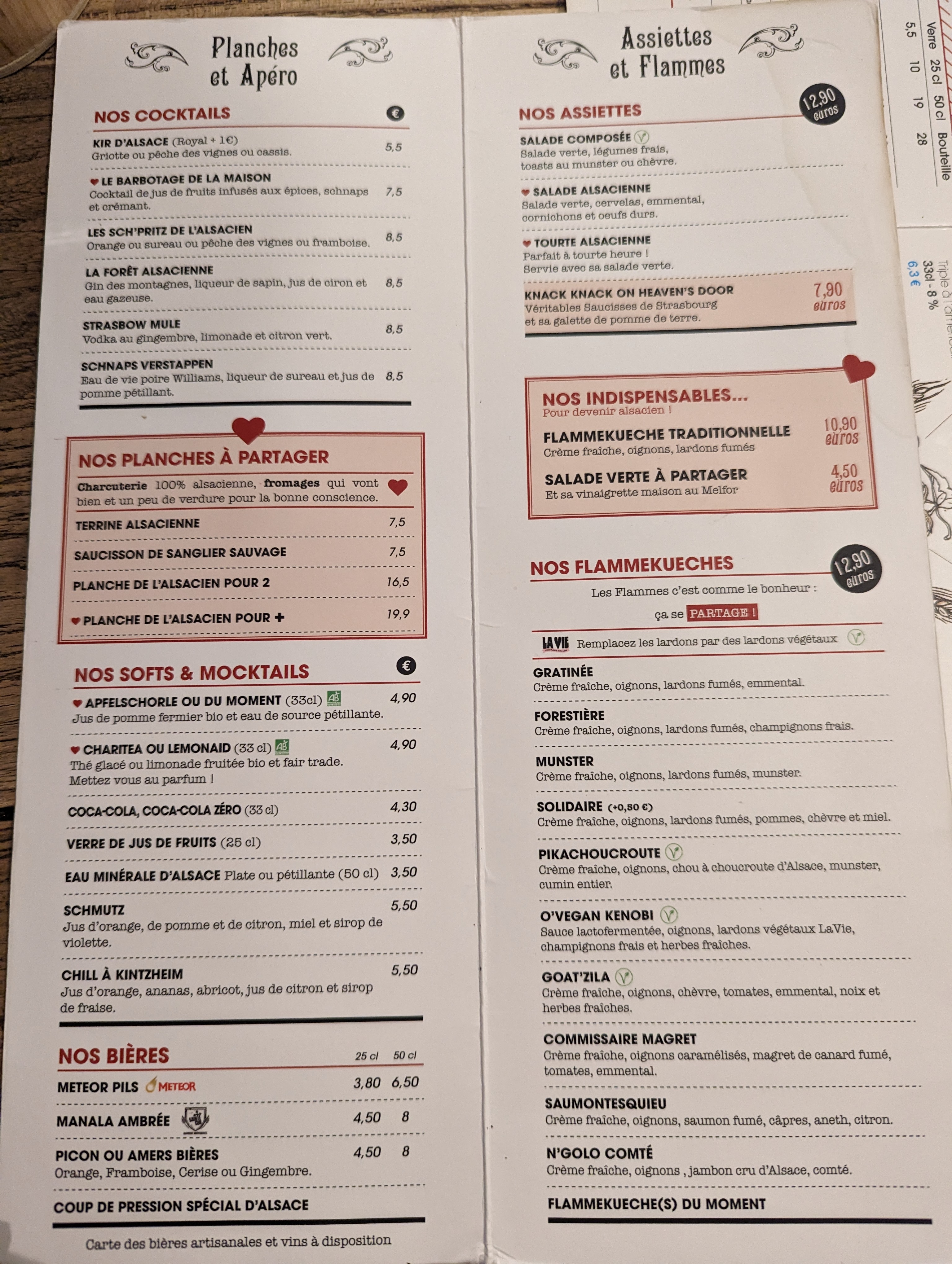 Cher Aliz, Nous vous remercions d'avoir pris le temps de partager votre opinion et nous sommes heureux d'apprendre que nos Flammekueches vous ont plu ! Concernant la diversité de nos Flammekueches, nous disposons d’une dizaine de variétés sur notre carte et de nouvelles Flammes du moment adaptées avec les produits de saison. Dommage que vous n’ayez pas trouvé complètement votre bonheur. Nous espérons avoir le plaisir de vous revoir très vite chez nous. Bisous et Flammekueches