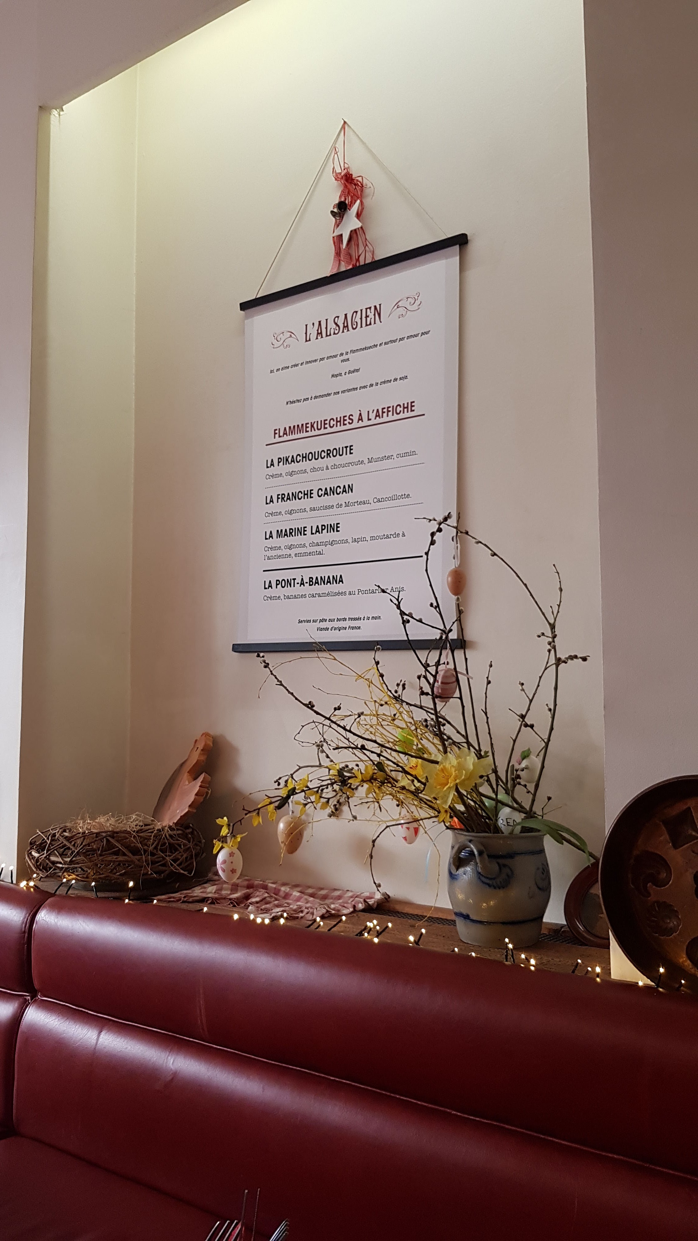 Restaurant qui sert des flammkuche dans la plus belle tradition alsacienne, le tout accompagné par une grande diversité de vins régionaux. Le cadre est propre, propice à la détente et au voyage gustatif. Le personnel est dynamique, souriant et très gentil. Une adresse à ne pas manquer, que ce soit pour manger à deux ou en petit groupe.