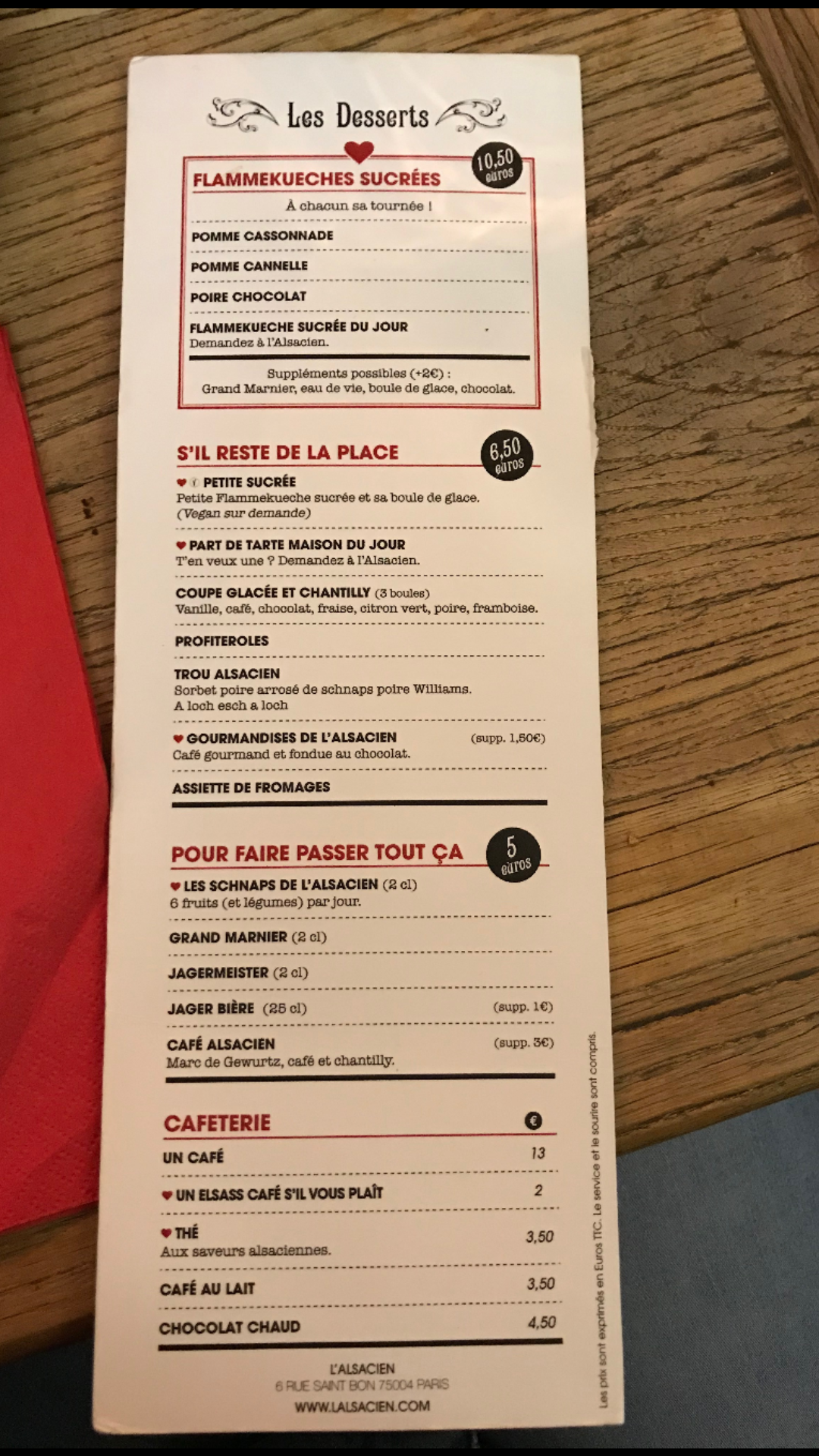 Uniquement des flammekuchen Pas de choucroute Resto bobo pour manger sur le pouce entre copains Ce n est pas un vrai resto alsacien avec l ensemble des spécialités de la région Les tables sont très proches les unes des autres Sympa jusqu'à 22 ans... Le personnel est adorable Impossible de se garer et non par dommage