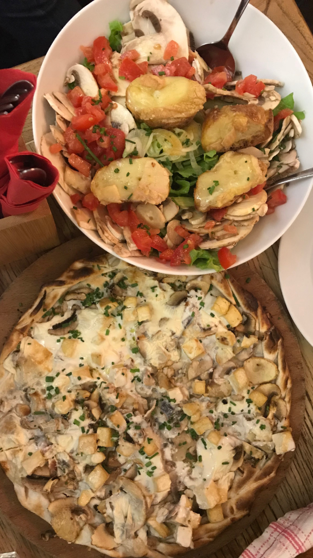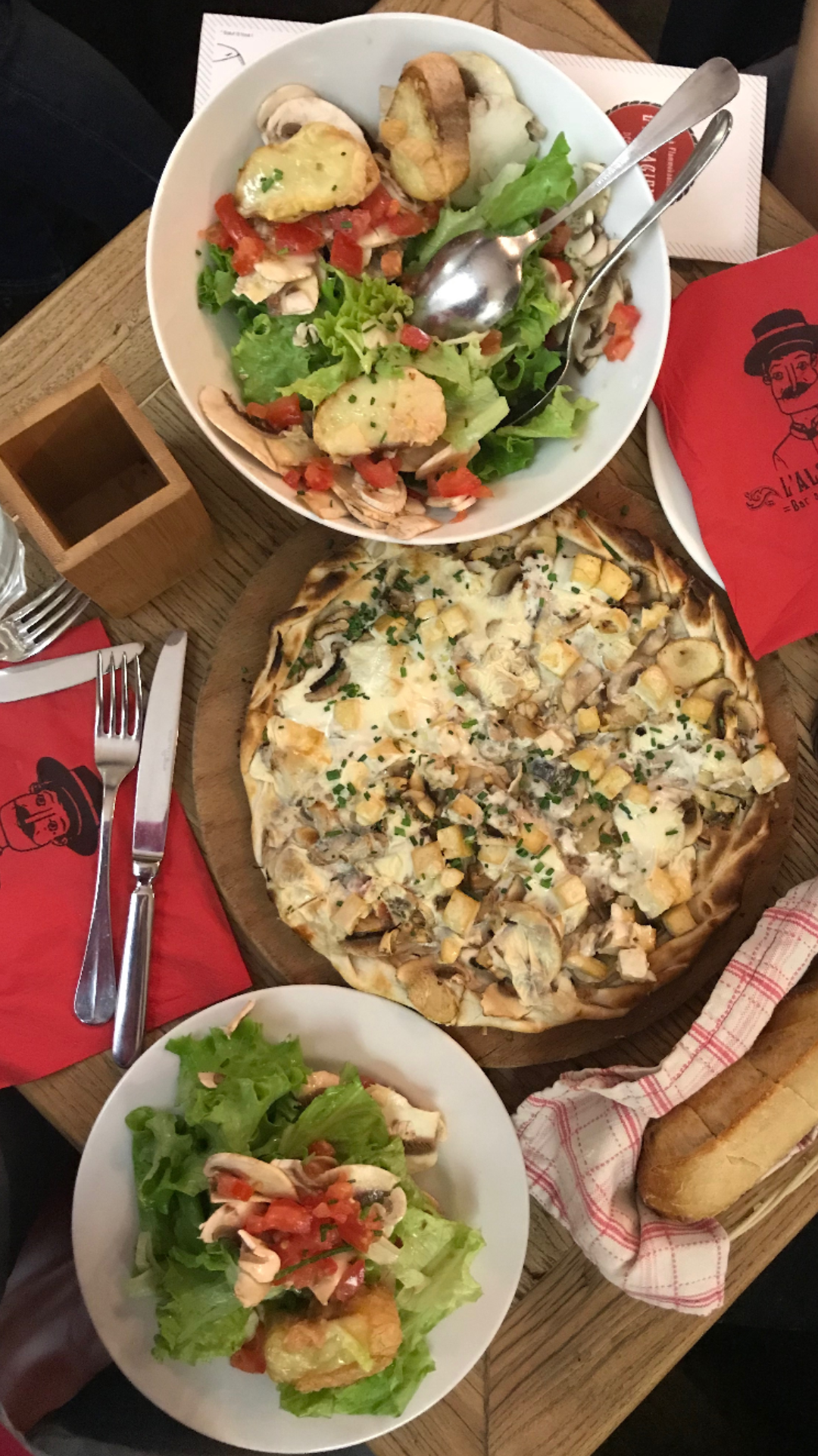 Bon flammekueche et salade. Le service était correct. Par contre, c'était un peu bruyant au resto.