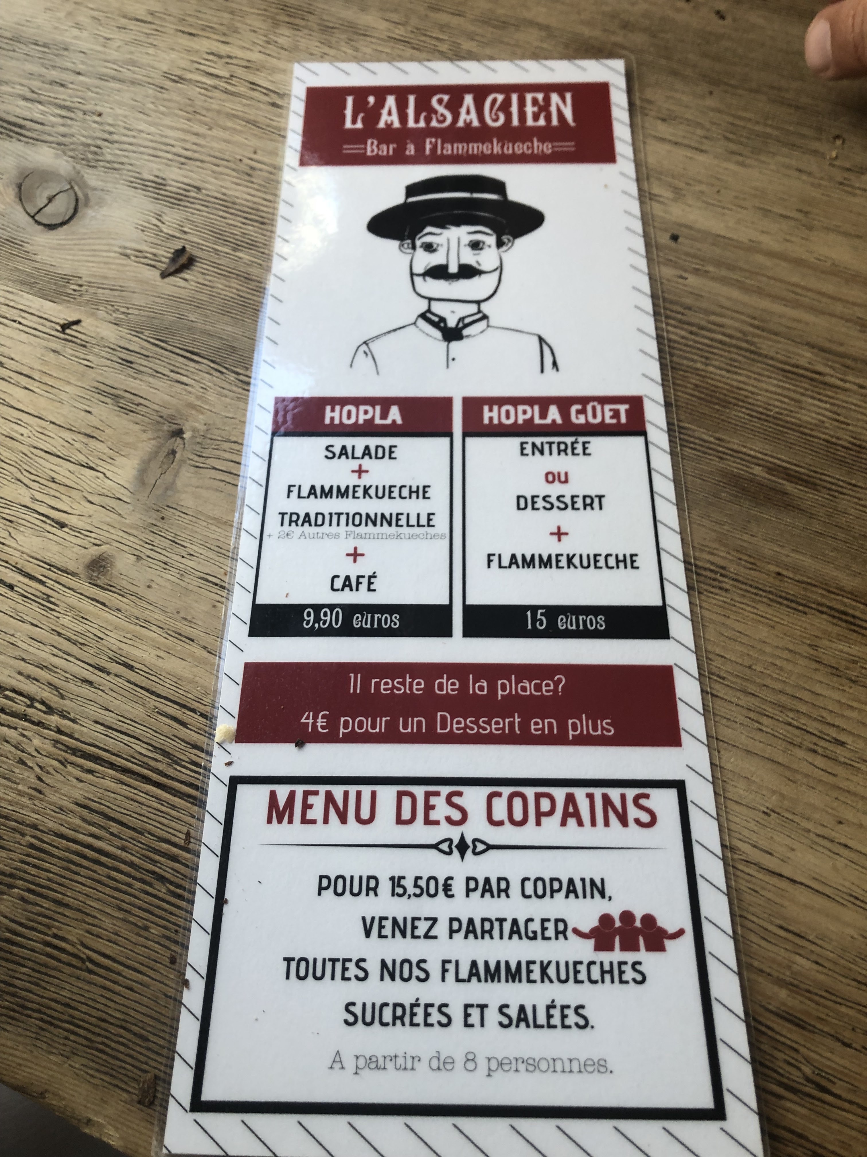 Super expérience, on est 8 et on a pris le menu copain à 17€ par personne. vraiment rentable pour tout ce qu'on a mangé. N'étant pas un grand fan du sucré, les flammekueches sucrées étaient ok mais les salés envoyaient du lourd surtout ceux gratinés au bon fromages. Serveuse adorable et à l'écoute et très bonne ambiance dans le restaurant. Je vous conseille vivement si vous êtes un large groupe de potes (entre 8 et 12 personnes, au-delà vous serez un peu serré je pense).