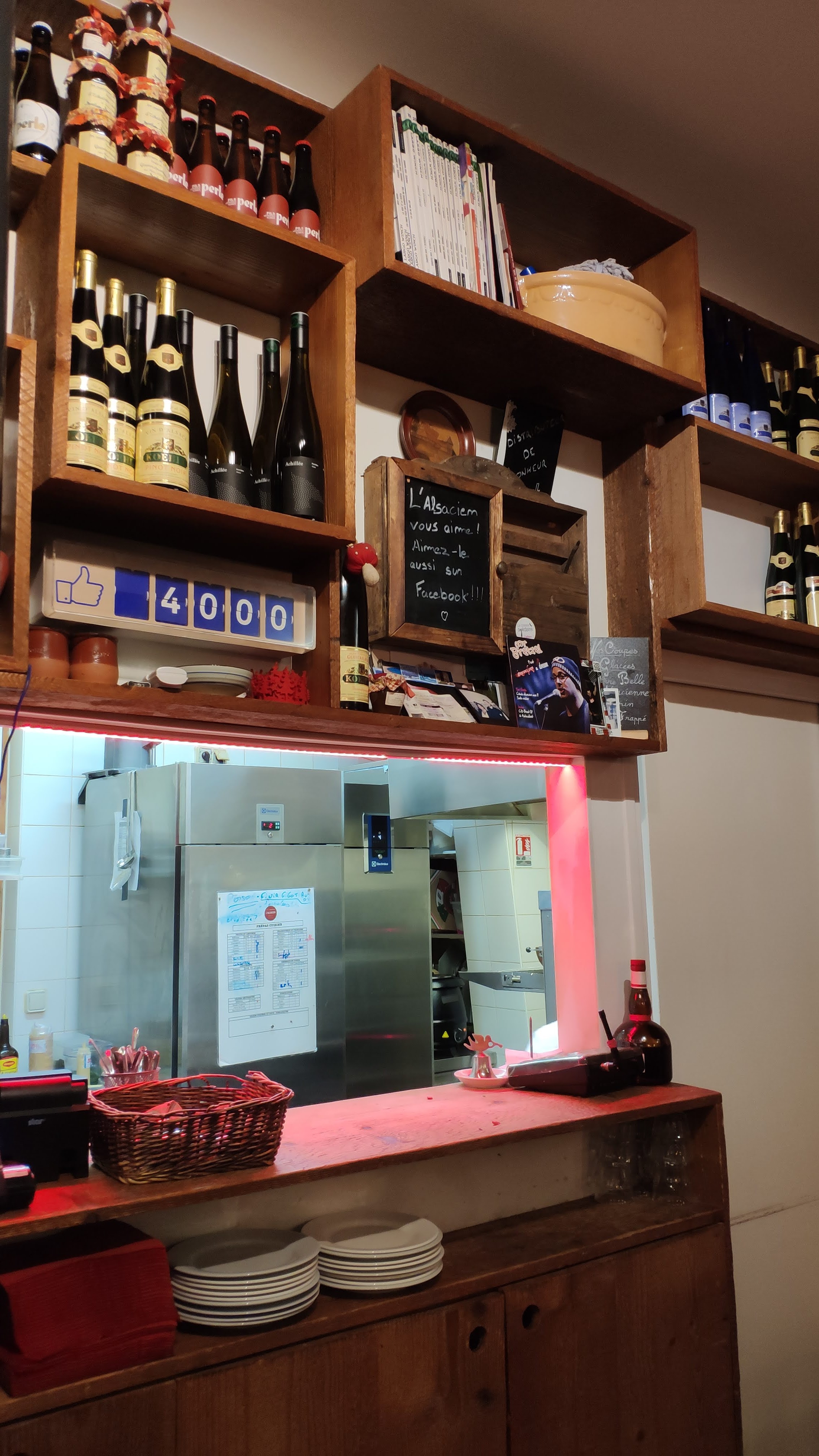 Accueil sympathique, nous nous sommes sentis tout de suite à l'aise. Les inconditionnels de vins Alsacien ont trouvé le Riesling et Gewurztraminer à leur goût et les Flammekueches étaient excellentes. Nous étions sept à table ce qui nous a permis de pouvoir les goûter toutes. Le chef a entendu que l'un d'entre nous fêtait son anniversaire et nous a fait la bougie surprise au dessert !... Nous recommandons l'endroit