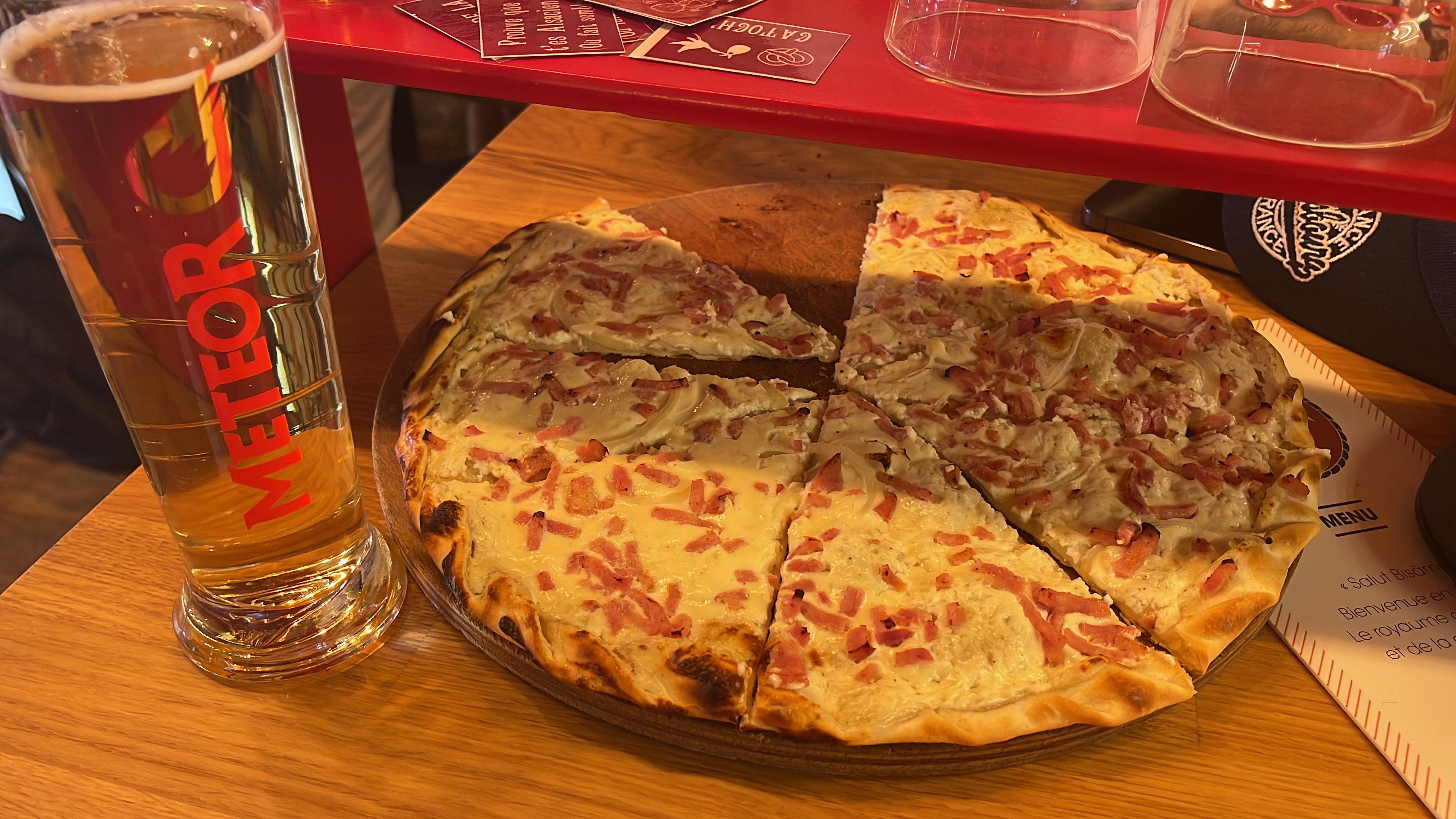 Très bonnes flammenkuches, copieuses. La bière blonde pression Meteor était très bonne. Le personnel est très sympathique et efficace. Nous avons passé un très agréable moment!