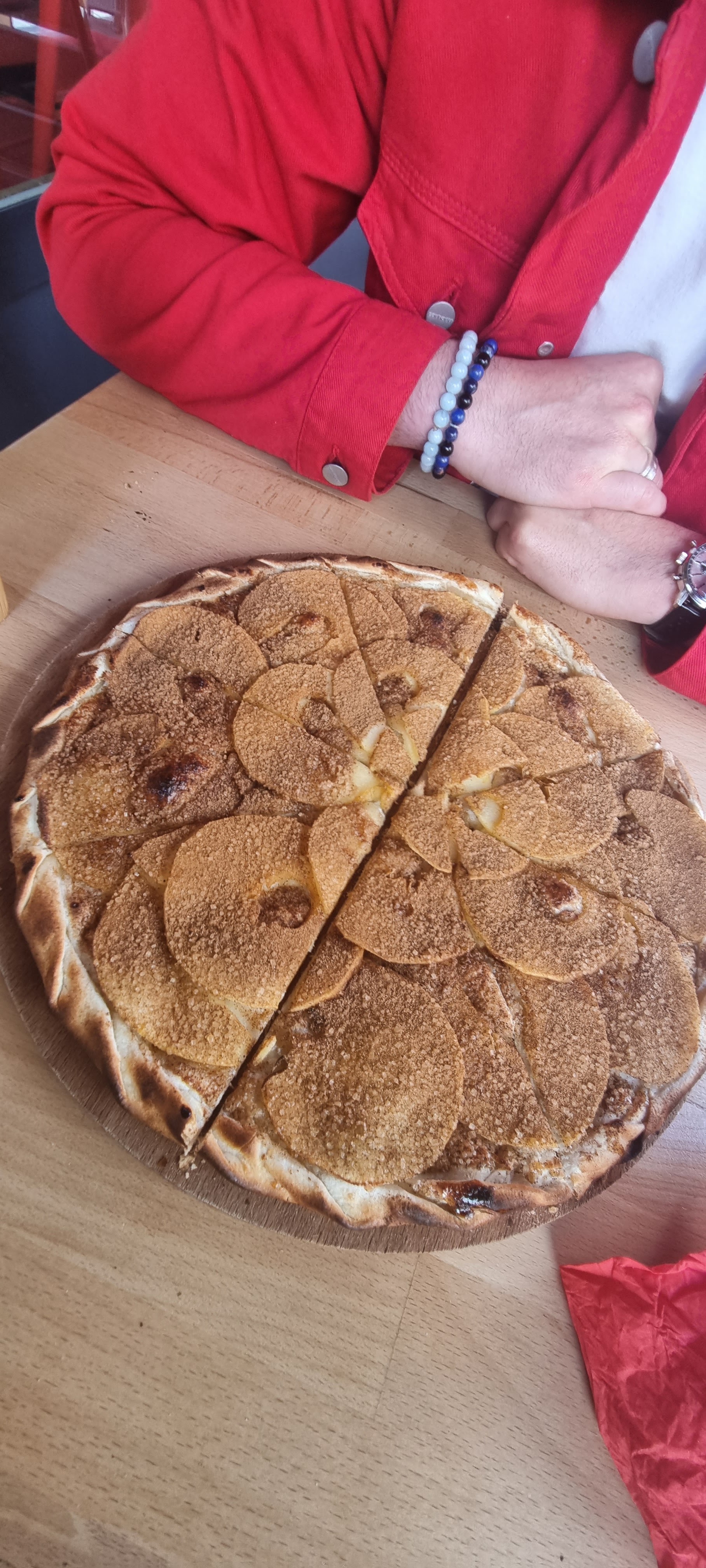 Personnel très sympa et accueillant ! Nous avons testé la formule groupe, ce qui nous a permis de goûter les différents flammekueches (sucrés et salés). Nous avons passé une soirée conviviale entre amis.