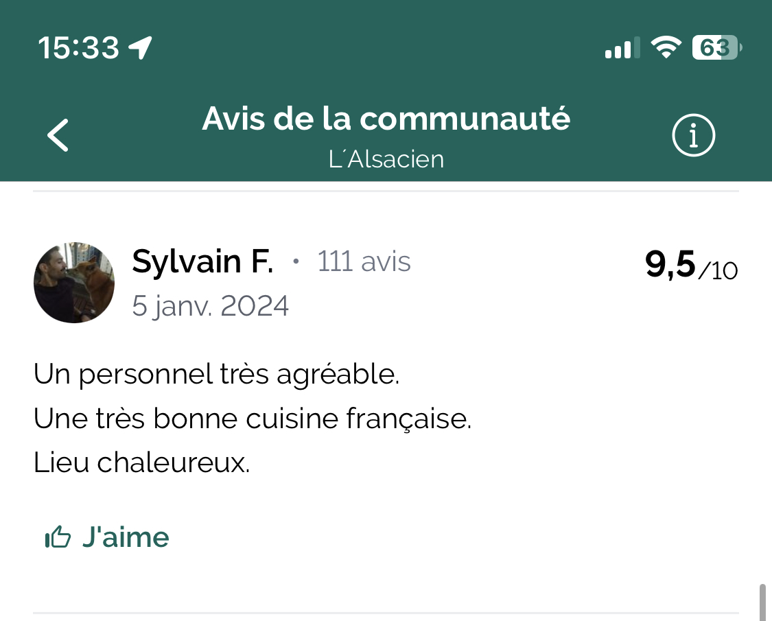 Bonjour Maelys Ferry Nous sommes ravis que vous ayez apprécié la cuisine faite maison de notre restaurant. Merci pour vos 5 étoiles et votre retour positif. Nous avons hâte de vous revoir pour déguster nos Flammekueches et profiter de notre happy hour. A bientôt près de République pour un délicieux super apéro en terrasse ☀️ L’équipe L'Alsacien République