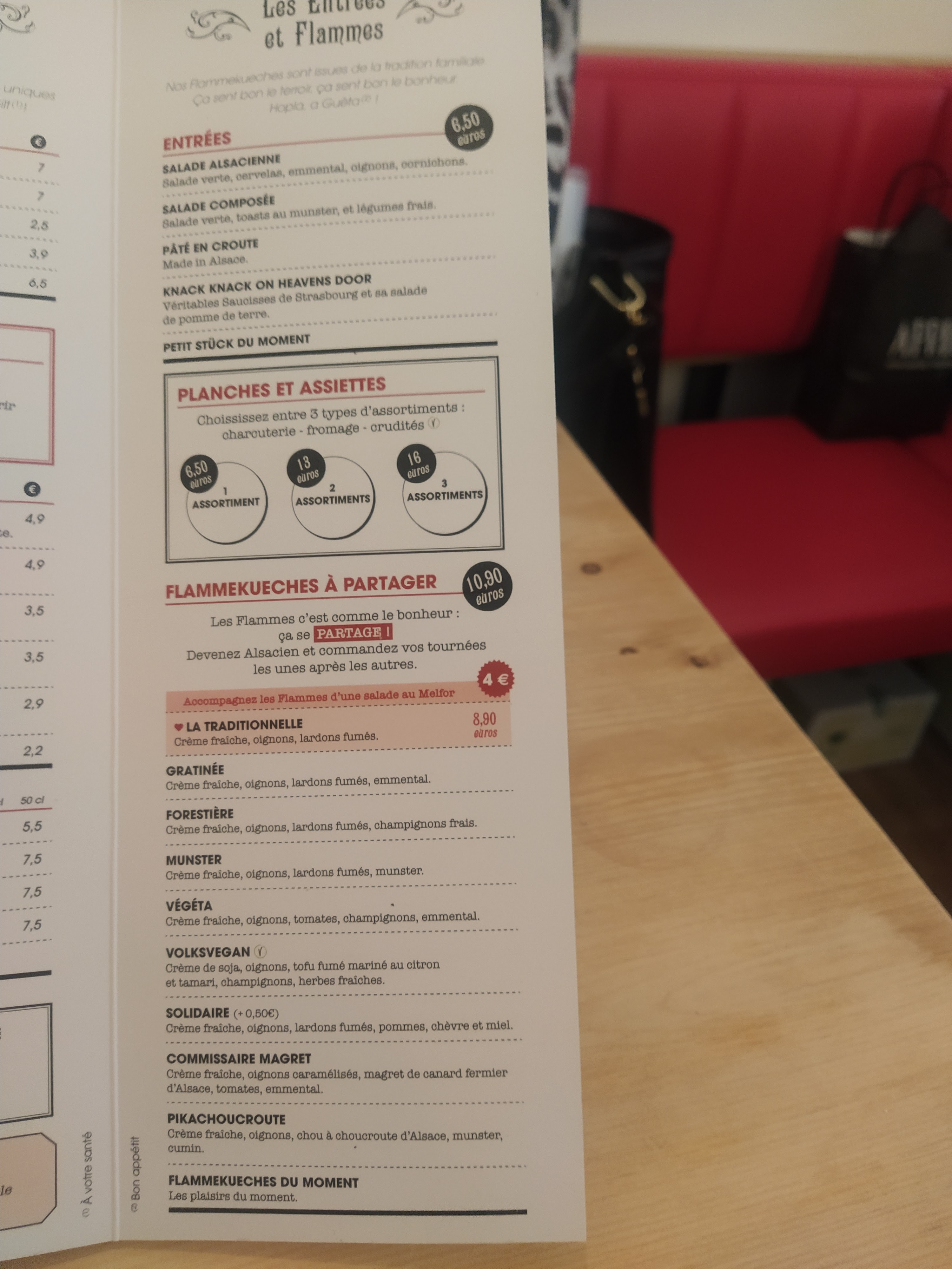 Superbe découverte. Très bonnes flam d'un goût fin et bcp de choix pour les végétariens. Demander car il y a deux autres flams vege qui ne sont pas à la carte. Très bons conseils sur les boissons et bières et cidre artisanaux. Je recommande fortement.