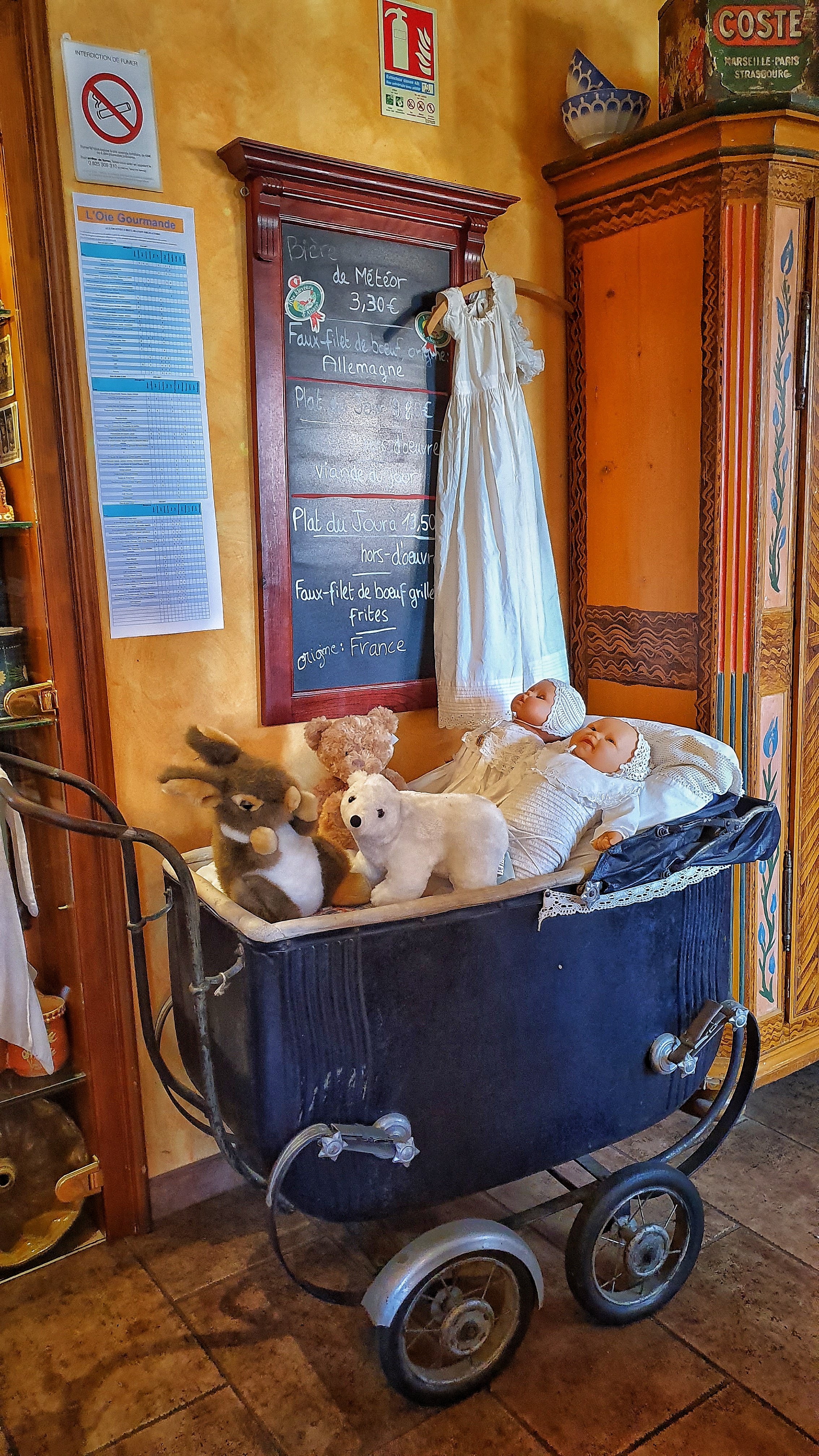 Décoration originale, on se croirait dans un musée alsacien ! Produits locaux jusque dans les boissons (elsass cola,thé glacé lisbeth...)